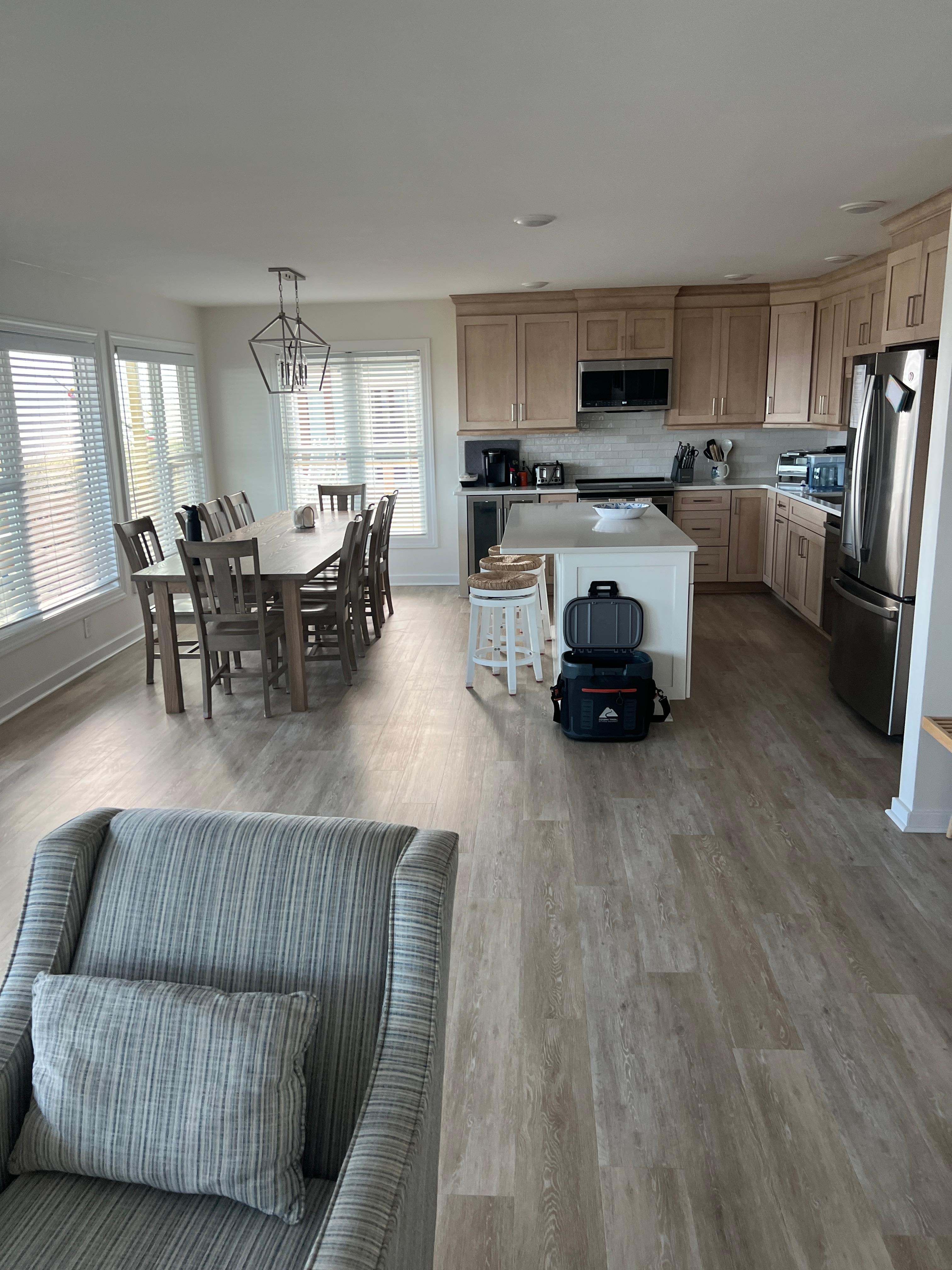First, I would like to thank the property owners for sharing their home with us. We LOVED this little gem! Pros: The VIEWS. There are windows across the entire back of the house for constant gorgeous ocean views. Close proximity to the beach with your own private boardwalk with outdoor spigot and shower. Upstairs and downstairs oceanfront balconies with rocking chairs. Beautiful oceanfront views including green vegetation and sand dunes. We even saw a herd of deer, in the sand dunes directly behind the house, during sunrise one morning, and they were so beautiful. Comfortable furniture for relaxing and spending time with family or watching TV. A spacious kitchen with plenty of counter space plus an island. The kitchen is stocked with all the pots, pans, silverware and cooking utensils you will need. A dishwasher. A long table for family style seating. Large capacity washer and dryer. PLENTY of linens available. Extra blankets available in the closets. Separate climate control for upstairs and downstairs. Cons: No grilling allowed. No garbage disposal. I would rate the internet speed as moderate, and the TV would frequently freeze during streaming. There is Tubi on the TV, but no local channels or sports channels.