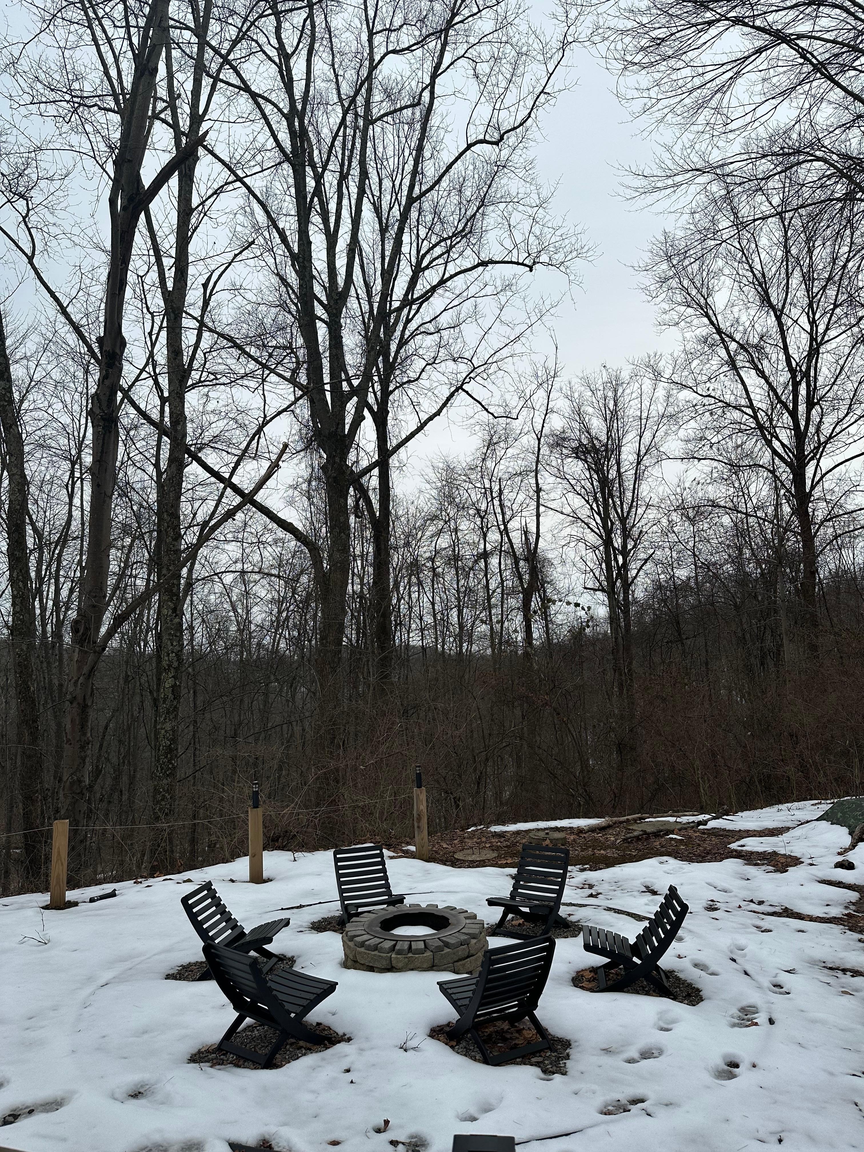 Evenings by the fire pit with seating and peaceful wooded surroundings