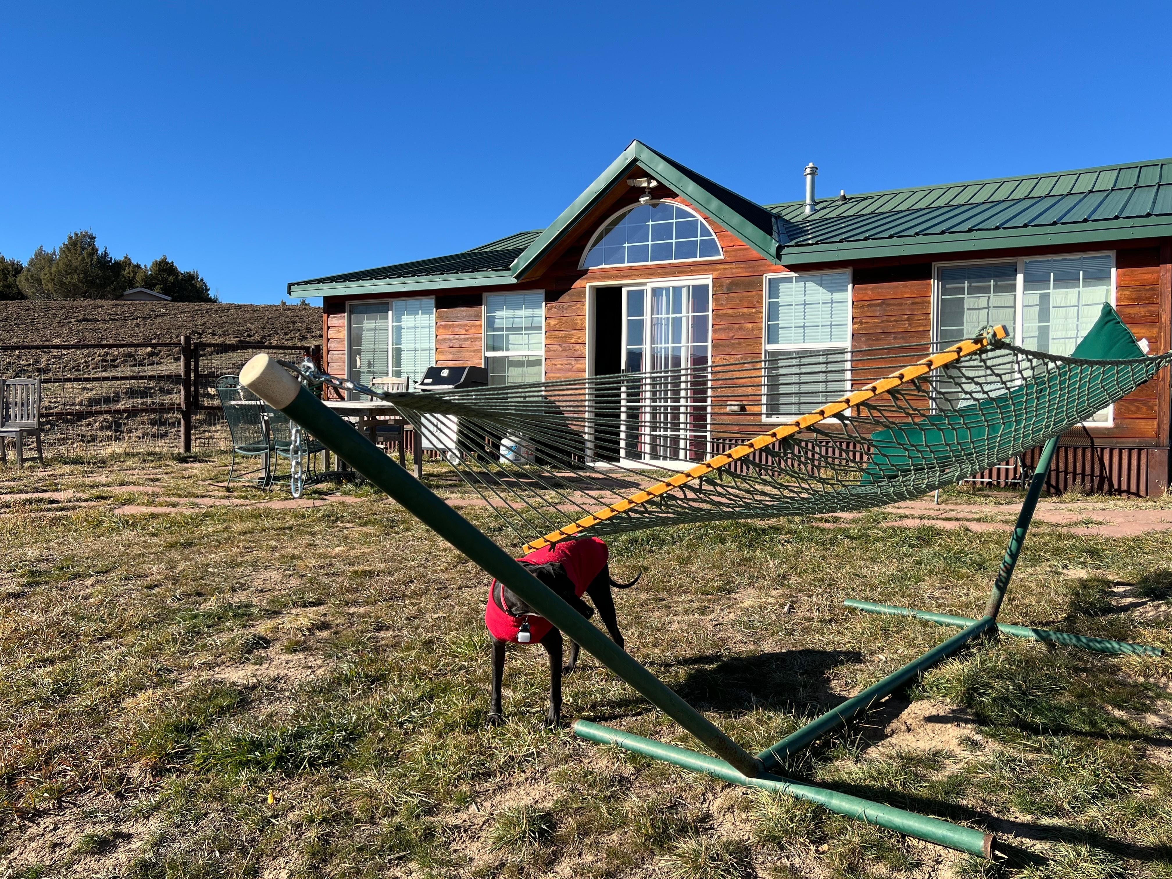 This renovated cabin was on skids, and we have added a beautiful sunroom/living area with a walk out grade patio to complete the design. It has solar power, with a back up generator..and has a pull out couch, as well as twins in each bedroom, so sleeping capacity is 6. We have a wonderful weber grill, as well as a fire pit on the patio, outside dining and a nice covered front porch, for shade in the hot afternoons...also has a gazebo, on the top of the goat pen here on the Ranch. Nice place for a nap, or practice your morning or evening yoga!