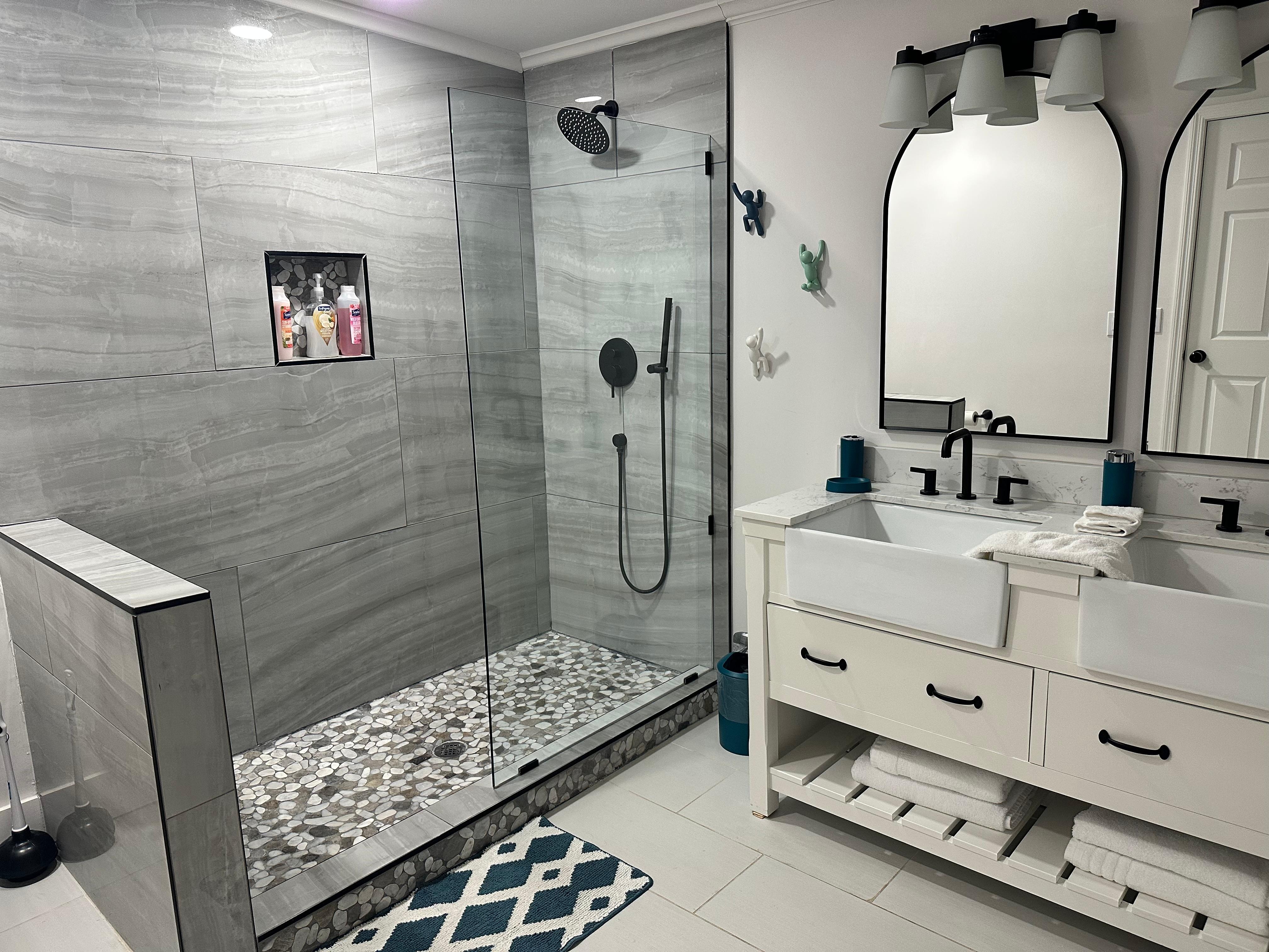 Mid century modern bathroom with natural light, terrazzo floors and marble on the walls and shower.