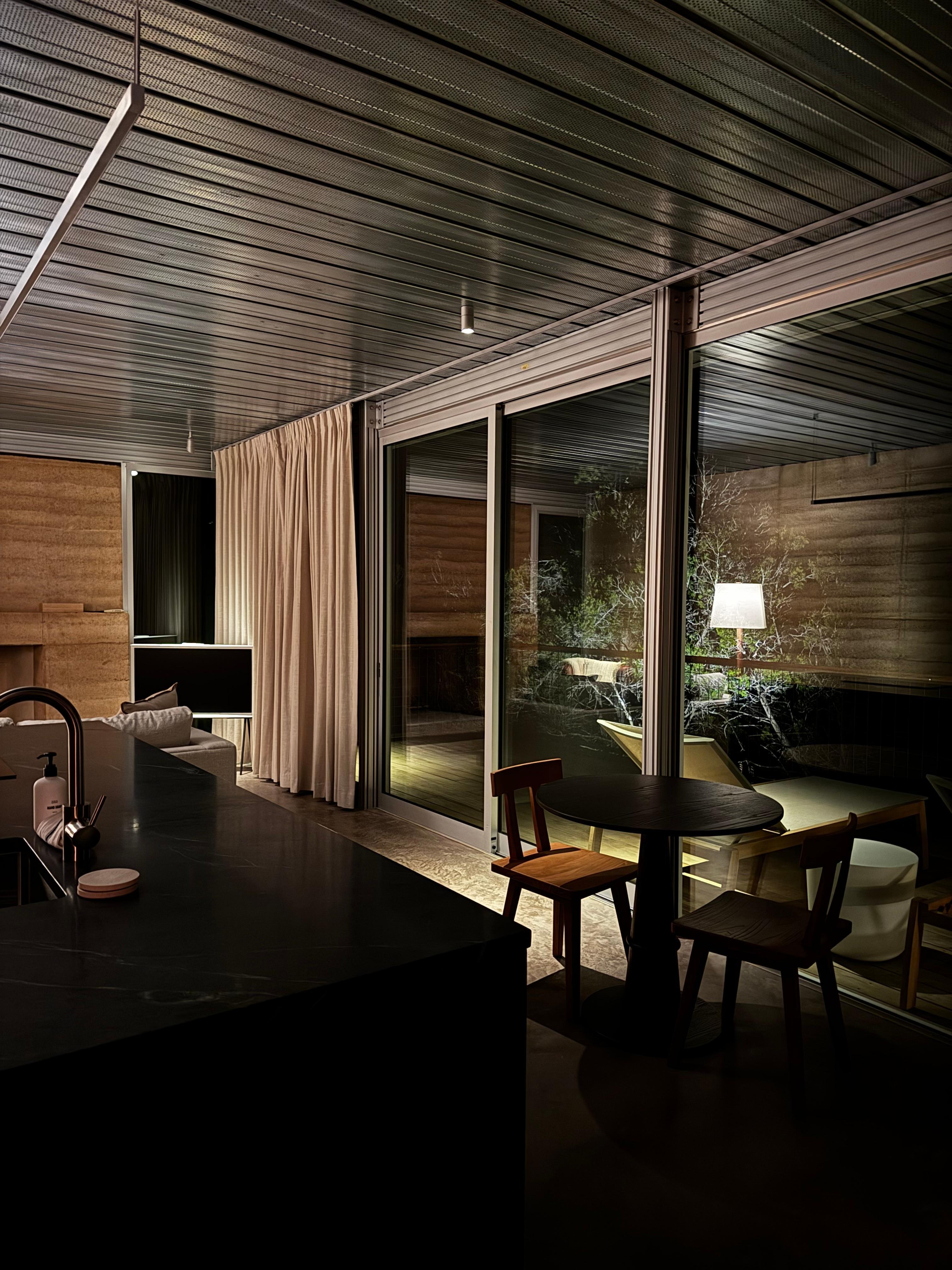 Come experience the Roadrunner cabin at Gamenthaler! A stunning, brand new 1-bedroom, 1-bath modern retreat completed in 2025 just a few miles outside Fredericksburg, Texas. At the end of a private gravel road and perched atop a scenic hill overlooking a wide, tranquil valley, this architectural gem combines rammed earth, metal, and glass for a striking yet harmonious blend with its natural surroundings. Less than 10 minutes from downtown scenic Fredericksburg, your stay will be the perfect blend of quiet nature escape with access to all the amenities of town. Designed for couples seeking a peaceful romantic getaway, this unique dwelling offers the perfect balance of luxury and solitude. Floor-to-ceiling glass windows frame ever-changing views of the Texas Hill Country—watch deer graze in the distance, listen to the call of wild turkeys, and catch glimpses of foxes or coyotes moving quietly through the cedars. Step outside onto your private elevated porch, where mornings begin with soft sunlight spilling over the valley and evenings end under endless stars. Inside, enjoy modern comforts—a fully equipped kitchen, plush king bed, sleek bathroom, and cozy lounge space, large wood burning fireplace (firewood included)—all thoughtfully designed for comfort and connection. The home also includes high speed internet (starlink) and a smart TV with access to your favorite streaming services (login required). The home is one of three small dwellings on a secluded 100-acre property, each privately situated and rented separately. As a guest, you’ll have full access to explore the land, wander the trails, or simply relax and soak in the stillness of nature. Whether you’re sipping wine from a nearby vineyard, reading by the window as the sun sets, or simply unwinding in quiet conversation, Gamenthaler offers an experience that feels both grounding and indulgent—a true retreat for the senses.