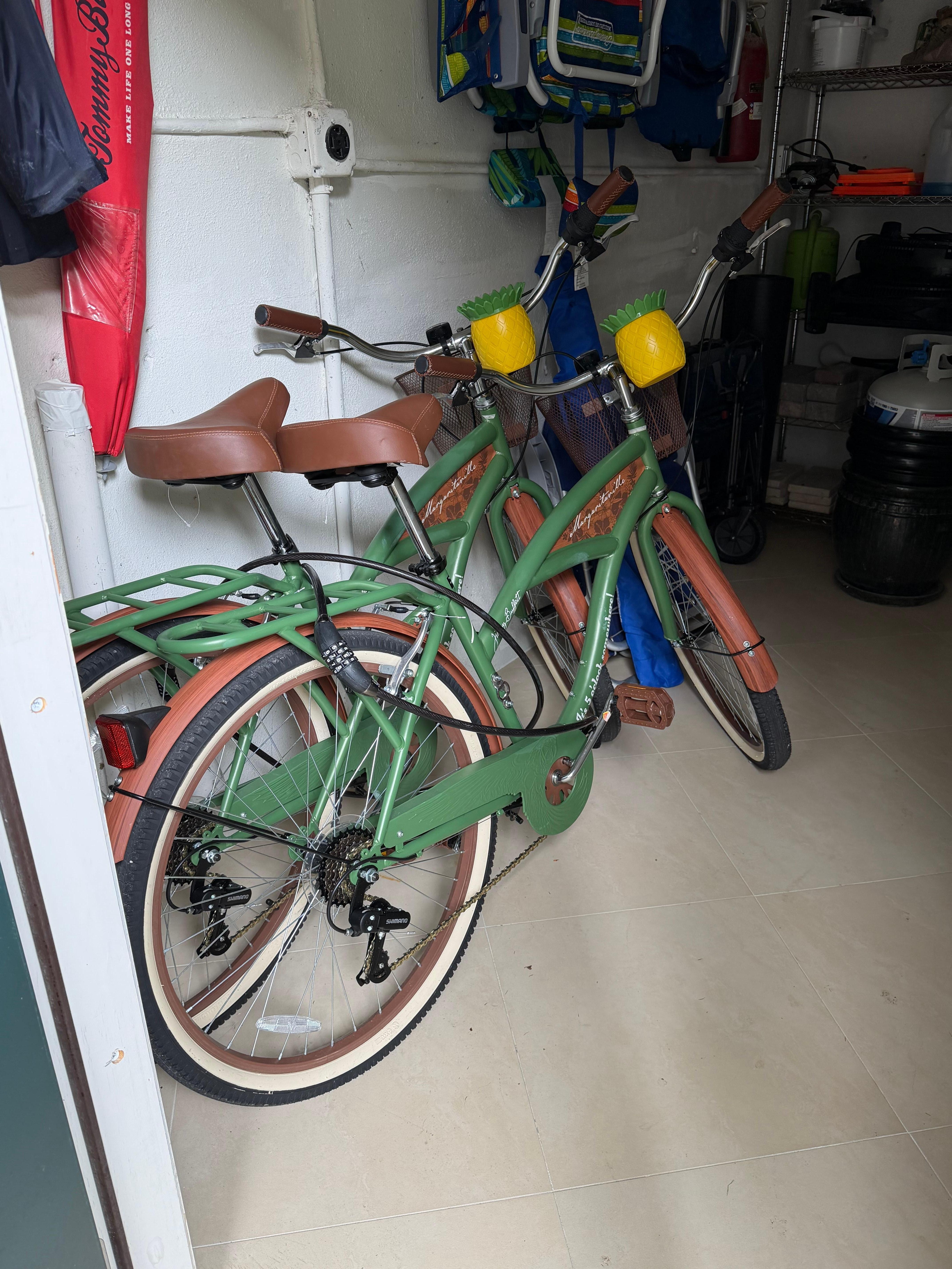 Guests have access to a quiet shared courtyard with seating and a grill. The stay also includes two cruiser bikes, a beach cart, beach chairs, an umbrella, a beach tent, and beach towels.