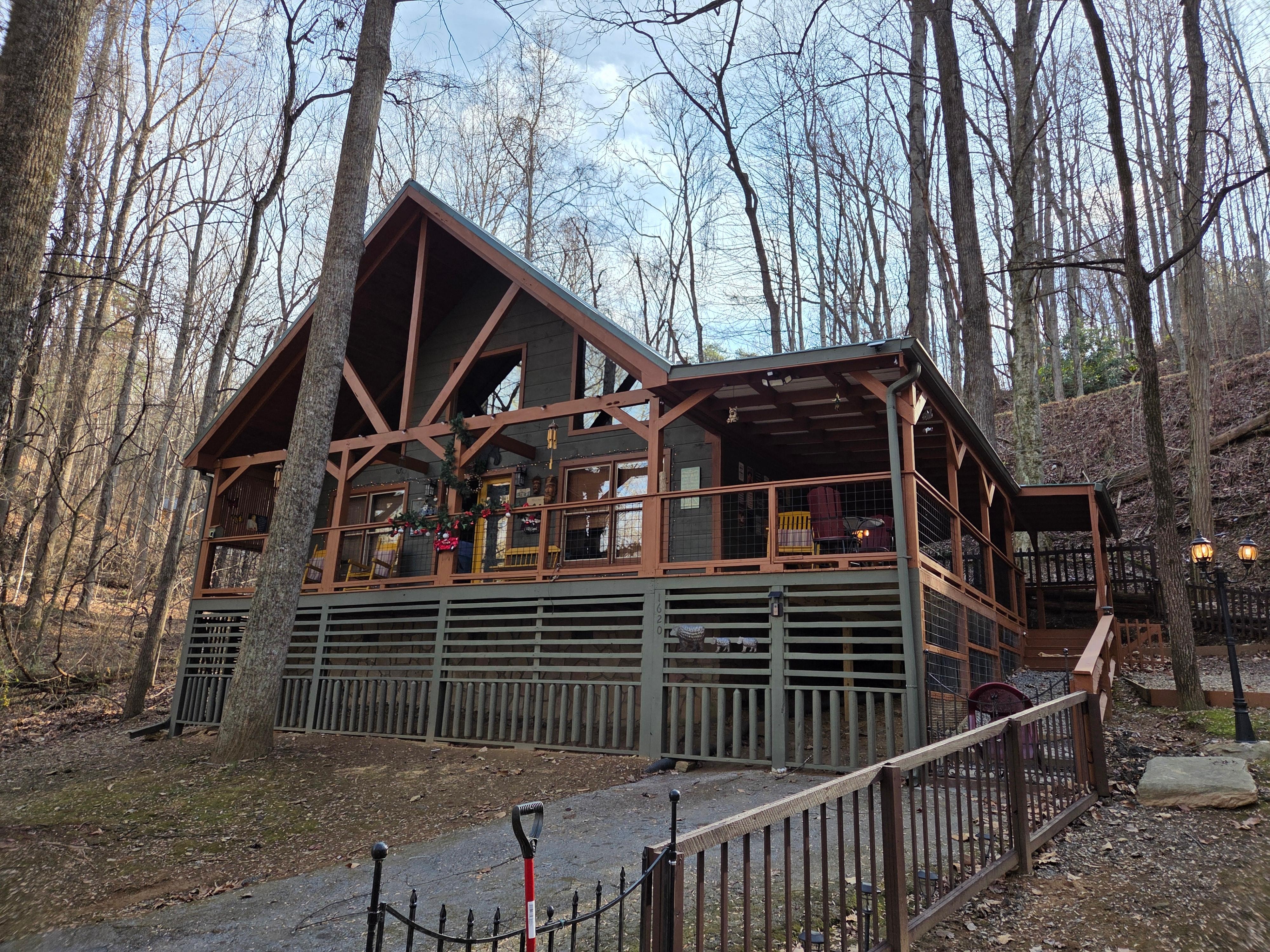 Outdoor living spaces are a highlight, with a covered wrap-around porch that includes a new private hot tub & rocking chairs, table & chairs for morning coffee, surrounded by a peaceful wooded setting. It is located on a short, dead-end road with just 1 other cabin. This allows safety for kids & pets to play. This cozy cabin even has a fenced yard, a unique amenity for a rental cabin. The fenced yard has a park-style charcoal grill & firepit with seating.