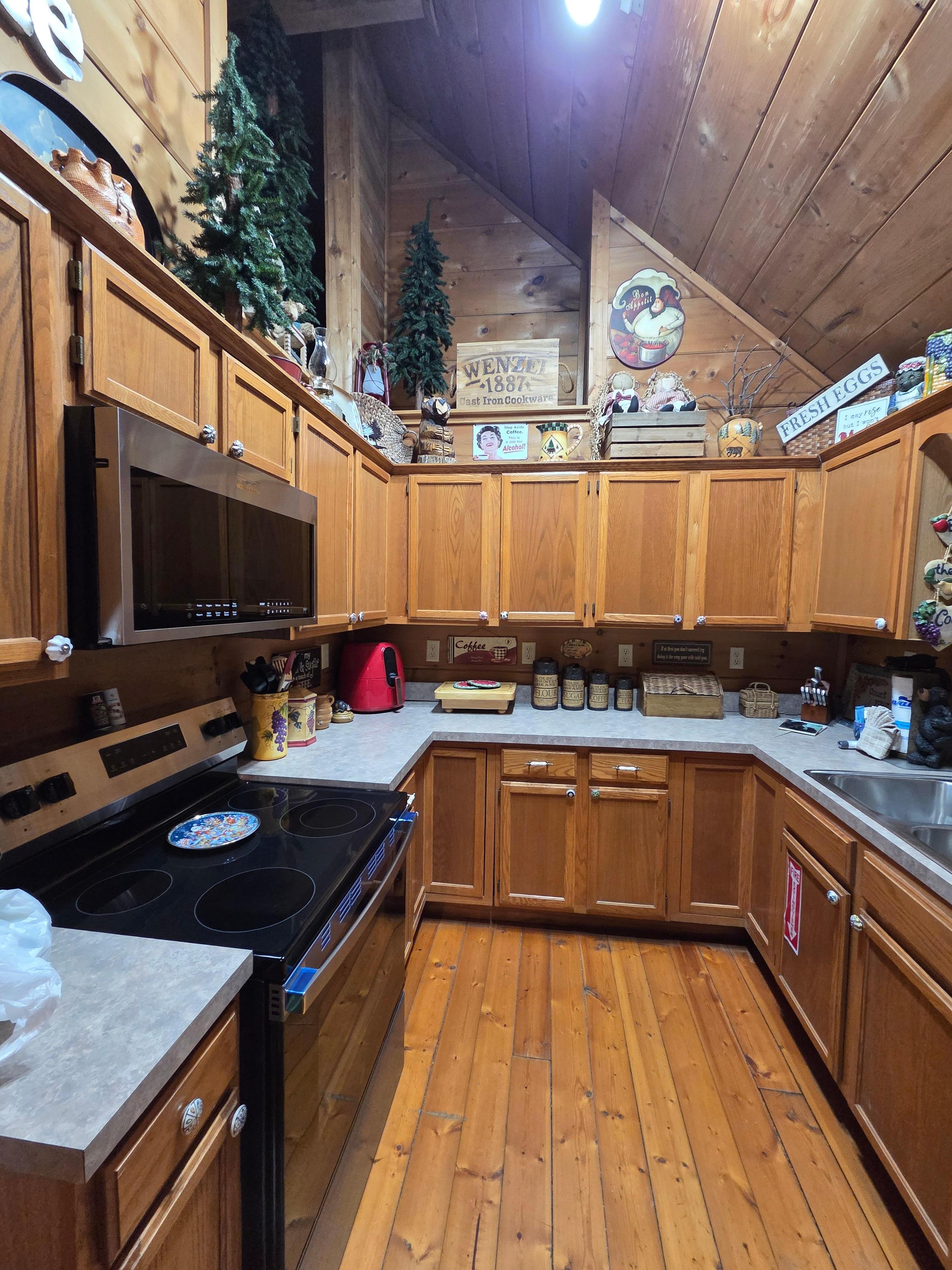 The kitchen has plenty of counter & cabinet space, as well as cookware & dishes that you will need for stay-in-the-cabin meals. All new stainless-steel appliances include an electric smooth-top range, microwave, refrigerator with an ice maker & dishwasher, There is a blender, toaster, slow cooker, electric mixer & can opener, George Forman grill, Keurig & regular coffee maker & more. The bar high dining table seats 4 people on comfortable padded bar stools.