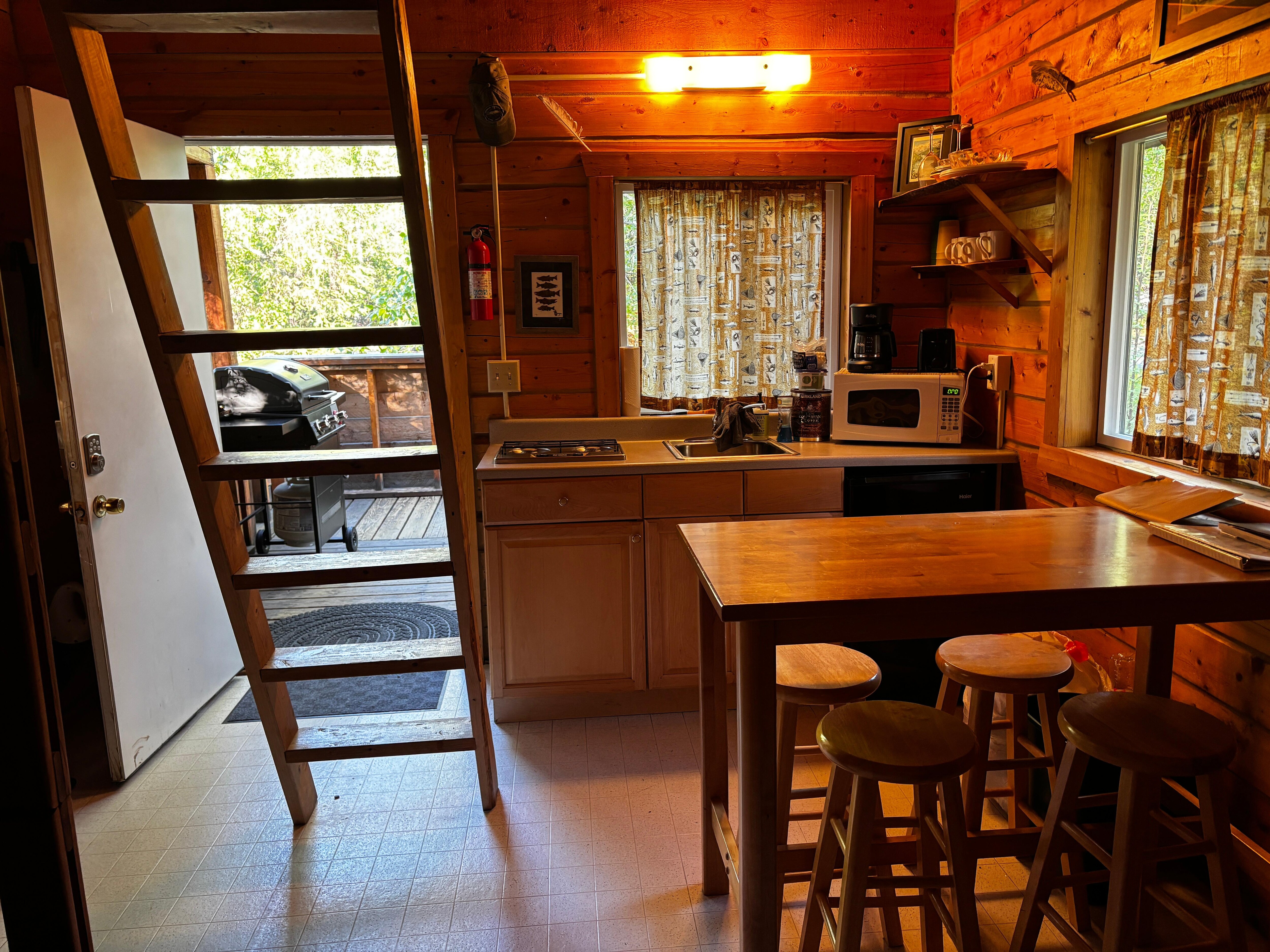 Come relax in your own private cabin after a long day of fishing at Cooper Landing Fish Camp, located on the world famous Upper Kenai River. Cabin 1 sleeps up to 4 and is equipped with a kitchenette complete with cooktop, microwave, fridge, and coffee pot. Prop your feet up on your front deck while your fresh catch grills on the BBQ. There is a separate shower house with laundry and a private full bath. Fire pip available. Guests provide own wood.