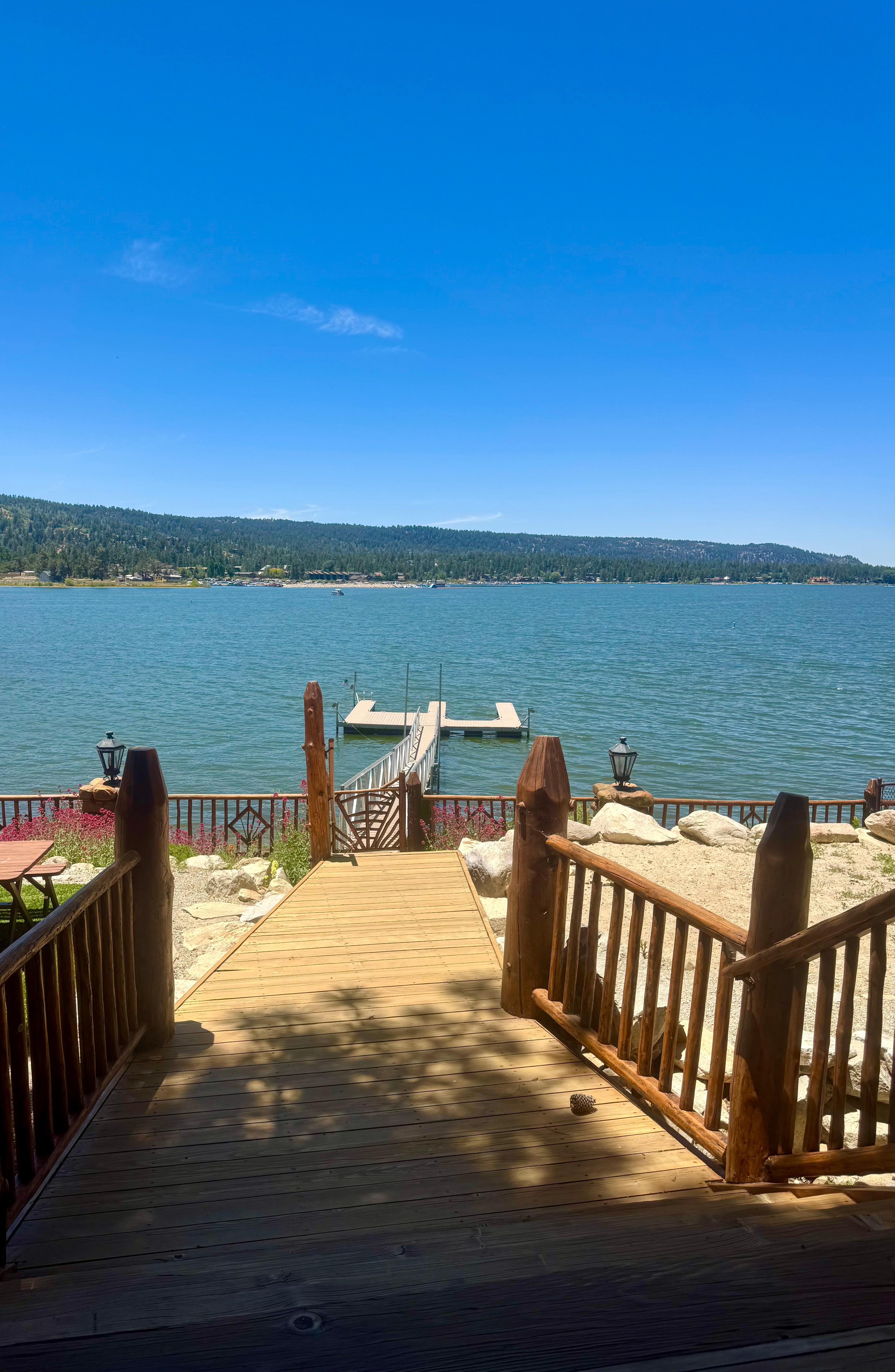 Rustic Elegance meets Mountain Charm: One of the most spectacular locations in all of Big Bear! 5 bedroom & 4.5 bath, located directly on the Lake at Eagle Point, with expansive 180 degree west-facing views of the lake, mountains, and our fabulous year-round sunsets. Features custom Timber Frame log construction with incredible details throughout. Wrap-around view deck flows to a beautiful staircase leading to the lake. 5 Star rustic elegance throughout. With superior craftsmanship in this Lakefront estate, you’ll enjoy Big Bear Lake in grand style. Plus private boat dock available during the summer months (May-October) and the lake is ready for your water adventures on Eagle Point. Bring the family and work remotely from the mountains. Trade the back-to-school blues with the tranquility of breathtaking lake views. The first half of the day you can perch with your laptop looking across the peaceful lake and mountains...the rest of the afternoon is yours to take advantage of California's endless summer style. Plenty of hours left to hike, bike, boat, kayak or just relax dockside under a million stars at night. We have bikes and kayaks, PDFs and more, just ask and we'll find a way to accommodate you.