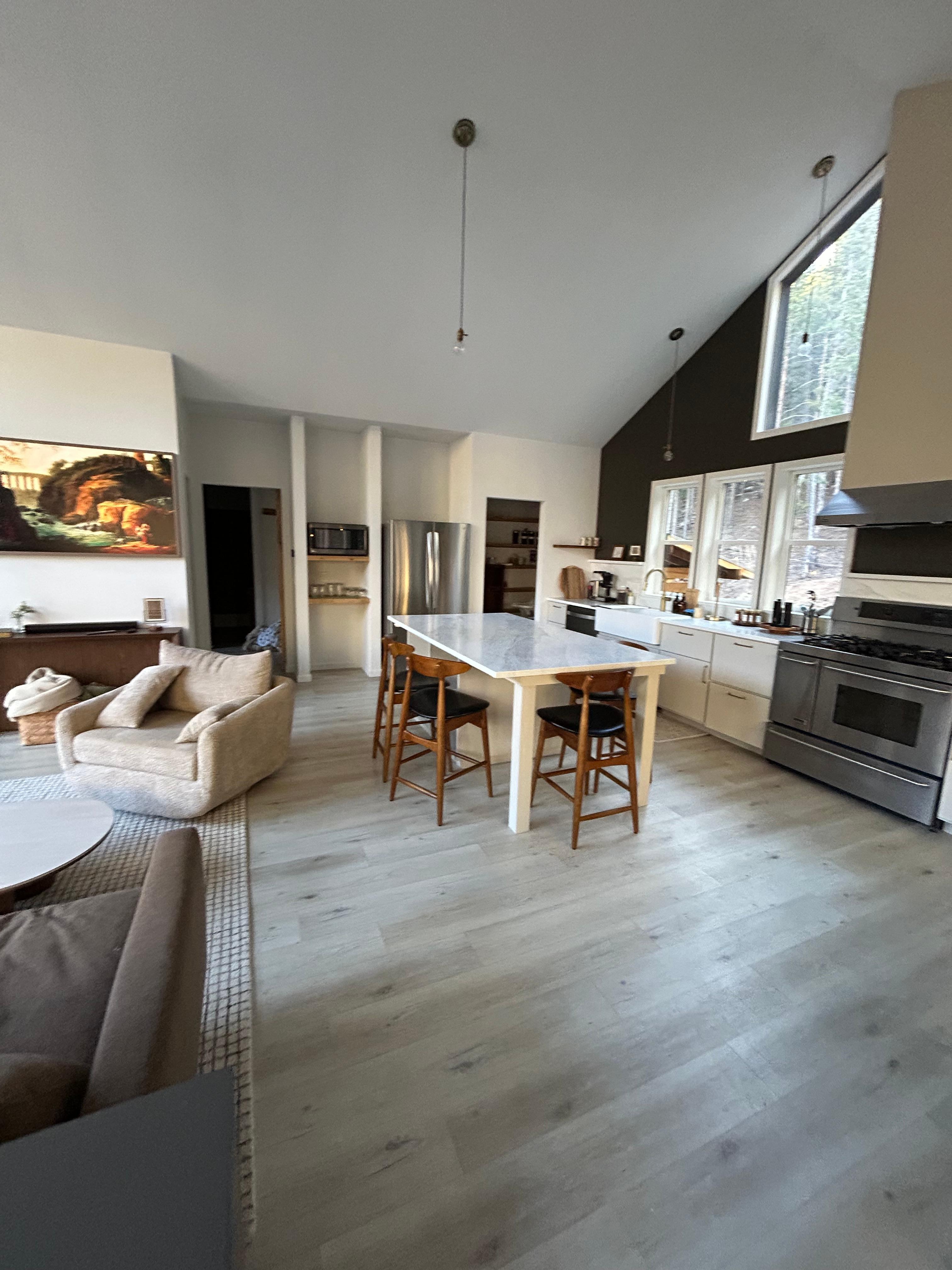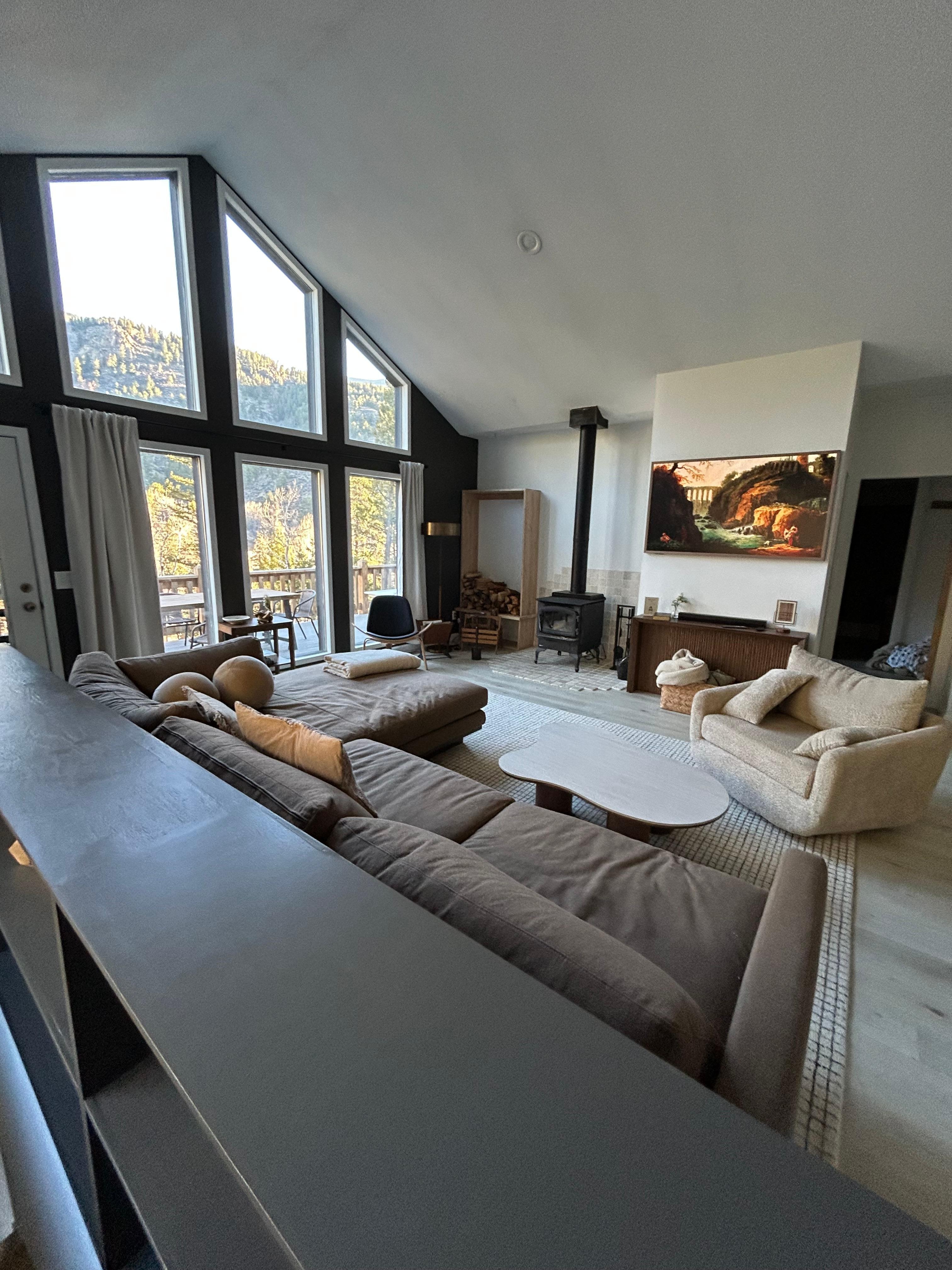 Our open-concept main level living space is designed for connection and light. It features soaring vaulted ceilings and floor-to-ceiling windows that frame the surrounding pine forest and mountain views. You can unwind on the plush sectional by the wood-burning stove or enjoy a movie on the huge 65" canvas TV with surround sound system.
