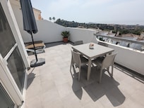 Beautiful and modern south-facing penthouse apartment located in a small complex with communal pool in Calahonda / Mijas Costa with huge 20 m2 terrace and panoramic sea views! Quiet but central location, only a 5 minutes´s drive away from the beach.