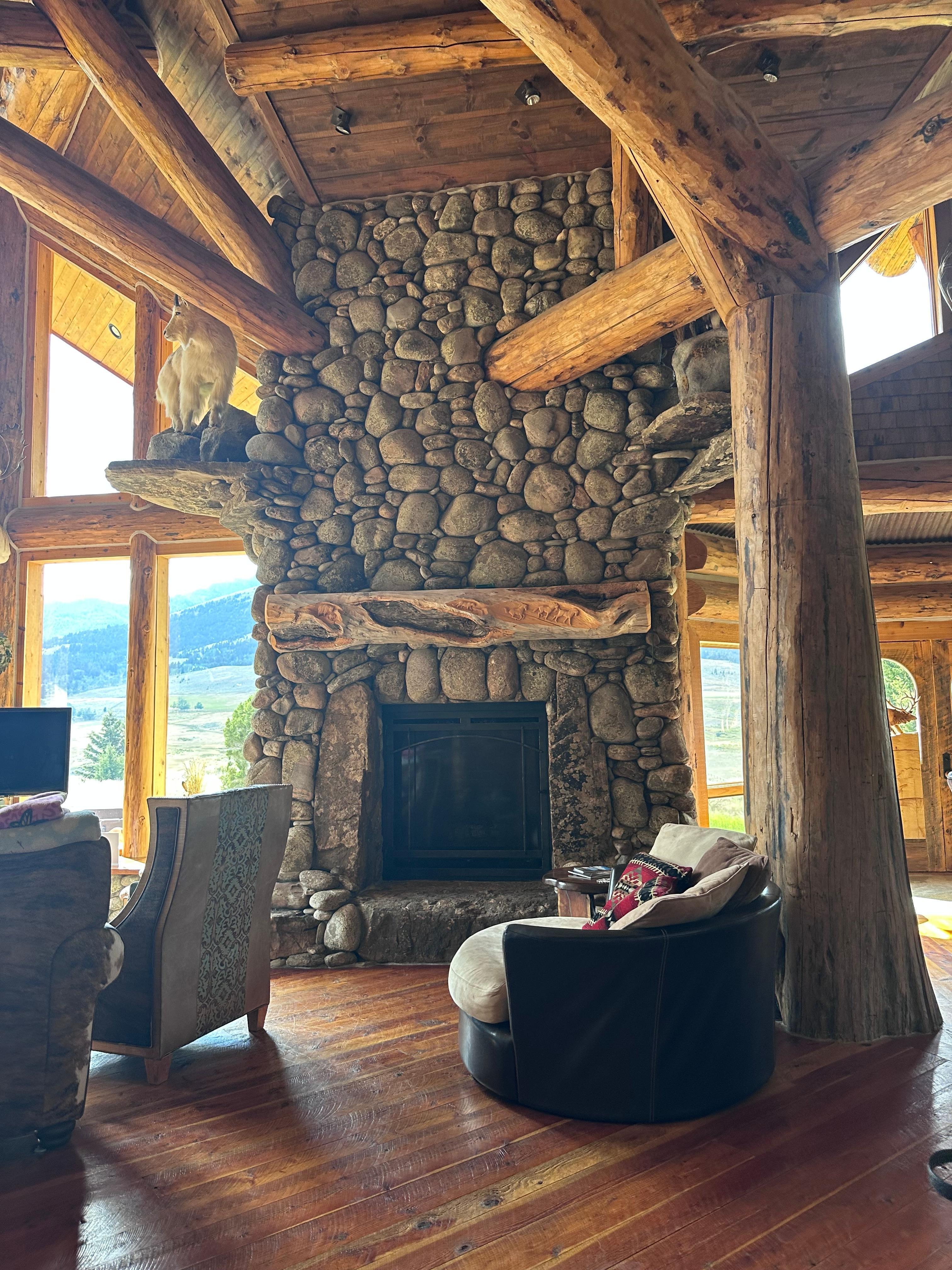 *Open great room with large couches, leather recliner chair and big rock fireplace. There are 72 windows in lodge, the views are beautiful and plentiful.