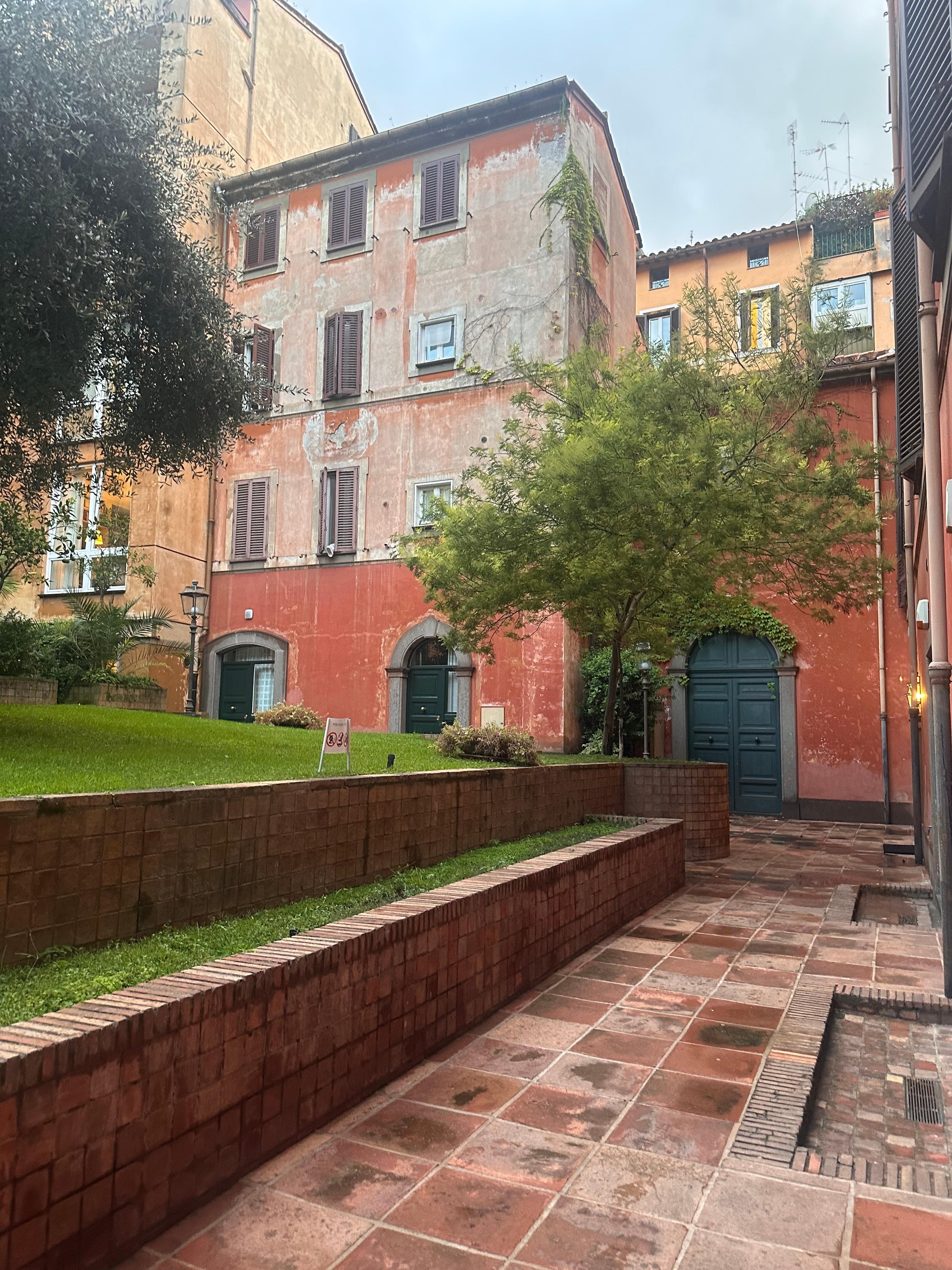 On three sides are 17th century buildings in yellows, ochers and reds; on the fourth, a modern glass building reflects the sun on the courtyard.