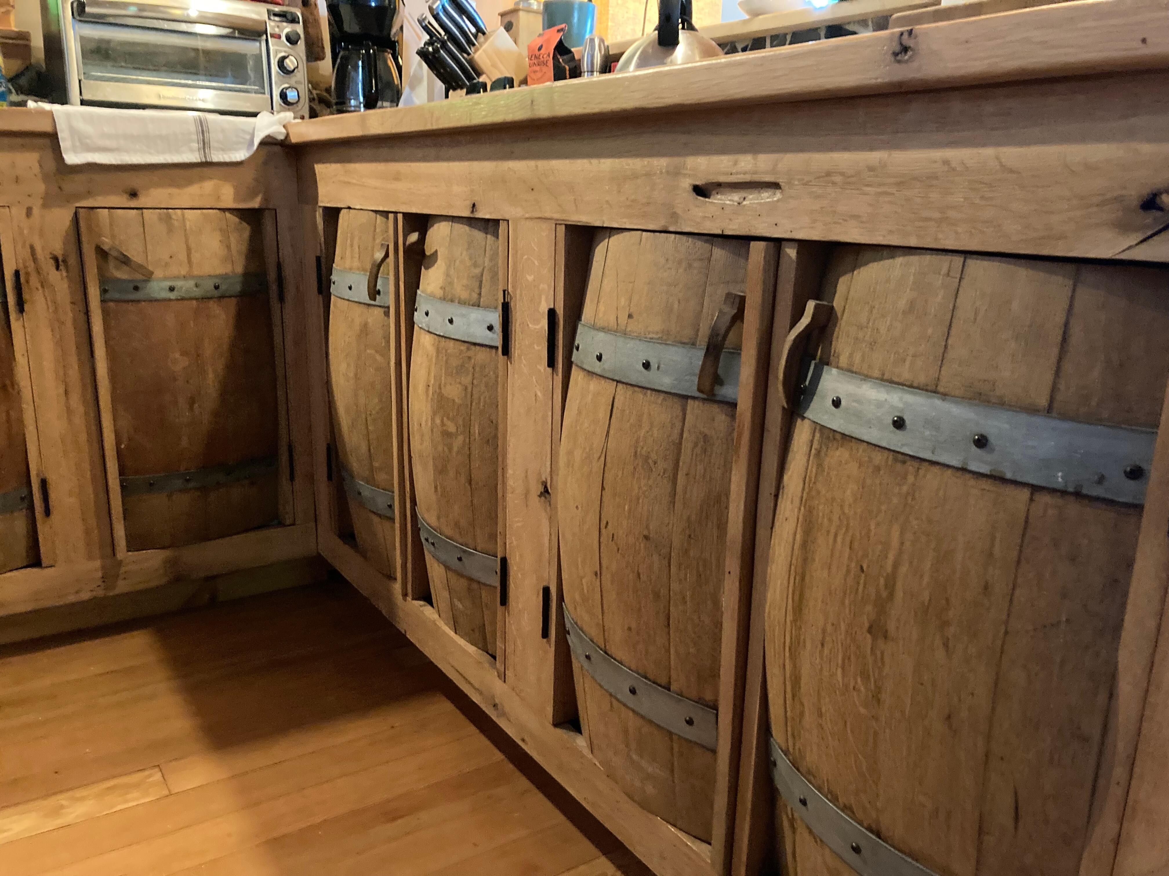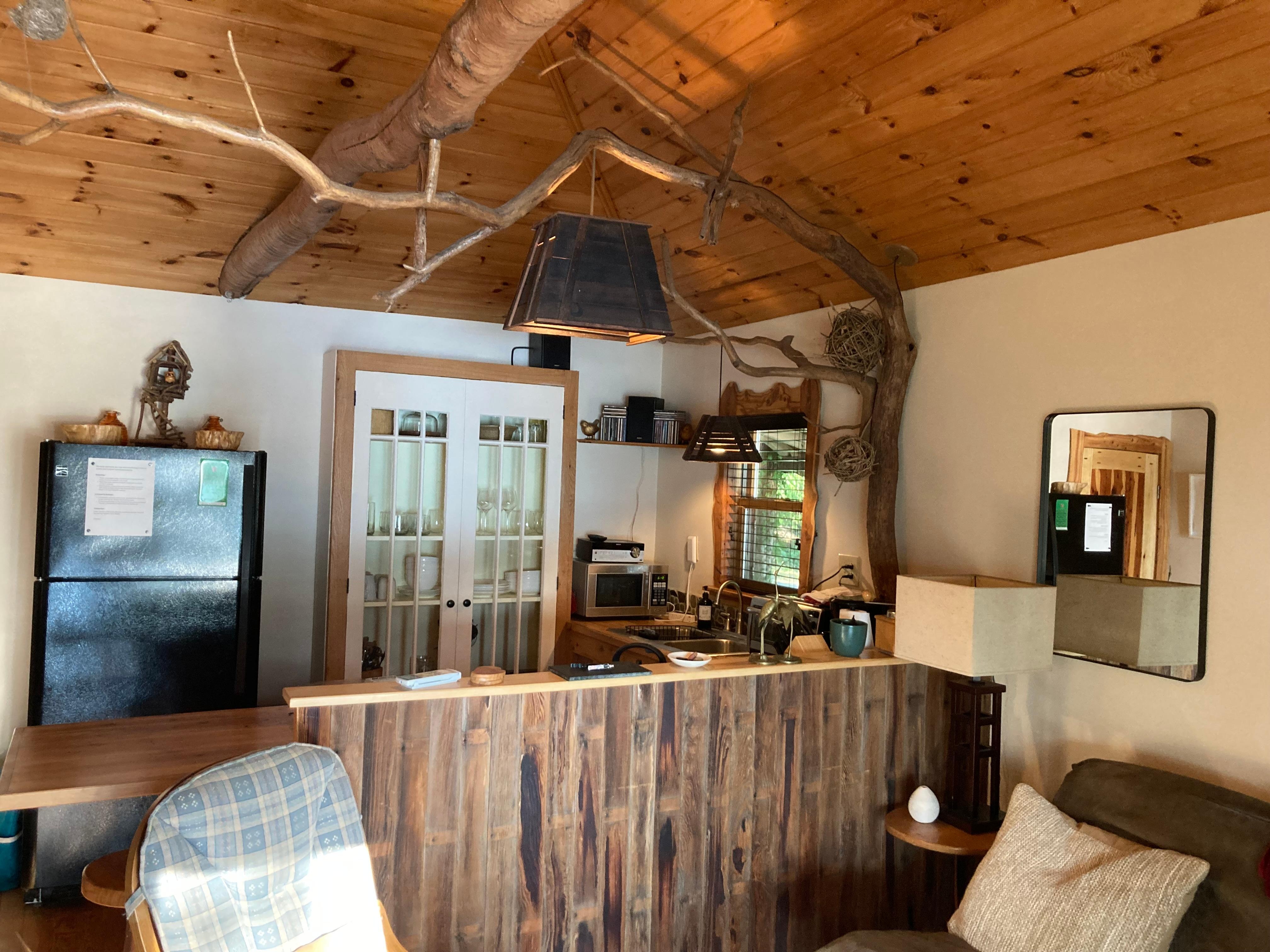 This renovated cottage has a cathedral ceiling spanned by a large cherry log and accented with Stag Horn Sumac branches. All the woodworking is made from trees harvested from the property, (red cedar and white oak)