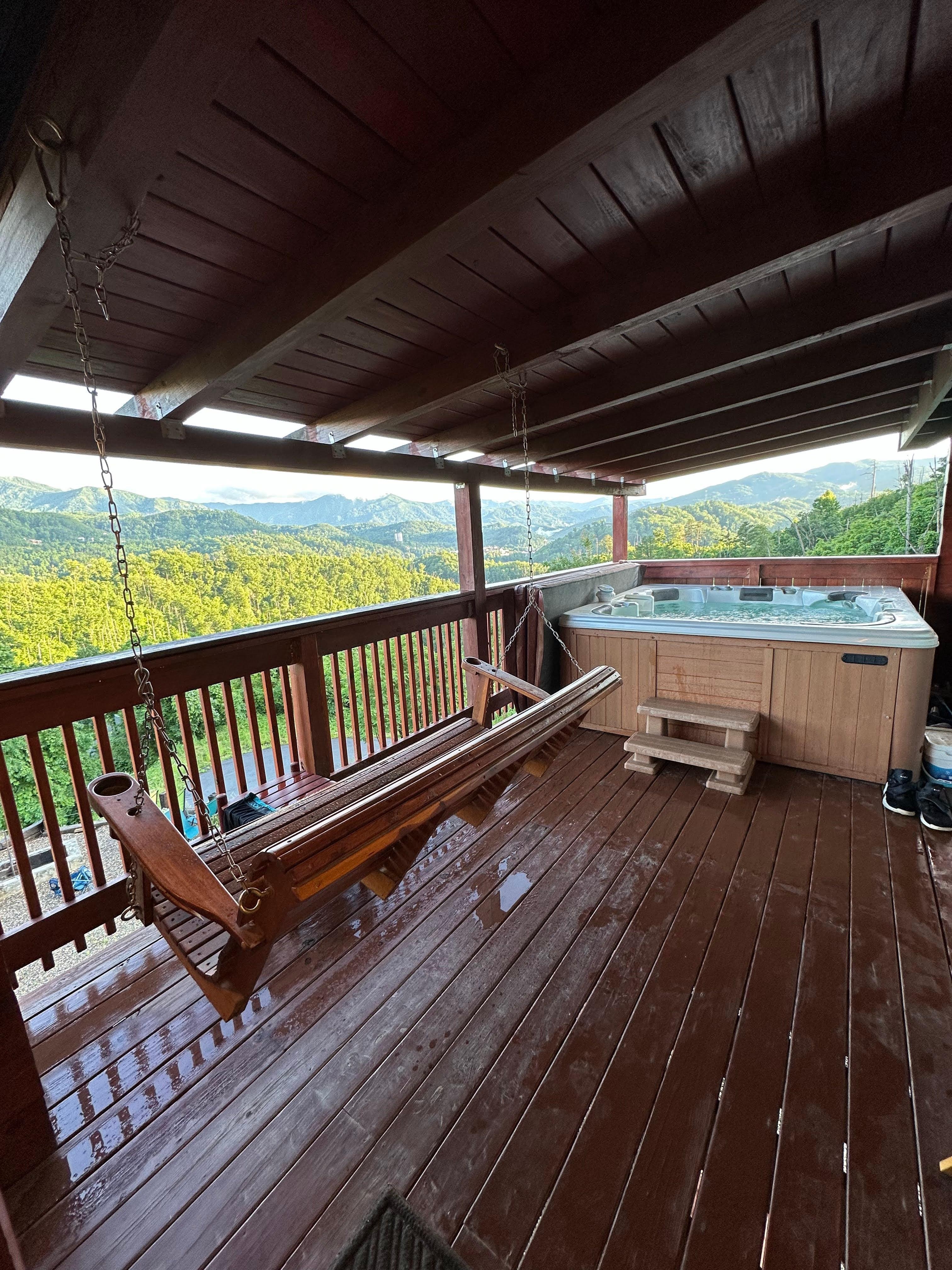 The Gatlinburg Lodge has Two Large Decks. One Deck offers a Huge Hot Tub for 7 People. The other Deck is set up for Viewing and Quiet Reflection. Below the two decks are Two Large Patios. Each of the 4 Decks and patios has a large swing and rocking chairs or patio furniture.