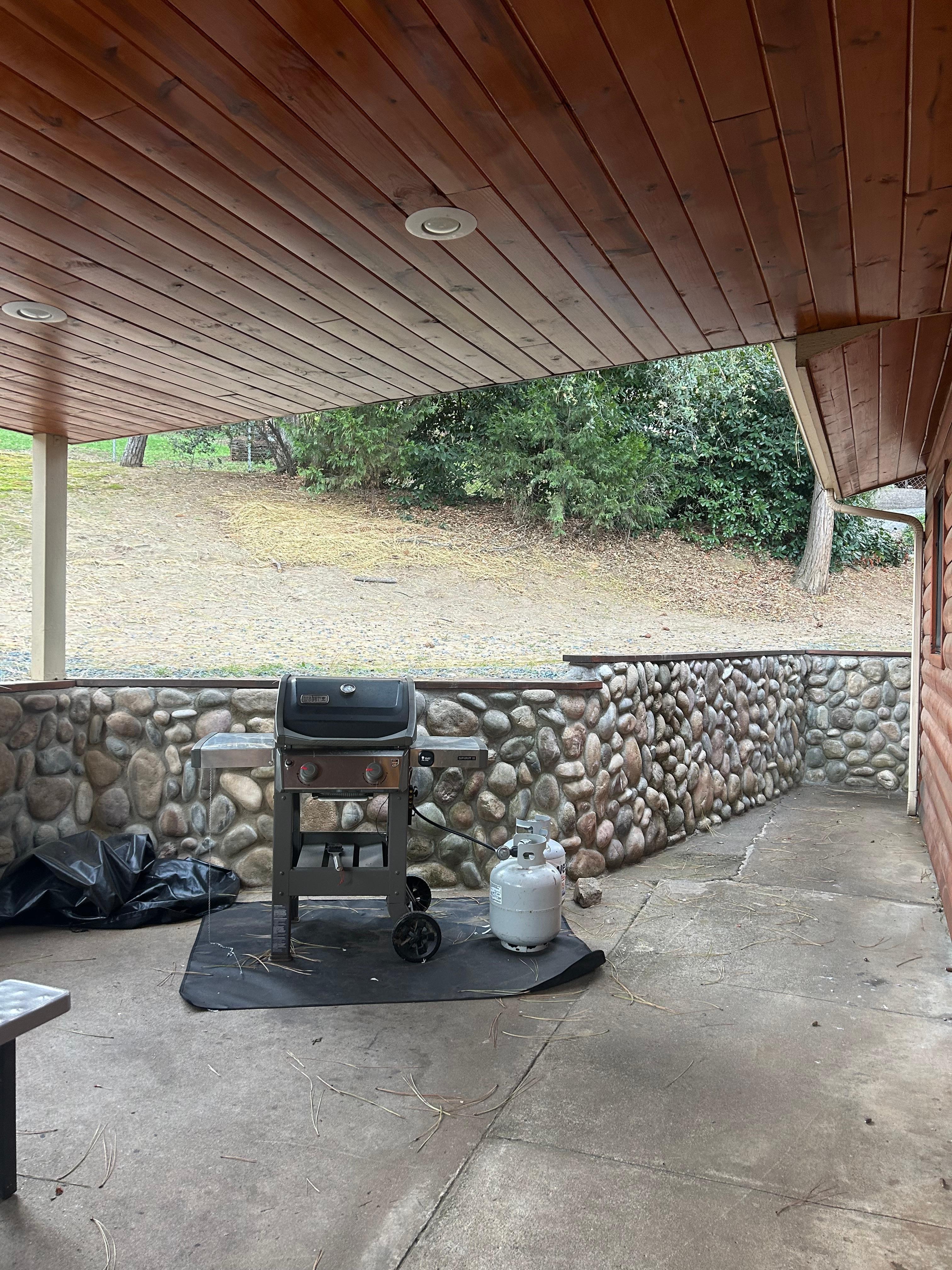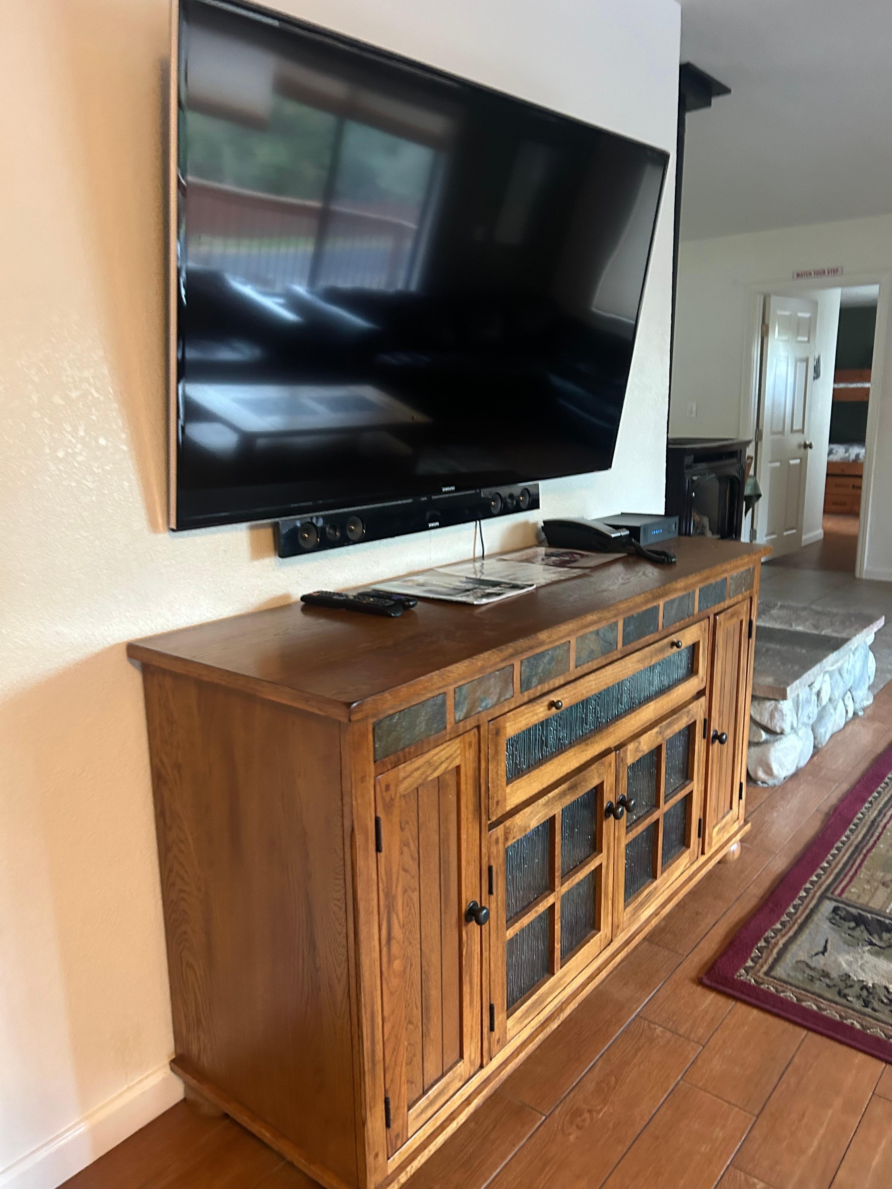 The living room opens into the dining and kitchen area, which is great for family gatherings. The dining area opens out to an outdoor covered patio, with a BBQ and picnic table. One bedroom has a Log King-size bed, with a 40-inch smart TV. The second room has a log queen bed with 40 40-inch smart TV. The third bedroom has a full/full bunk bed with a pullout twin trundle and a 32 smart TV. For your comfort and safety, please only one adult or two children on the top bunk.