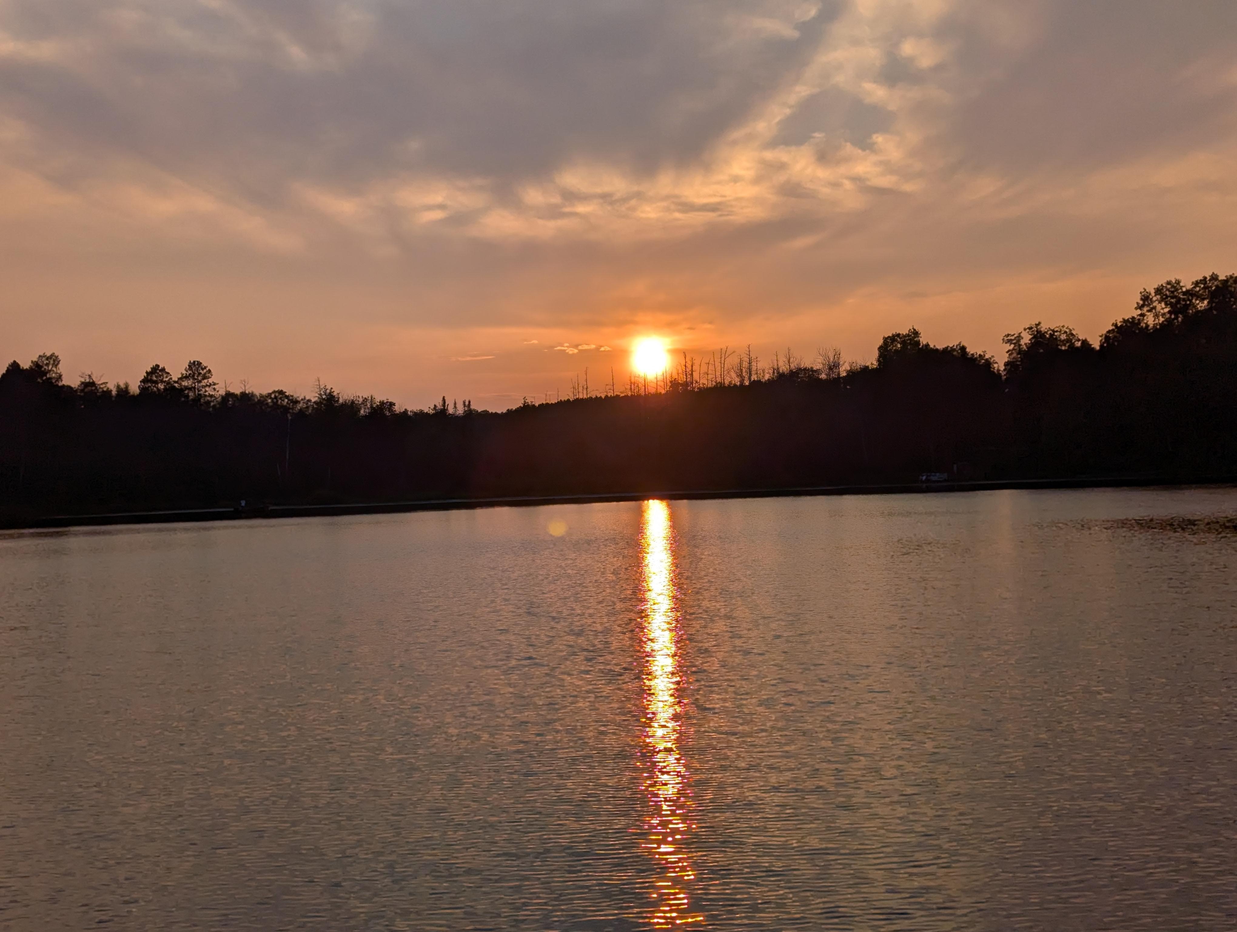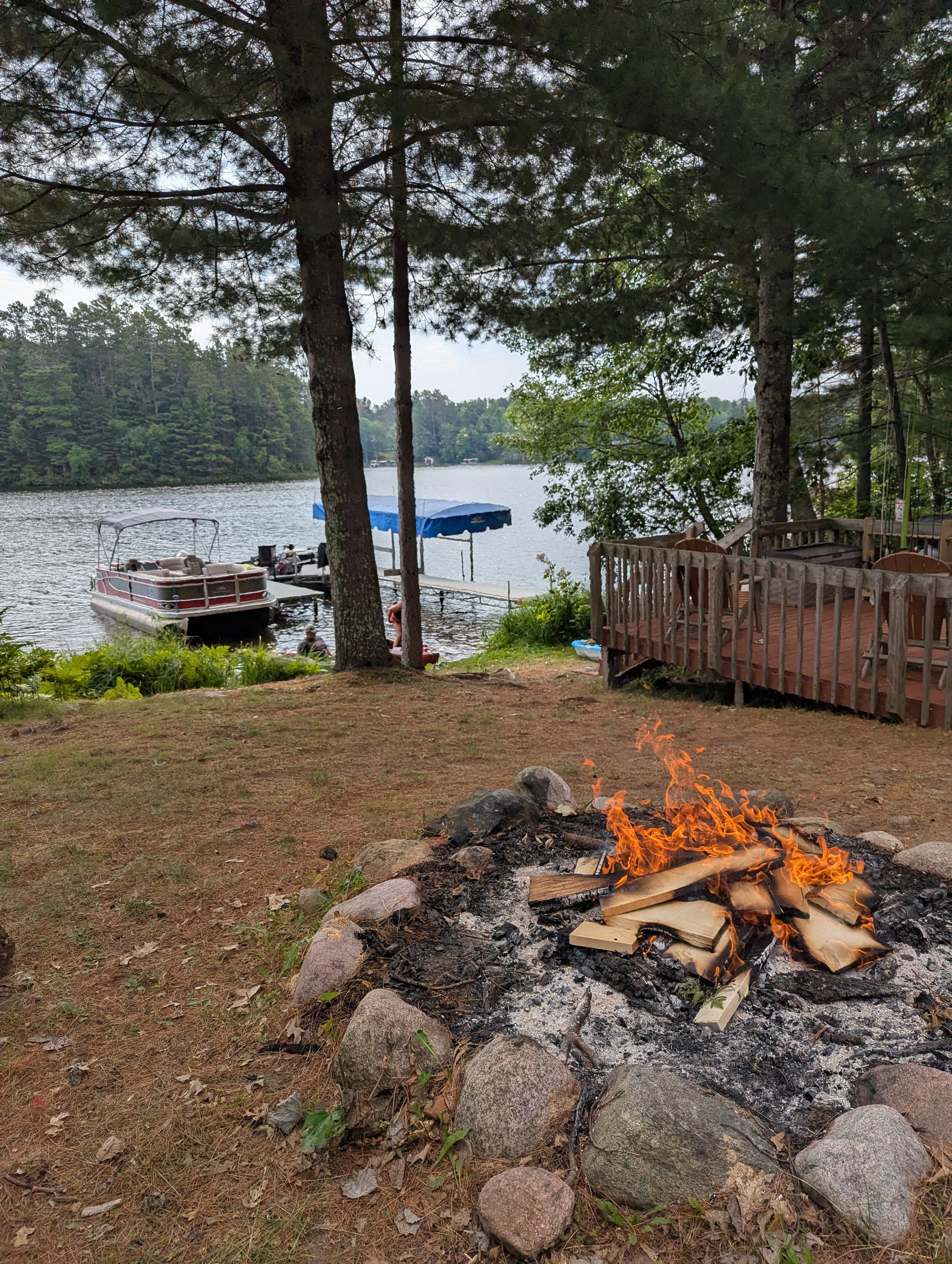 Our private wooded property stretches 13 acres with the log house and lakefront comprising 2 acres. Lighted blues stone steps take you to a lake side deck, fire pit (for those s'mores) and spacious aluminum dock with two built in swivel chairs and table for food/drink. There is electricity in the dock area. We have 160 feet of level frontage on Lake Shishebogama perfect for all kinds of water activities with a sandy water frontage next to our dock suitable for wading, swimming and young children. The lake system totals close to 1000 acres for your swimming, fishing (musky, bass, walleye, pike) and boating enjoyment. We provide a 14-foot aluminum rowboat, two kayaks and a canoe for your use during your stay. An outdoor grill and new grilling patio in the front of the home gives a convenient place to BBQ.