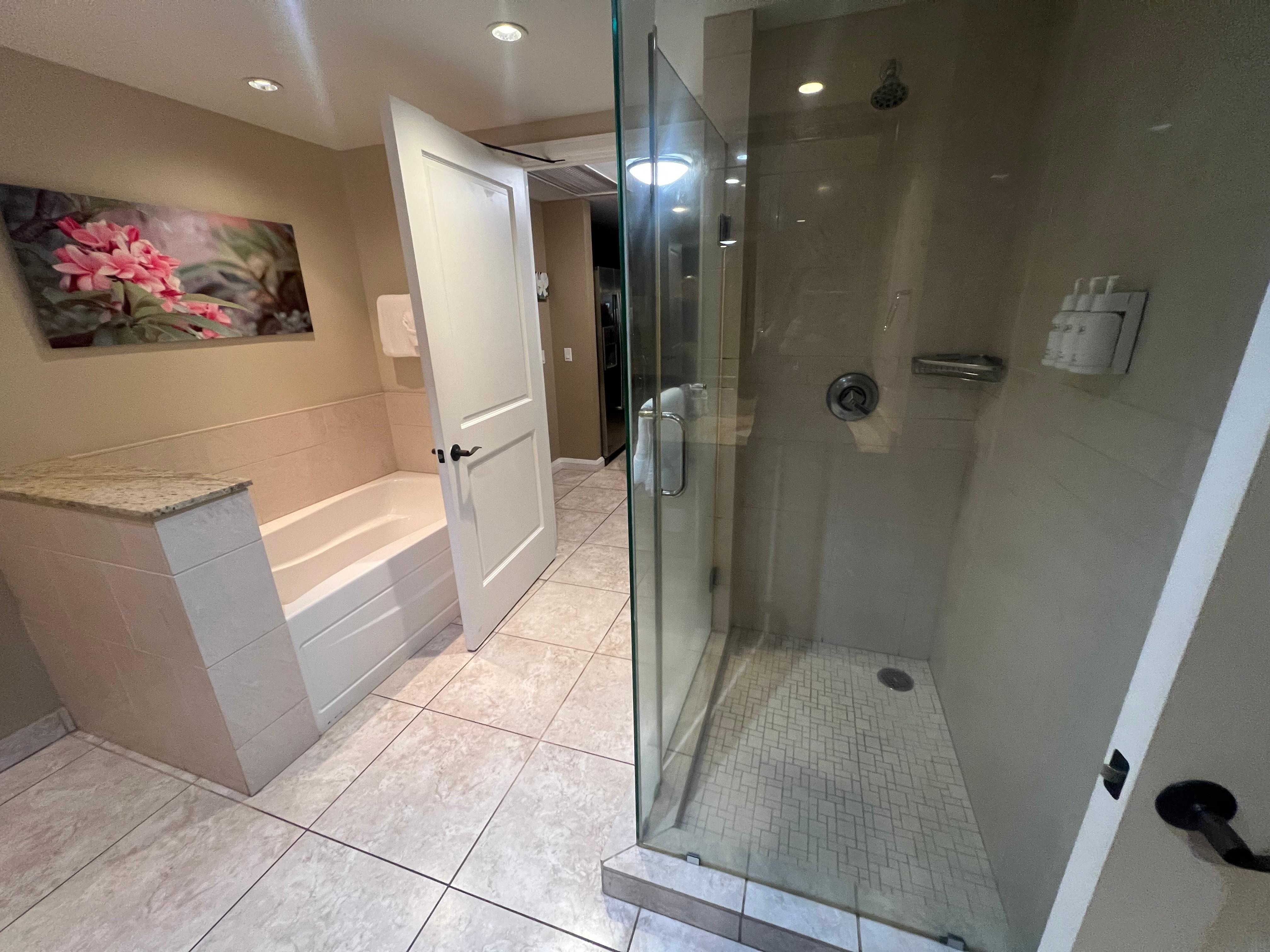 Large spa-style bathroom with frameless glass shower and separate soaking tub