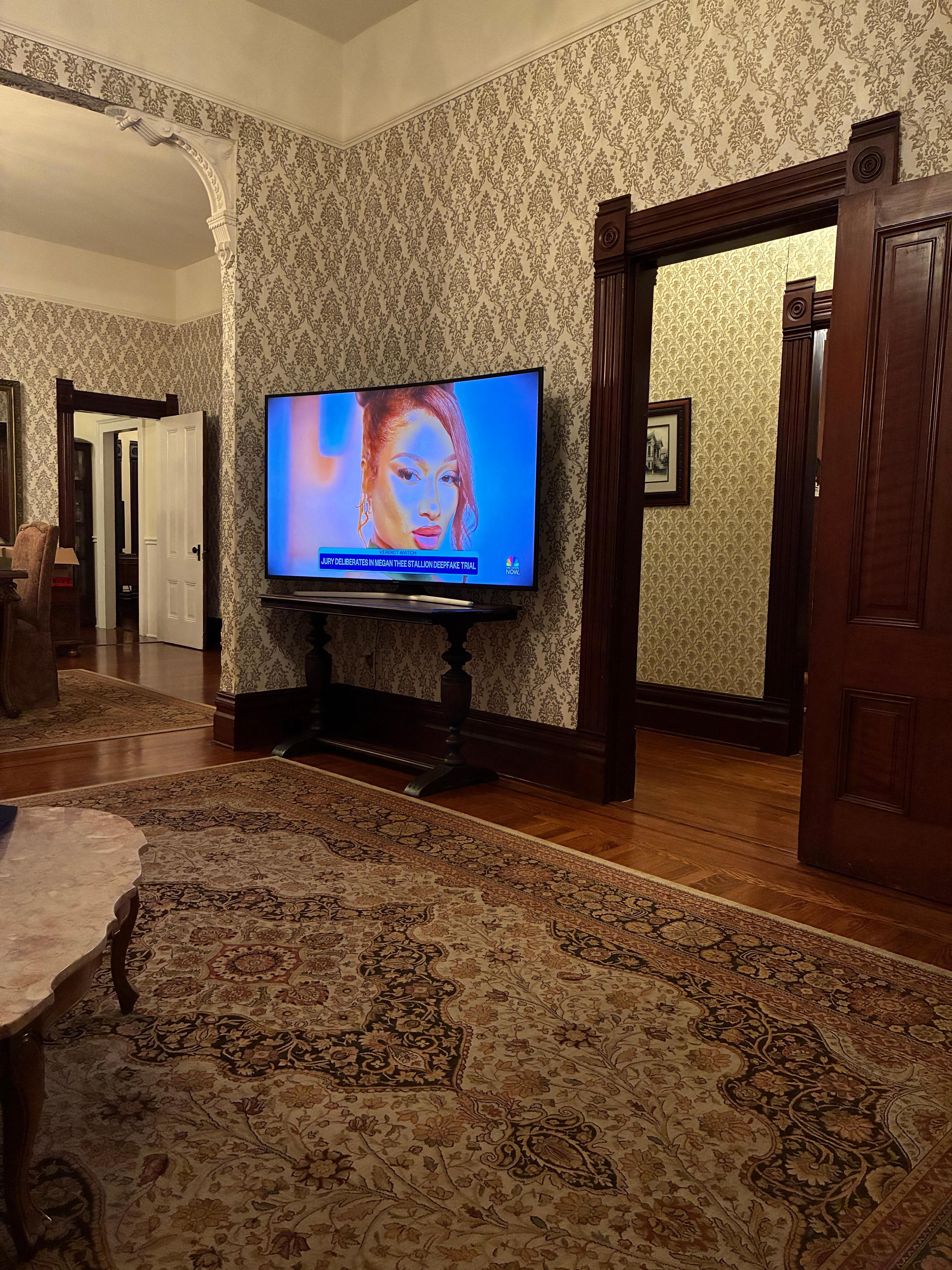 The space has a large living room complete with sofa, wing back chairs, and 60" 4K curved flat screen TV with cable and DVR. The dining room features a large dining room table with six chairs. The spacious kitchen has garbage disposal, gas stove, dishwasher, and newer refrigerator. One bedroom features a gorgeous four poster queen sized bed with a 37" flat screen TV, the second bedroom lovely antique bedroom set with a full bed and 55" flat screen TV with DVR, the third a queen sized Murphy bed and the fourth bedroom a remarkable full sized Murphy bed that transforms into a desk. One of the bathrooms has a clawfoot tub with pedestal sink, the second bathroom is a Jack and Jill to two of the bedrooms and has a shower. Both are nicely remodeled.