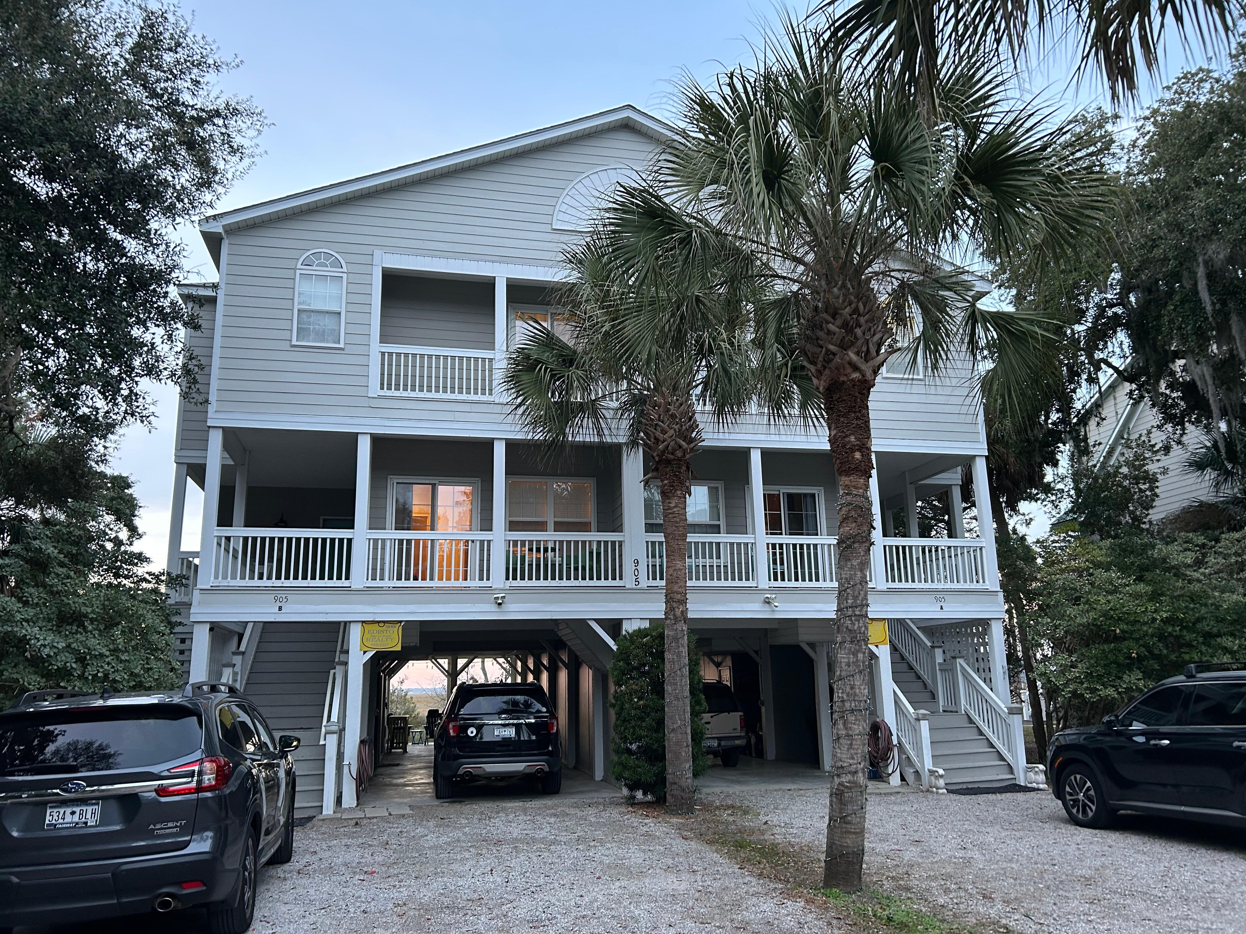 Views of the Marsh, Views of Scott Creek, Views of Big Bay Creek and the Sunsets - WOW! The home is on the end of Jungle Shores -quiet and private and only a block and 1/2 to the beach. This is a whole house rental of both sides of a 4 BD 4 Bath duplex. The main level has the Great Room (LR,DR,Kit) with a 2 singles Bedroom and Hall Bath (tub/shower combo). Off the Great Room is the first of 2 marsh view covered decks with plenty of seating plus a dining table. Upstairs is the hall laundry room and 3 bedrooms and 3 baths. The Master Bedroom is the left with the 2nd covered deck and private bath with whirlpool tub and stall shower. To the right down the hall are the other two bedrooms one with a Queen & private bath and the other with a queen and Bunk with trundle (sleeps 5) and bath. Pet friendly with fee. Cable and internet service provided. No Smoking. Linens are not included.