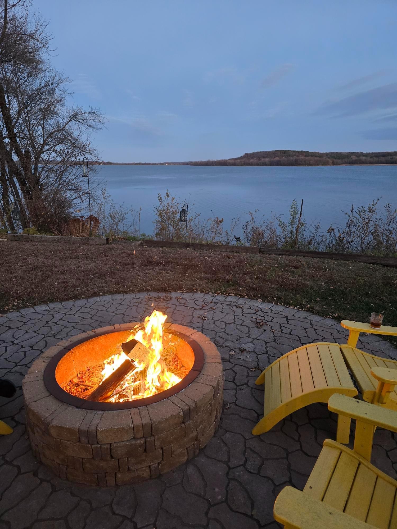 There is an outdoor dining table with 6 chairs, 2 lounge chairs with cushions, 4 adirondak chairs and a hammock for your use. Walk down to the dock for some sunning, canoeing or fishing. Enjoy the warmth of the fire pit overlooking the lake, toast marsh mellows, tell stories and simply just relax under the stars.