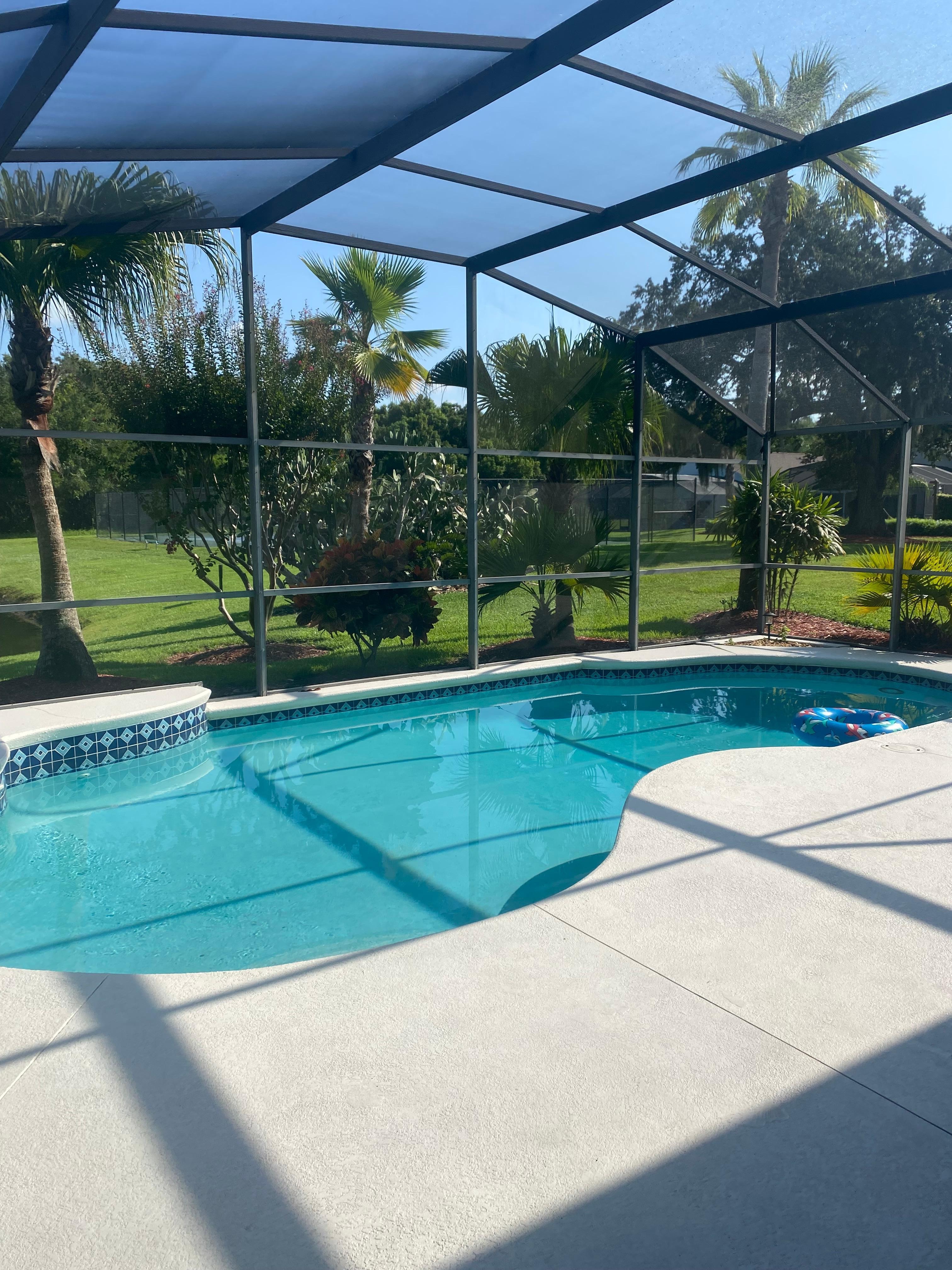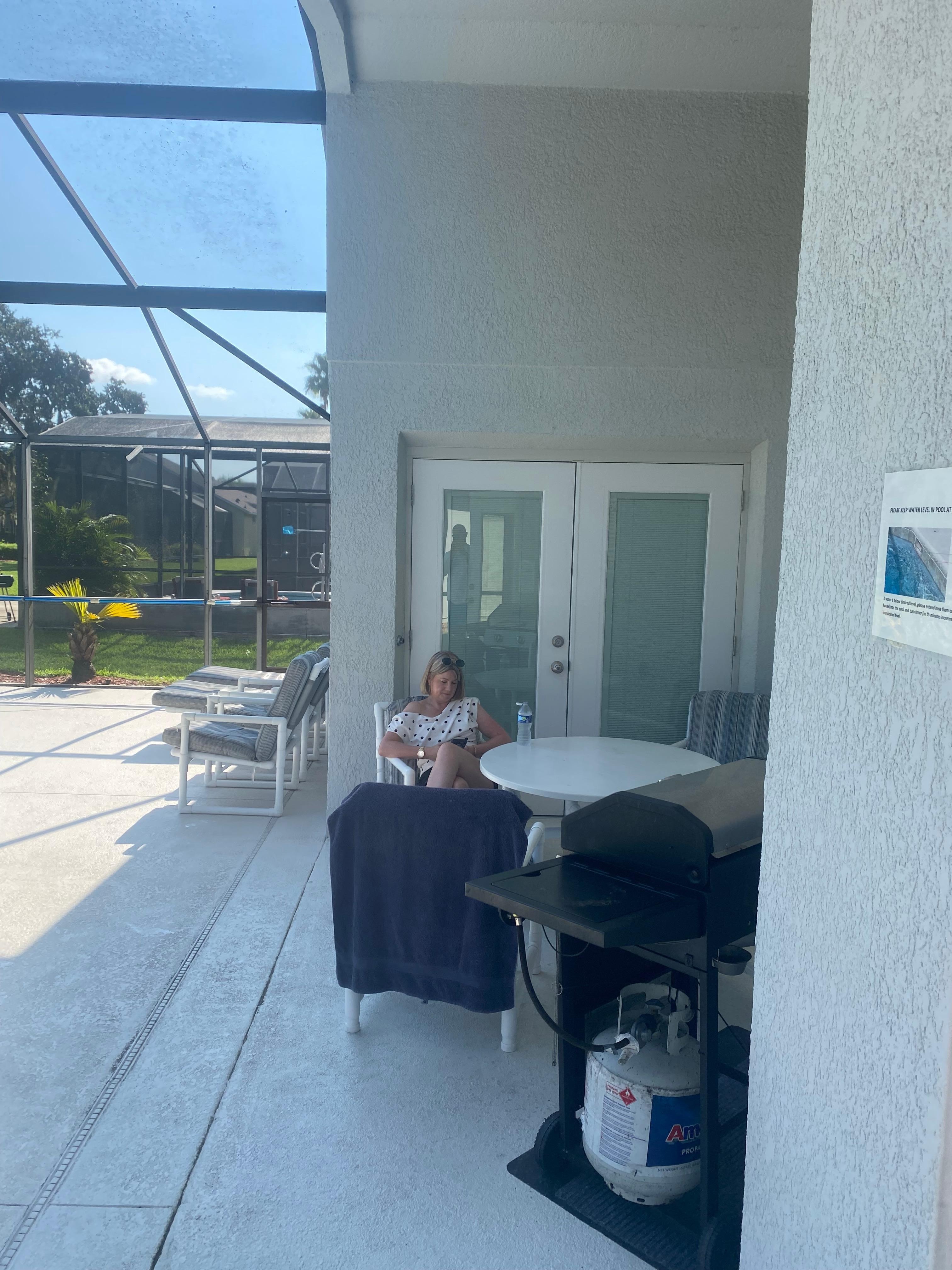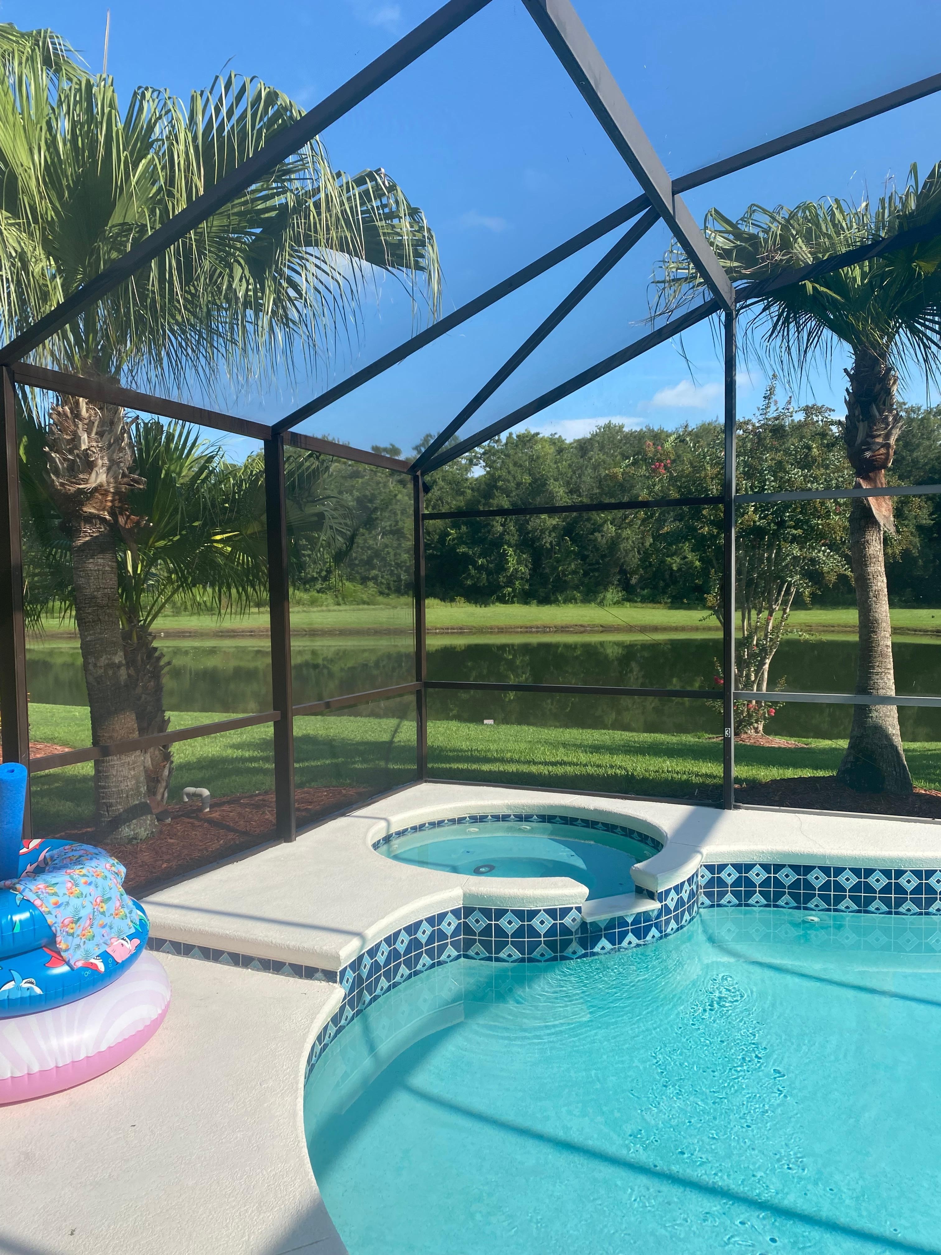 Our luxury villa is located in the quiet enclave of Lake Berkley Resort, Kissimmee. This a gated and secure development with a guard present 24 hours per day. The villa is single storey with 4 bedrooms, 3 bathrooms and its own private pool and spa and overlooks a small lake at the rear and a conservation area and as a consequence have great privacy. The lake attracts abundant wildlife and birds. Common sightings include alligators, turtles, otters, deer, ospreys and bald eagles. The pool and spa (its not a hot tub) can be heated but pool heating is charged separately (£110 per week). The pool is heated to 86F and the spa to 102F. We have two sun loungers, two recliners and four outdoor comfortable chairs with an outdoor table for dining on the pool deck. A gas grill/BBQ is available and free to use for guests. A tennis court (free to holiday makers) is within 50 yards of our home. Four tennis rackets and several balls are available in the villa for use by guests. Moreover we also have 4 pickle bats. We also have lots of golf balls for those interested in a few rounds!