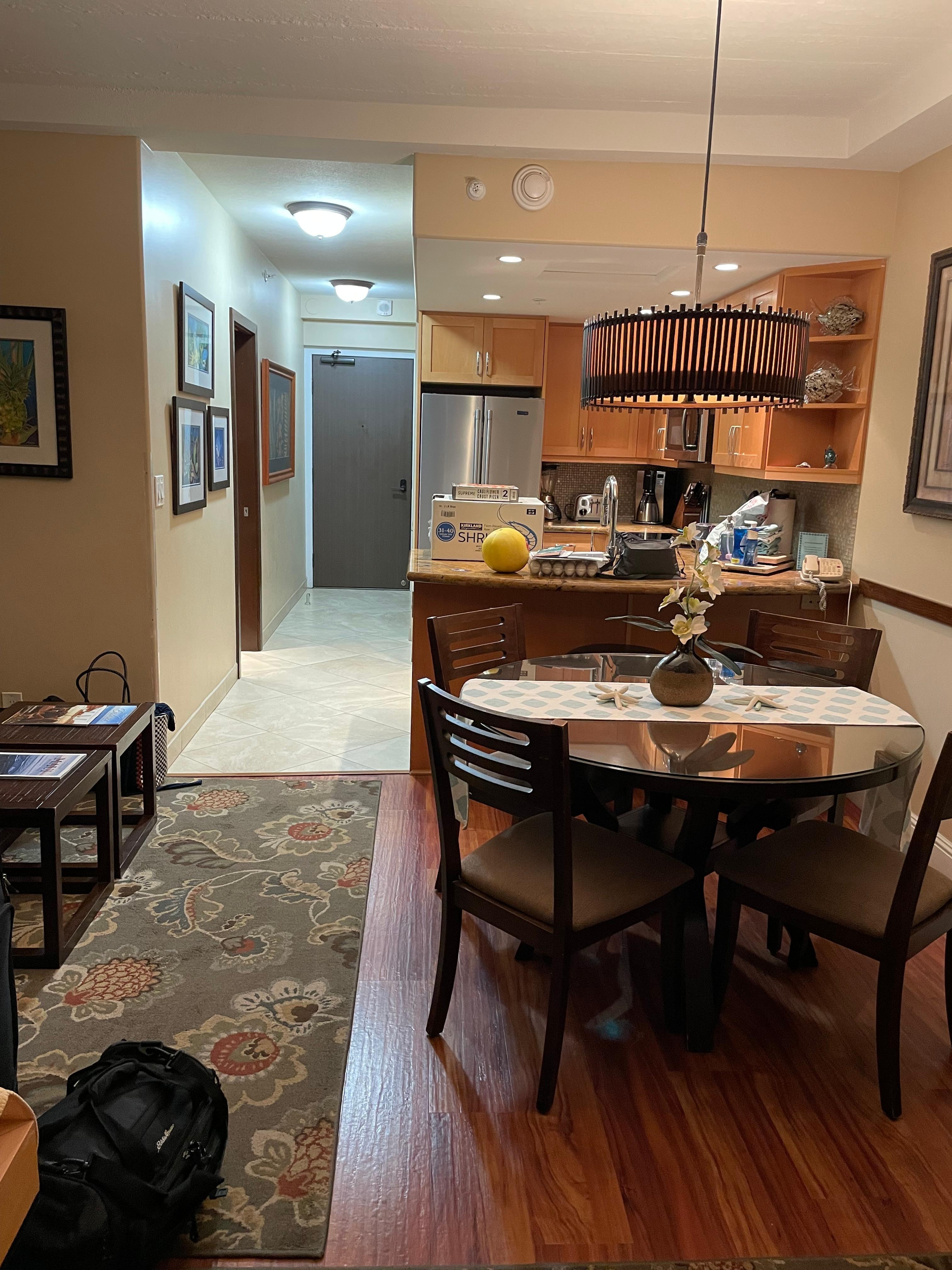 Update: Fall of 2022 we installed a Grohe hand-held shower head so that parents could more easily wash their children. In the summer of 2021 we added new artwork. In 2019 we installed a new 55” Samsung LED LCD Smart TV! It’s beautiful and has “Dynamic Crystal color”! We also installed a new modern Rohl kitchen faucet, a Rohl bathroom faucet, added new shower hooks, and bought new pans. In 2015 we did some remodeling and have made many changes to our condo including: all walls painted, four new louvered doors, new wood flooring, new chair rail, new sleeper couch with an extra large mattress, and two new bar stools. The furniture has been rearranged so the bed and couch both look directly at the TV. This provides better function and a more open feeling.