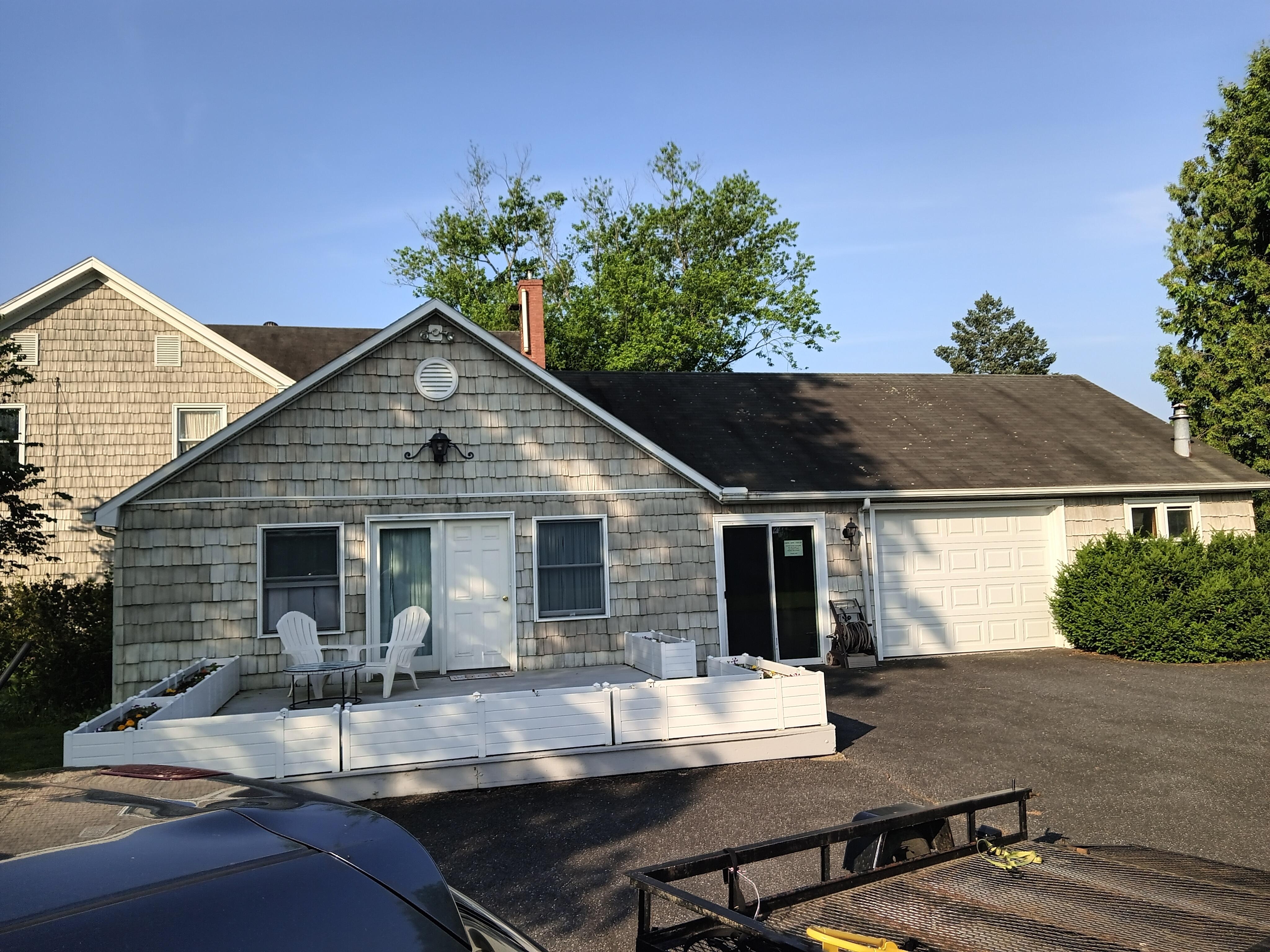 A spacious deck with chairs, patio table, and flowers leads to a private entrance. The entryway has a café table and chairs, perfect for morning coffee. A large mirrored closet provides storage, and wall maps display the action of all three days of the Battle of Gettysburg.