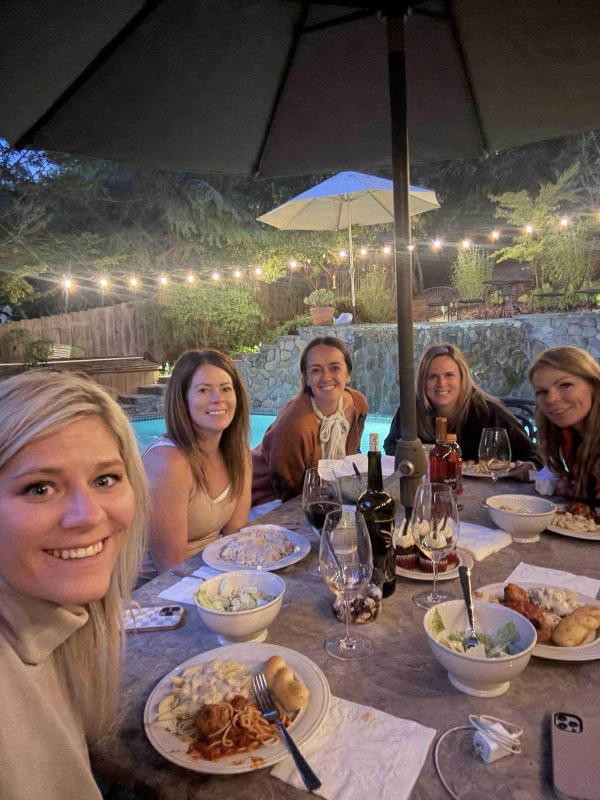 The newly refinished outside pool area has a waterfall from the upper hot tub. The large deck around the pool provides lots of room to relax and enjoy a swim and a barbecue dinner after a day of wine country experiences.