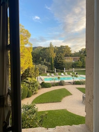 Outside, a pool house with a summer kitchen, a barbecue area and shower room; its awnings and terraces overlooking the Luberon and the village of Gordes. Then the totally secure swimming-pool, a “pétanque” area and outdoors amenities for children are an invitation to relax.