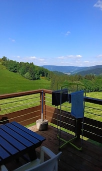 Located in the center of a triangle REMIREMONT, LA BRESSE, GERARDMER Holiday cottages (classified 2 departmental stars) in a single storey house comprising only two apartments, in a green setting (alt 700m approx) with splendid views of the valley, quiet, near the Vosges ridges and the Alsace plain.