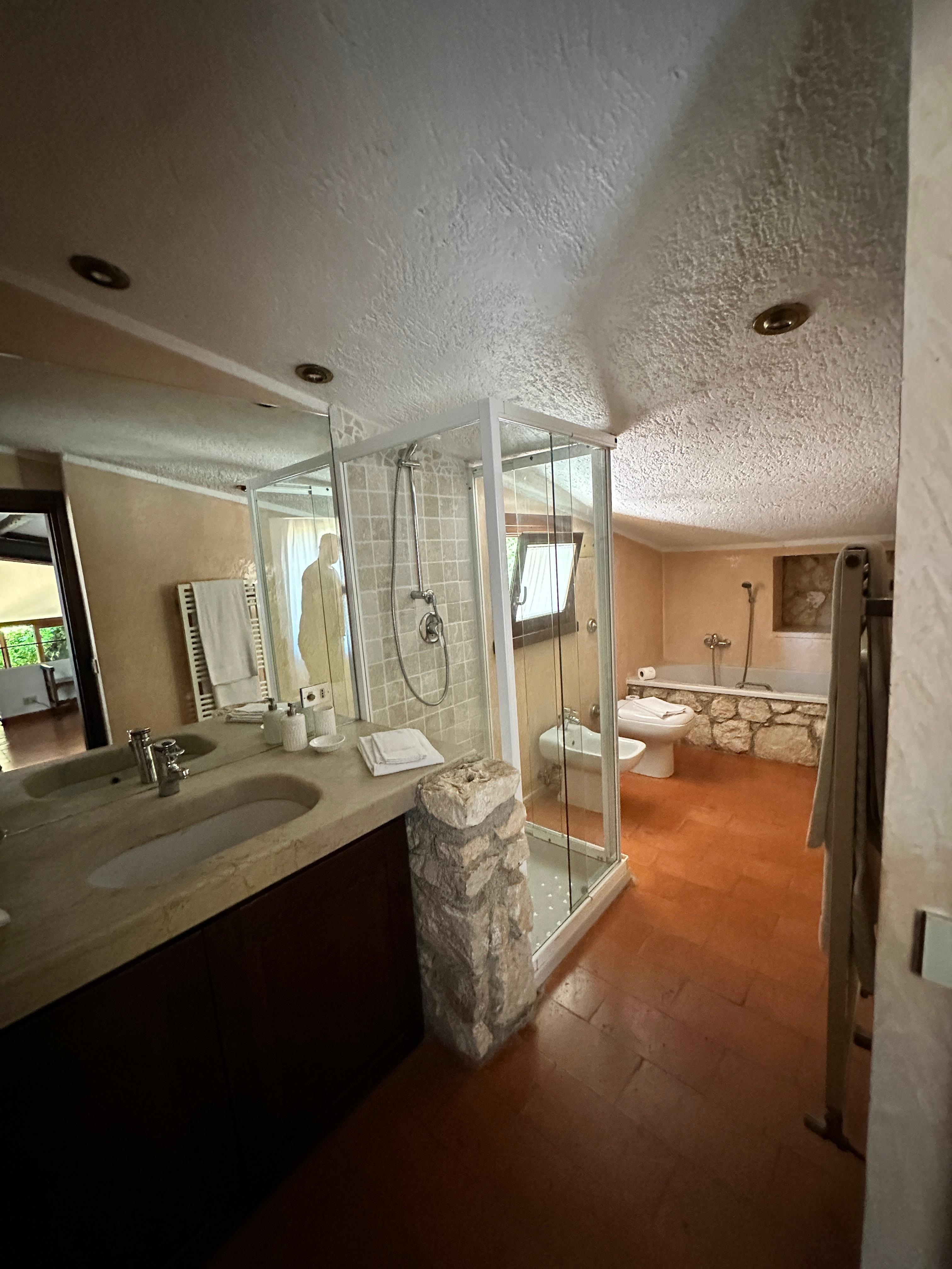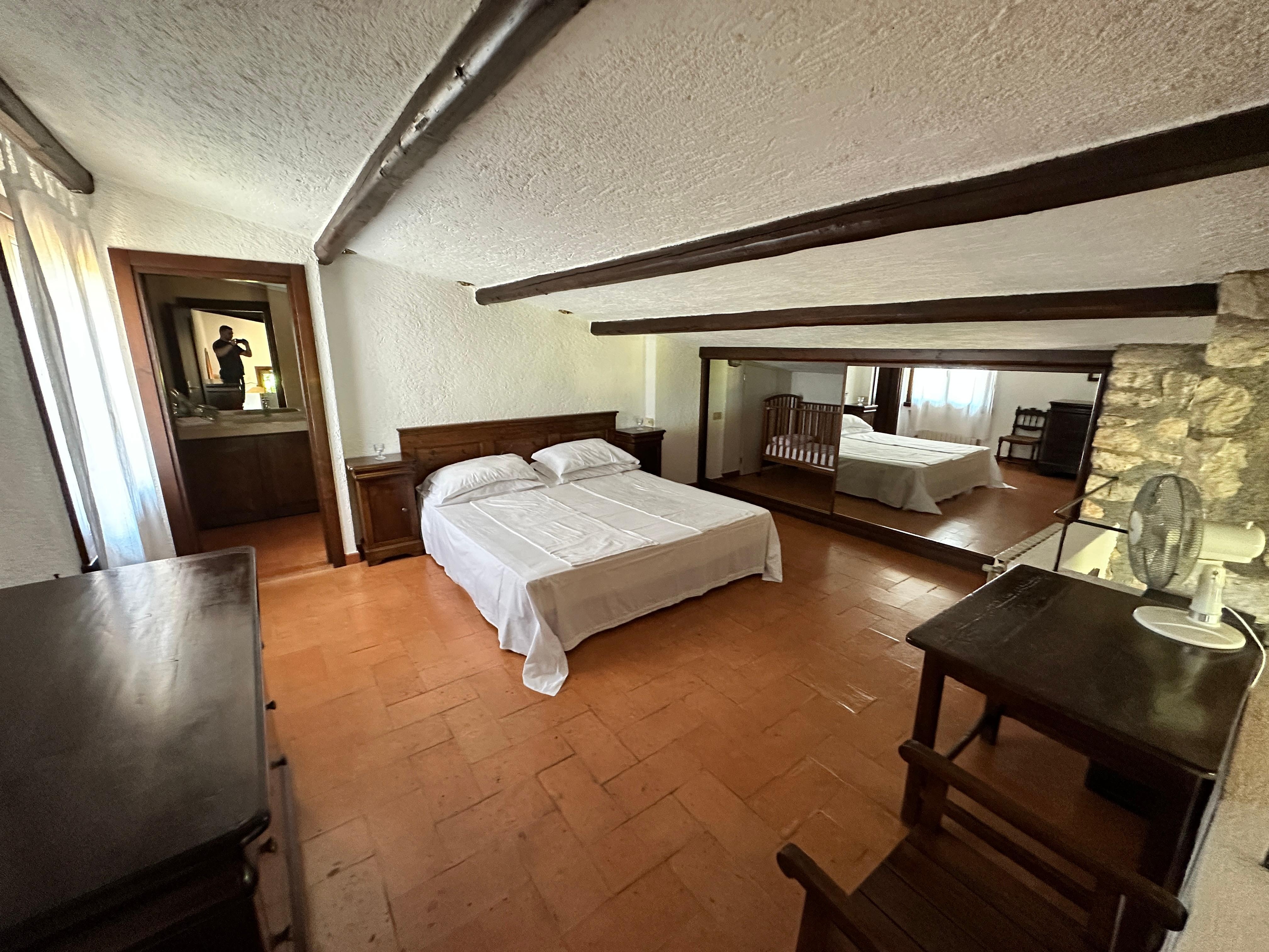 The master bedroom is on the first floor with exposed beams and a stone bathroom overlooking the garden overlooking the lake.