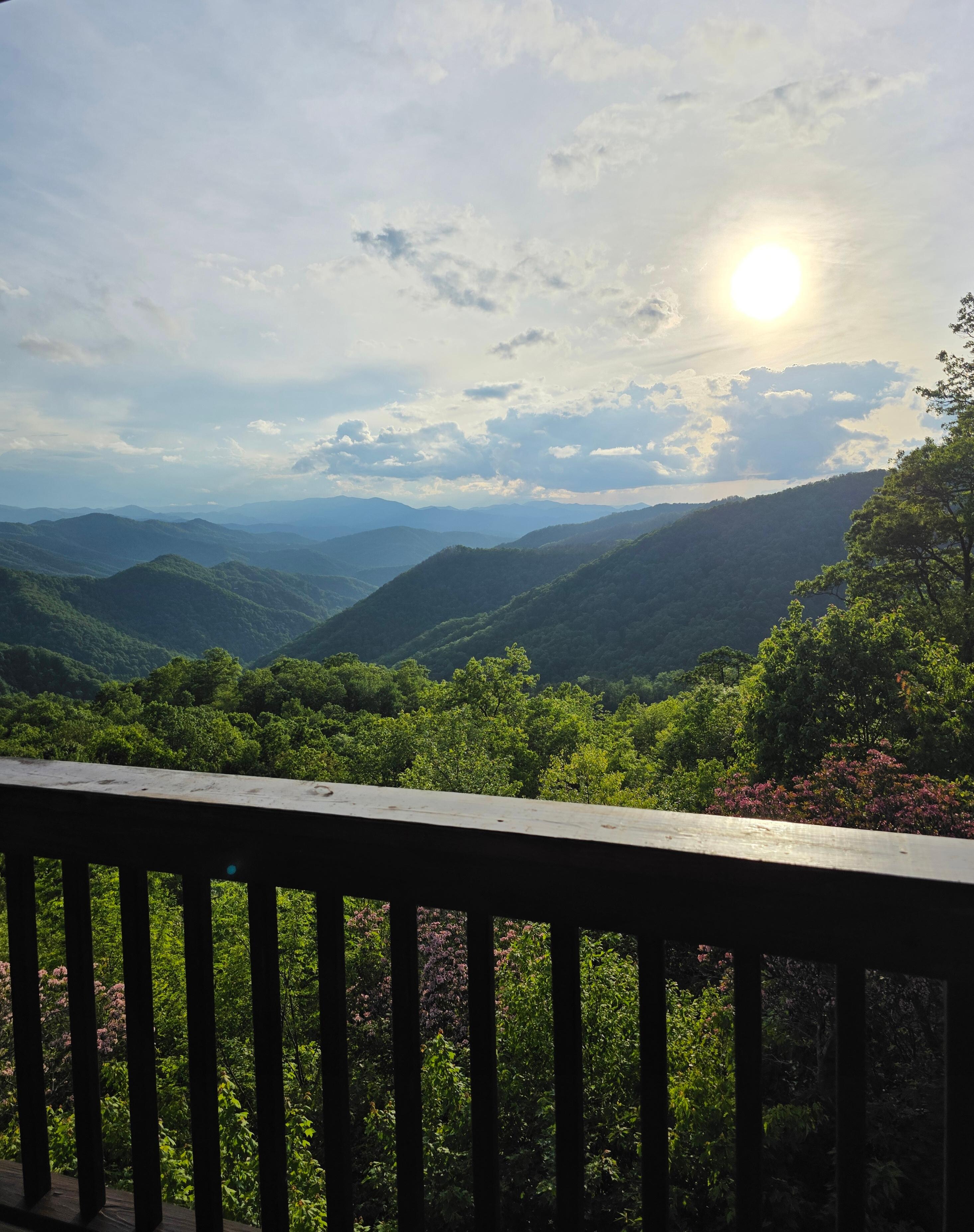 Enjoy the views from our cabin on the 3 large covered porches. On the porch you will find an outdoor stone, gas fireplace with dining table. A large hanging swing and plenty of rocking chairs to relax and take in the view.