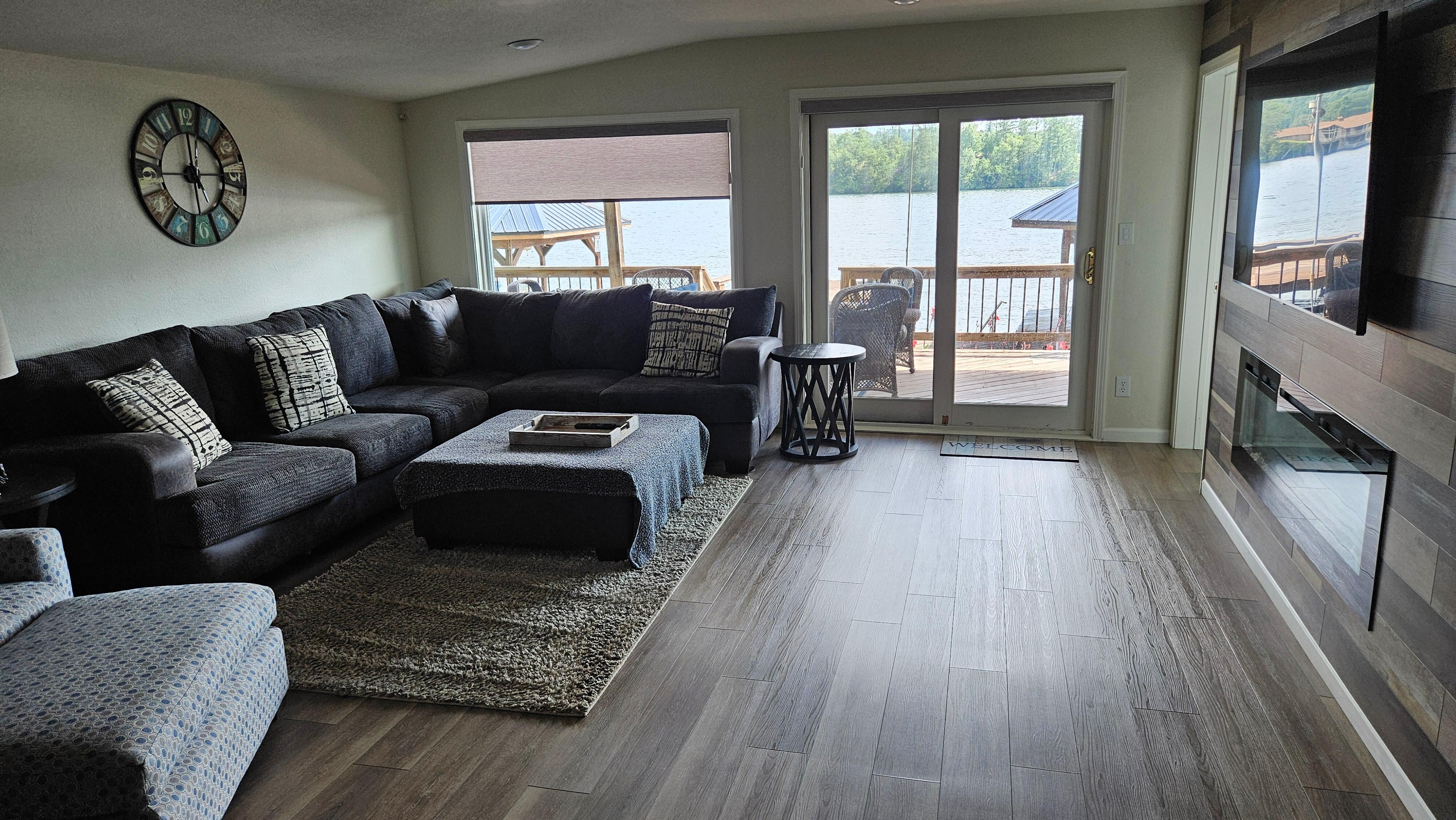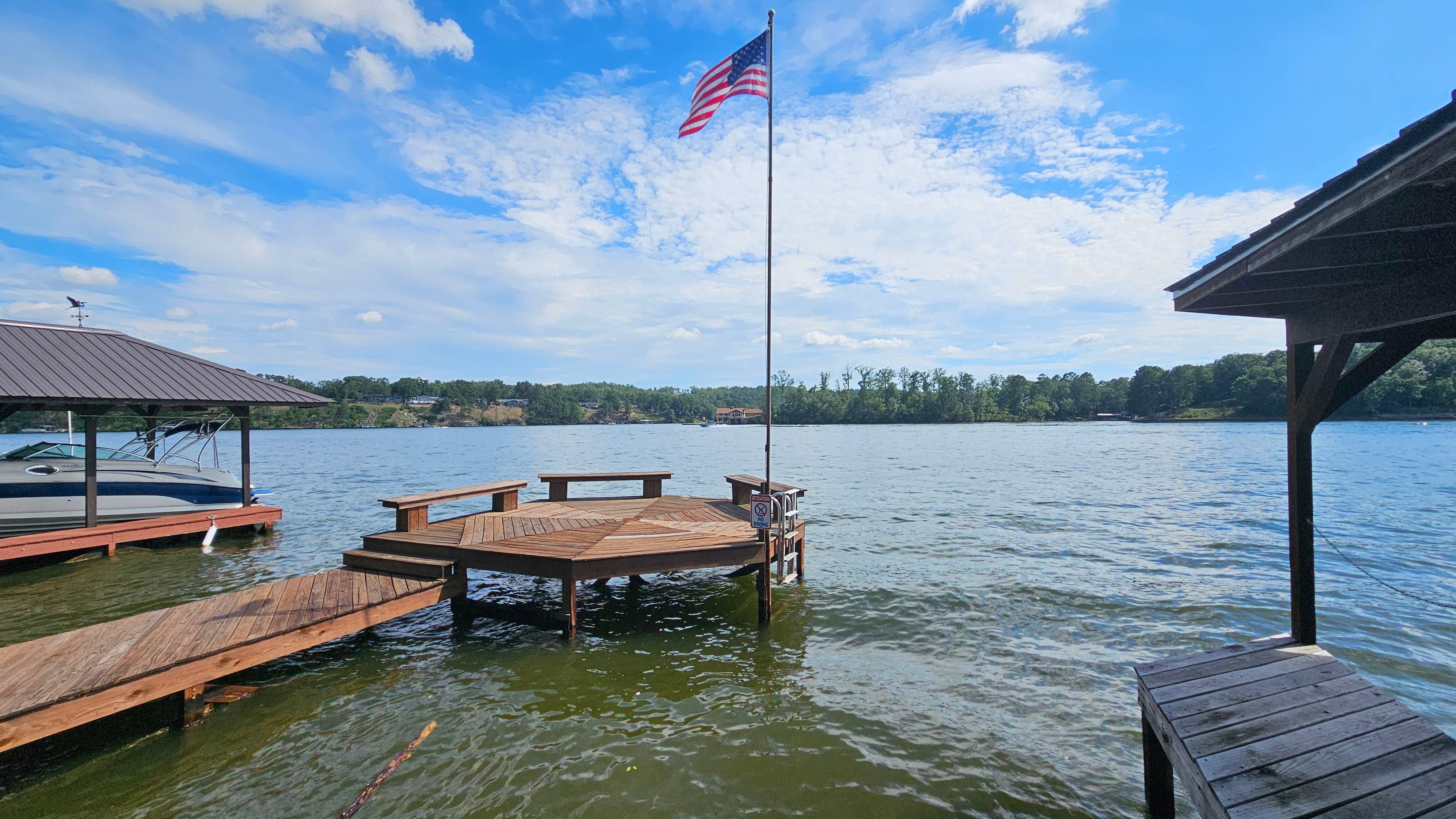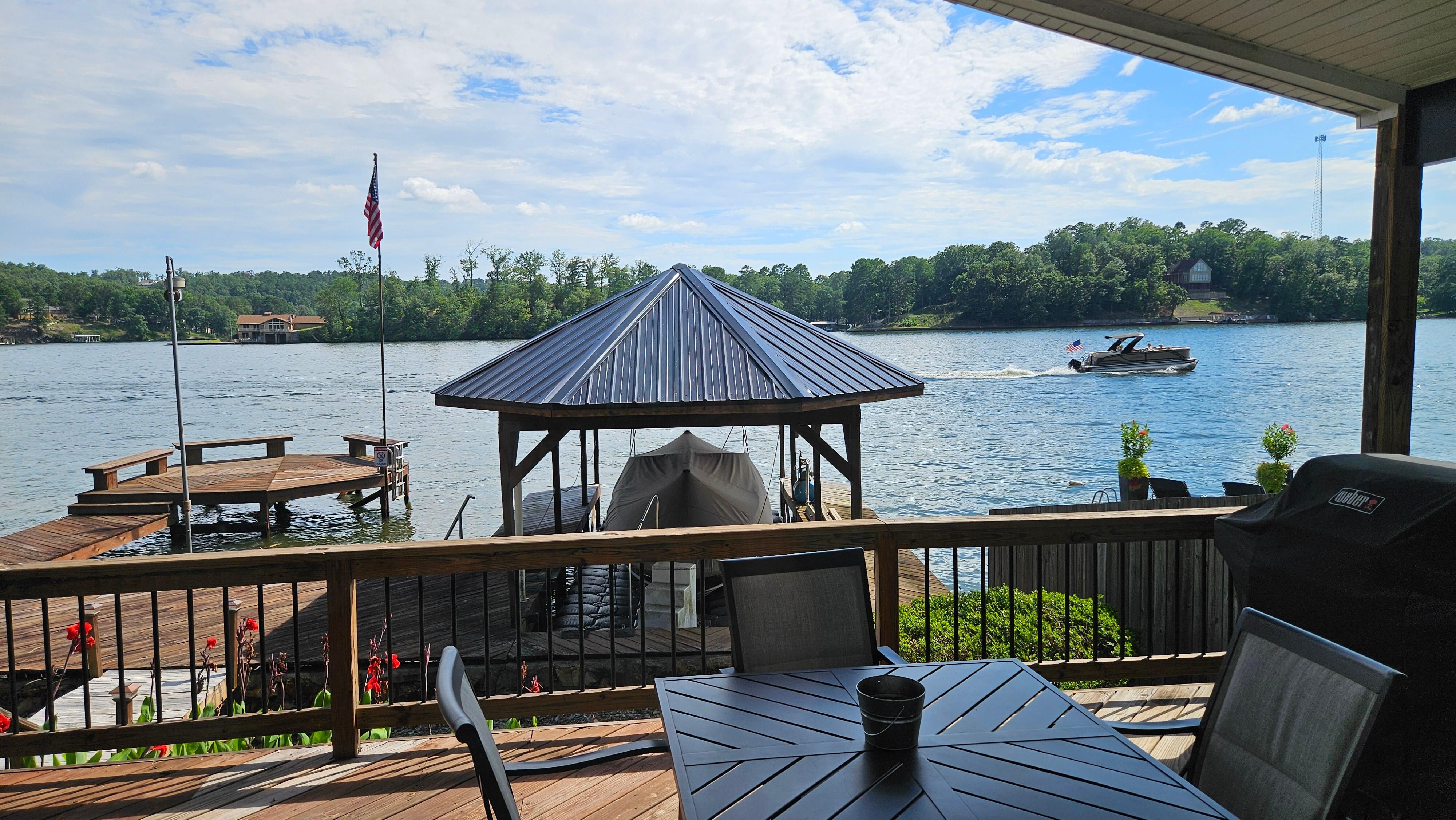 Outside you will find a private covered deck that feels like you are sitting directly on the lake with furniture and gas grill. Also you will find extra large deck and dock that extends into lake ending with a large swim platform including Chaise lounge chairs for entertaining, boat watching, sunning, and swimming. You can use the private dock for docking your boat for easy access on and off the lake. Make sure to watch the sunsets off the dock. We have the best sunsets on the lake!