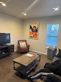 The lower-level lounge doubles as an entertainment and recreation space. Framed Tesla patent sketches line the wall behind a full-size foosball table, while a cushy sofa and patterned armchair form a comfortable sitting area facing a smart TV with Roku. Exposed beams and industrial lighting keep the atmosphere creative and relaxed, and a portable AC unit ensures year-round comfort. It’s the perfect space for family fun, rainy-day relaxation, or a late-night movie marathon.