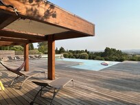 In a 3 ha property near Carcassonne, comfortable villa for 8 to 10 people surrounded by a fenced landscaped park of 5000 m2,. Very quiet and privileged location 400 m from the village center. This architect villa is recent 2007 modern, functional with complete equipment and beautiful volumes. The furniture is contemporary. It opens with a large bay of 6.5 m on a large wooden terrace of 260 m2 including 60 shaded extended by a beautiful secure and lighted swimming pool with overflow of 16m X 7m with a Californian beach of 16 m2 for children ( 0.10 to 0.60 m deep). The view is clear and exceptional on the Pyrenees and the valley. It consists of 4 bedrooms, 3 with direct access to the terrace, a mezzanine, 2 bathrooms, 3 WCs and a large living room with American kitchen (75 m²). (Hifi, 3 sat TVs, 2 DVDs, free Wi-Fi connection, bathroom beds, barbecue, teak garden furniture, hammock, table tennis). You benefit from the comfort and complete equipment of a main residence. From 900 to 2570 euros.