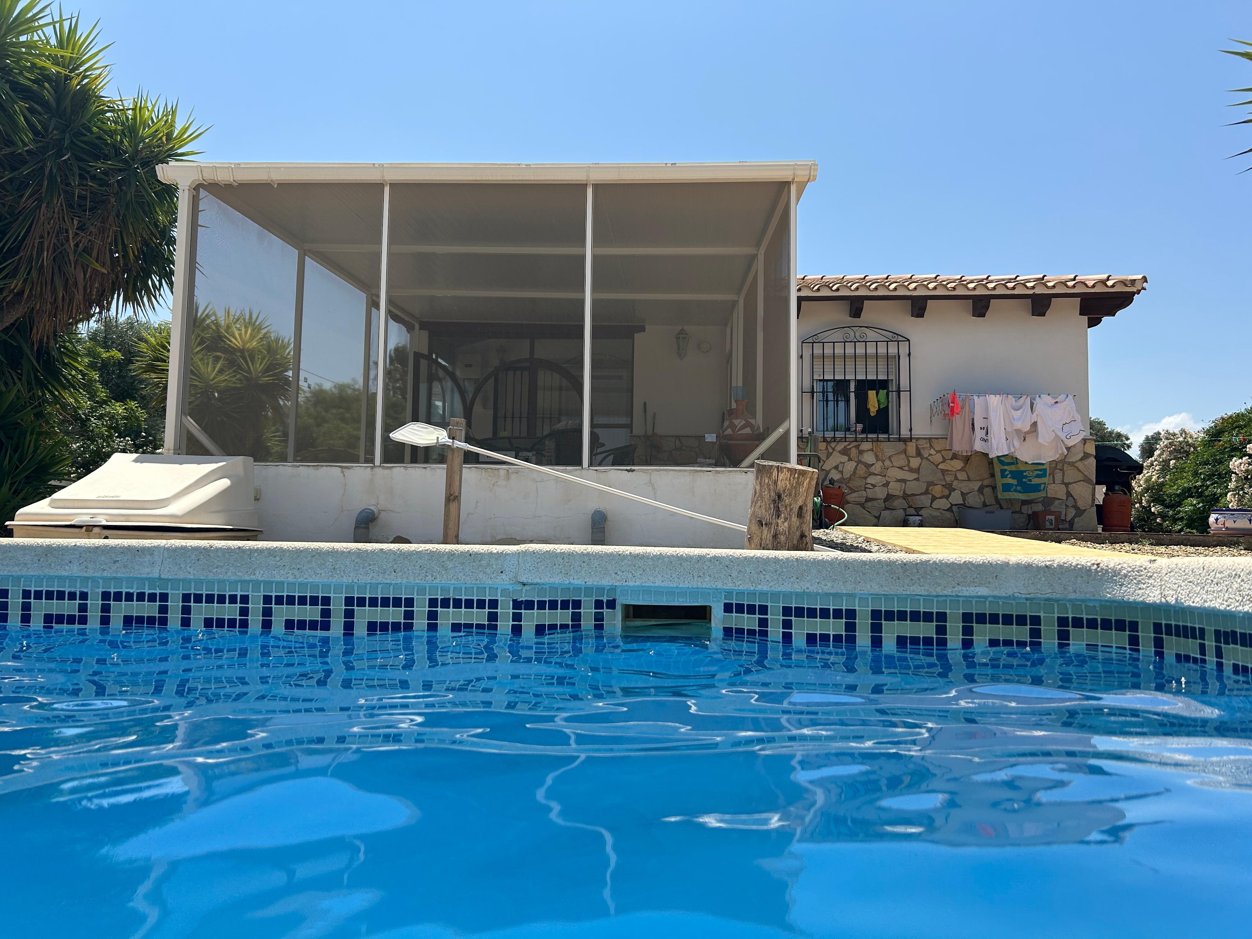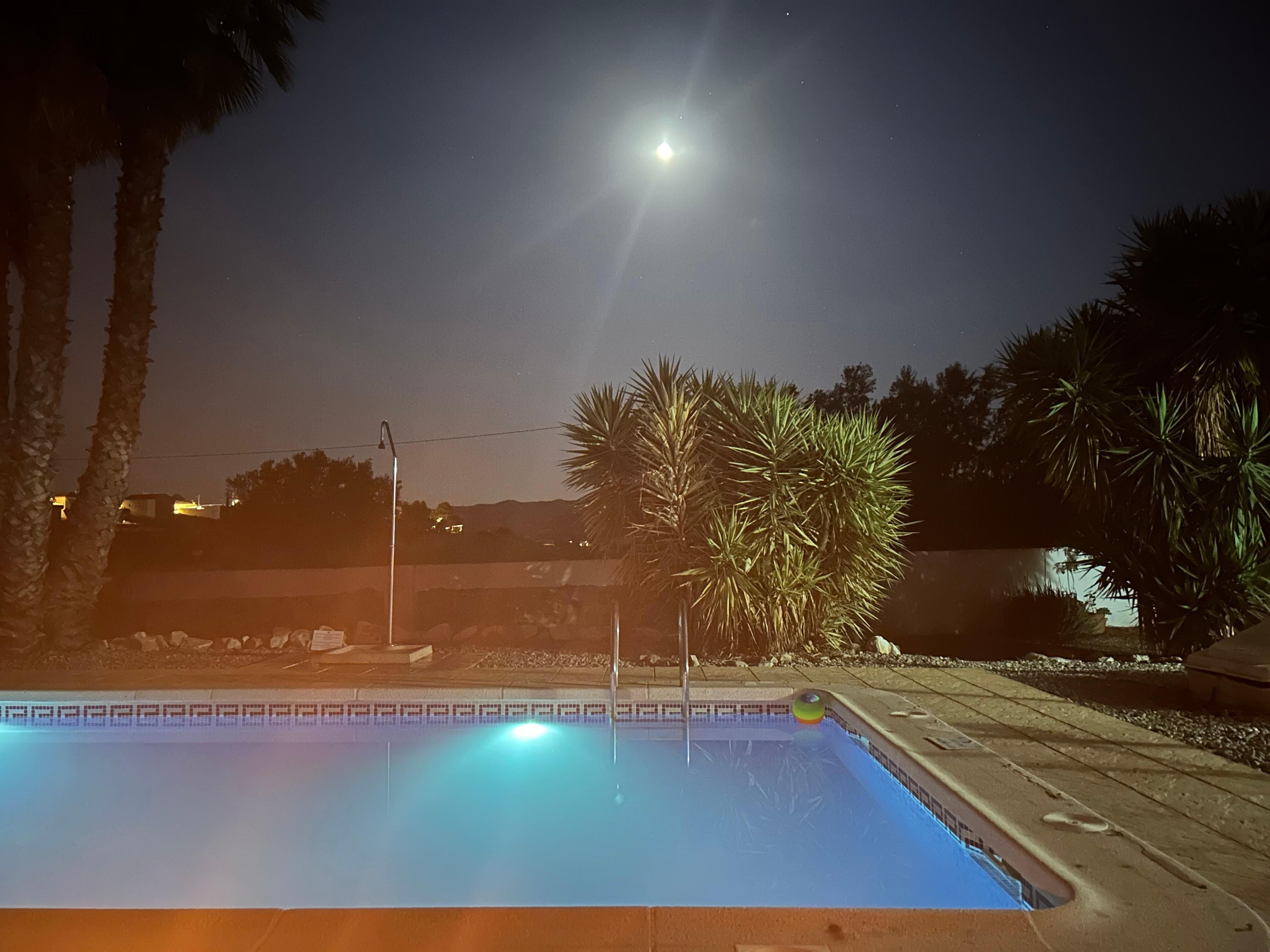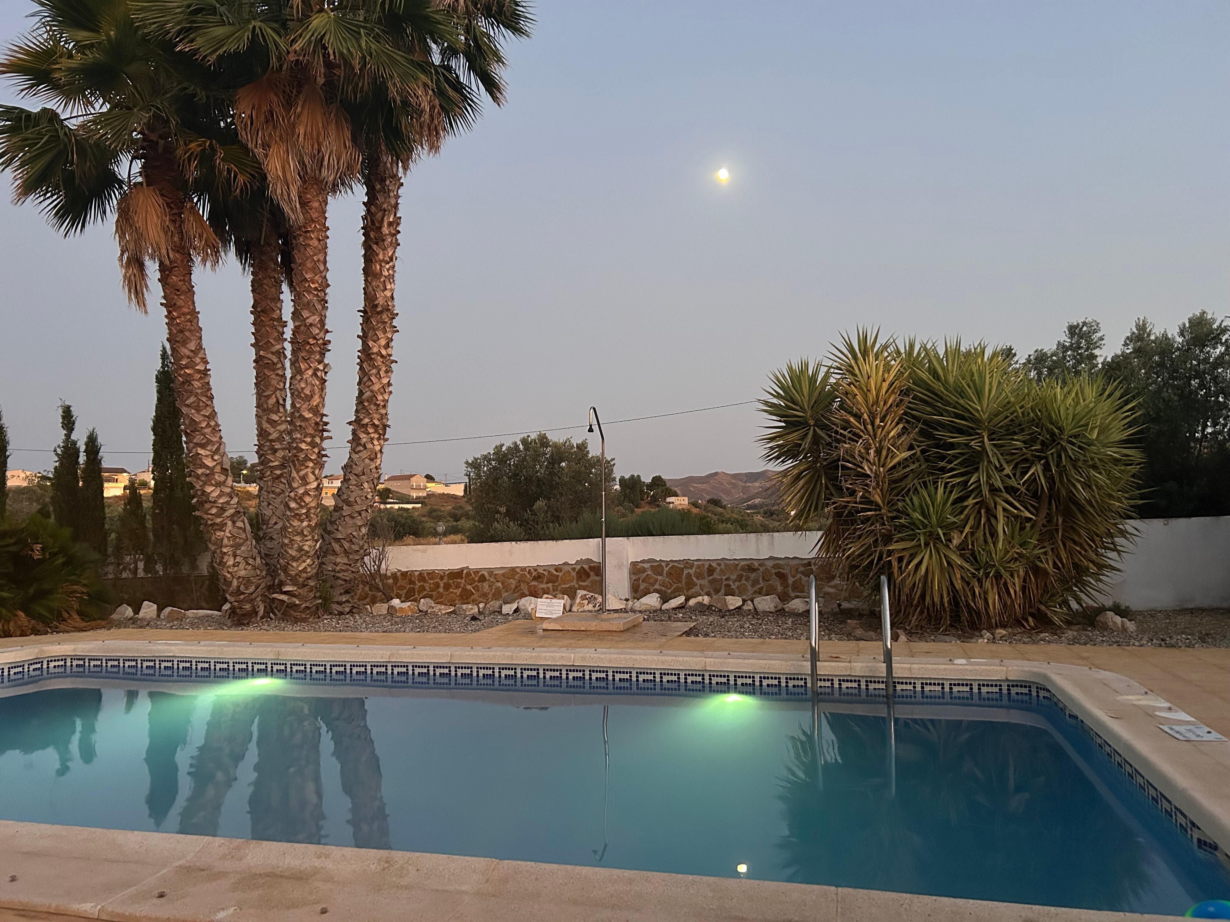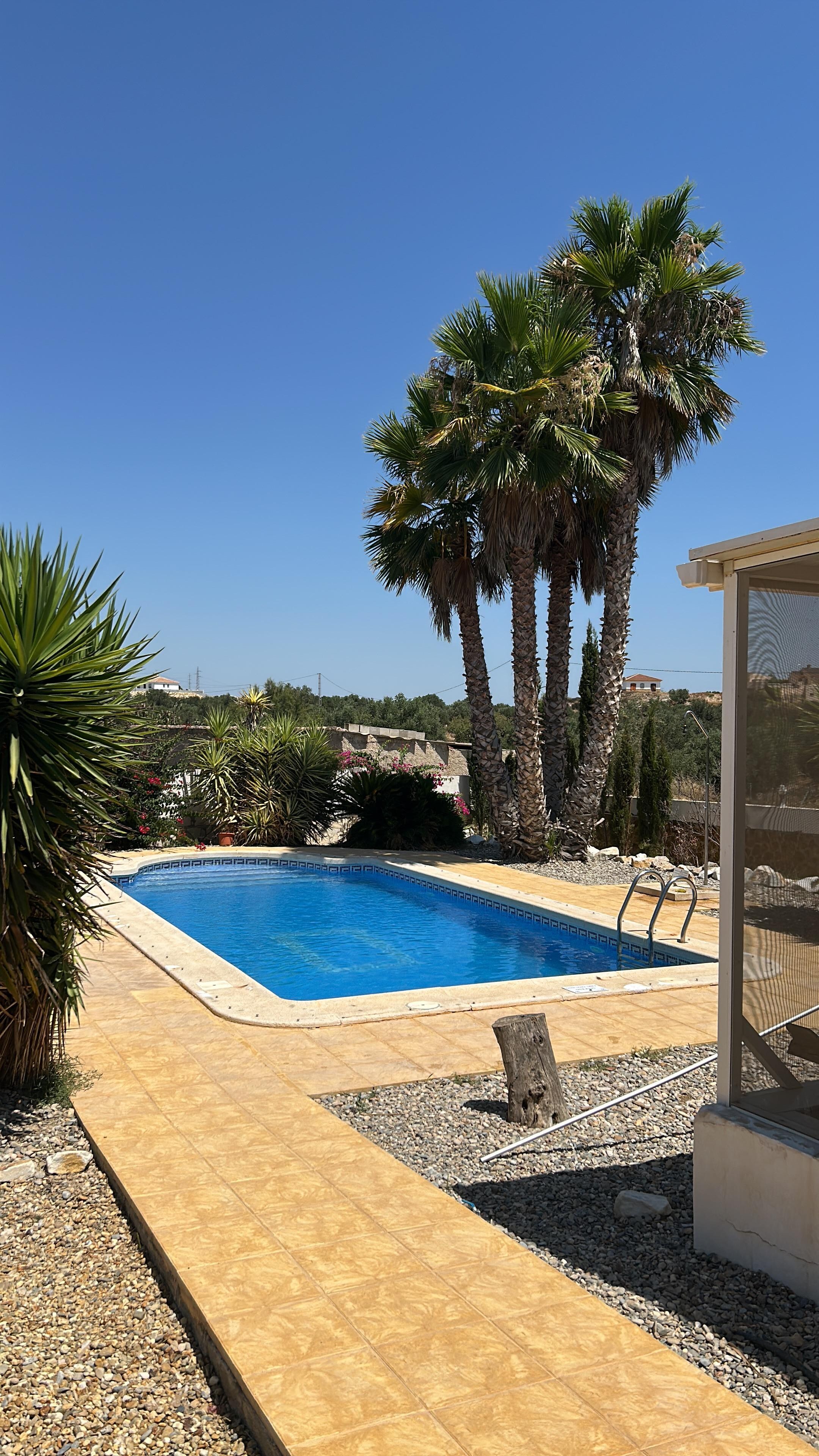 A shaded net fly enclosure overlooks the pool complete with table and chairs for alfresco dining. The pool also has a paved patio area adjacent to it with sun loungers and table and chairs, shaded by palm trees. The villa has a fully equipped kitchen with a full size fridge freezer, washing machine, gas hob, electric oven and microwave, and all the necessary kitchen utensils. Digital TV channels, DVD player and WIFI are included. The gardens, which include orange,lemon and palm trees are completely enclosed with a gated driveway.