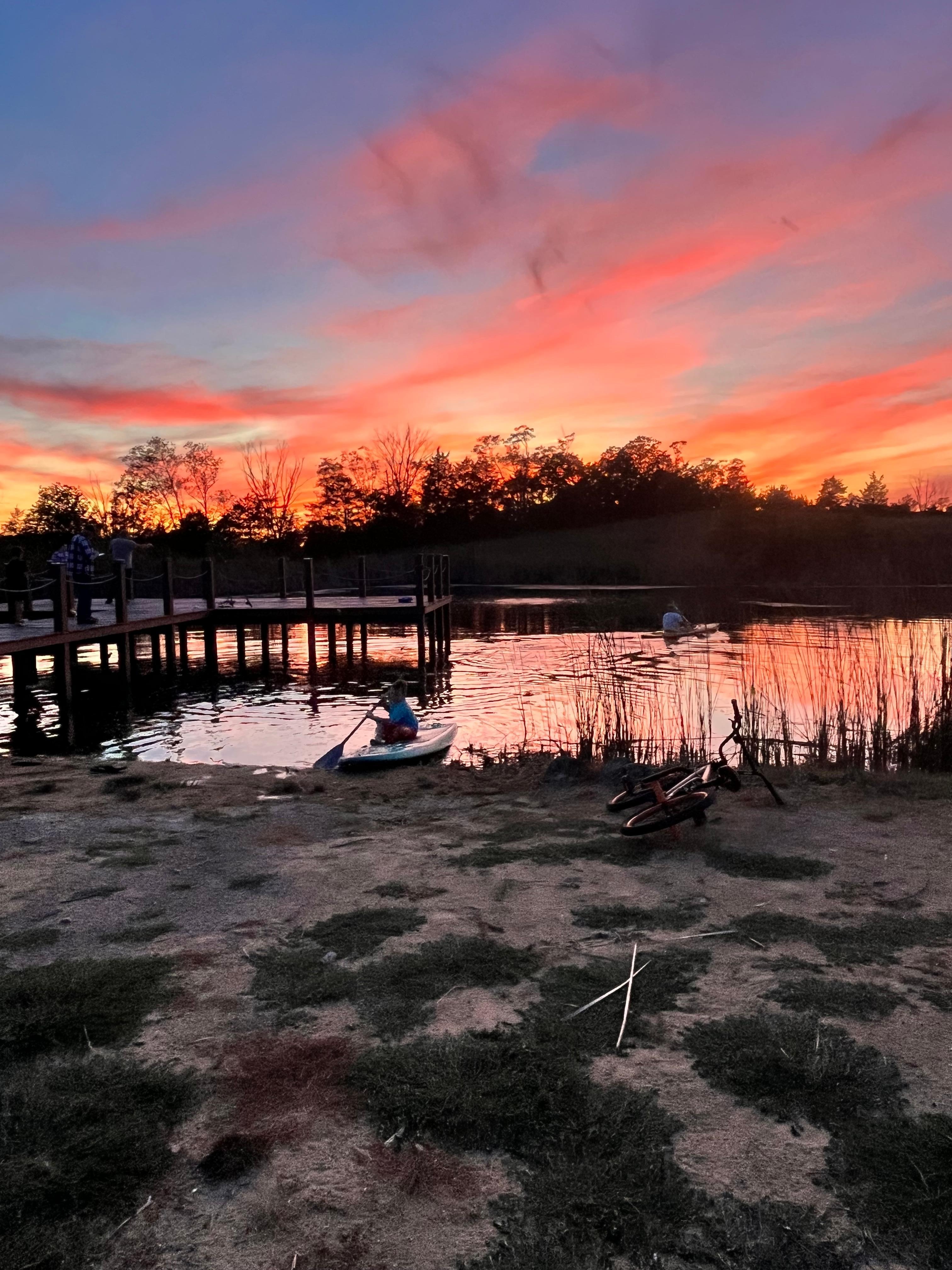 Outdoor activities include: large pond with dock and swimming access via small beach, kayak, paddleboard, fishing, playground, fire pit, hiking, cornhole and great views of the stunning sunset on a clear night!