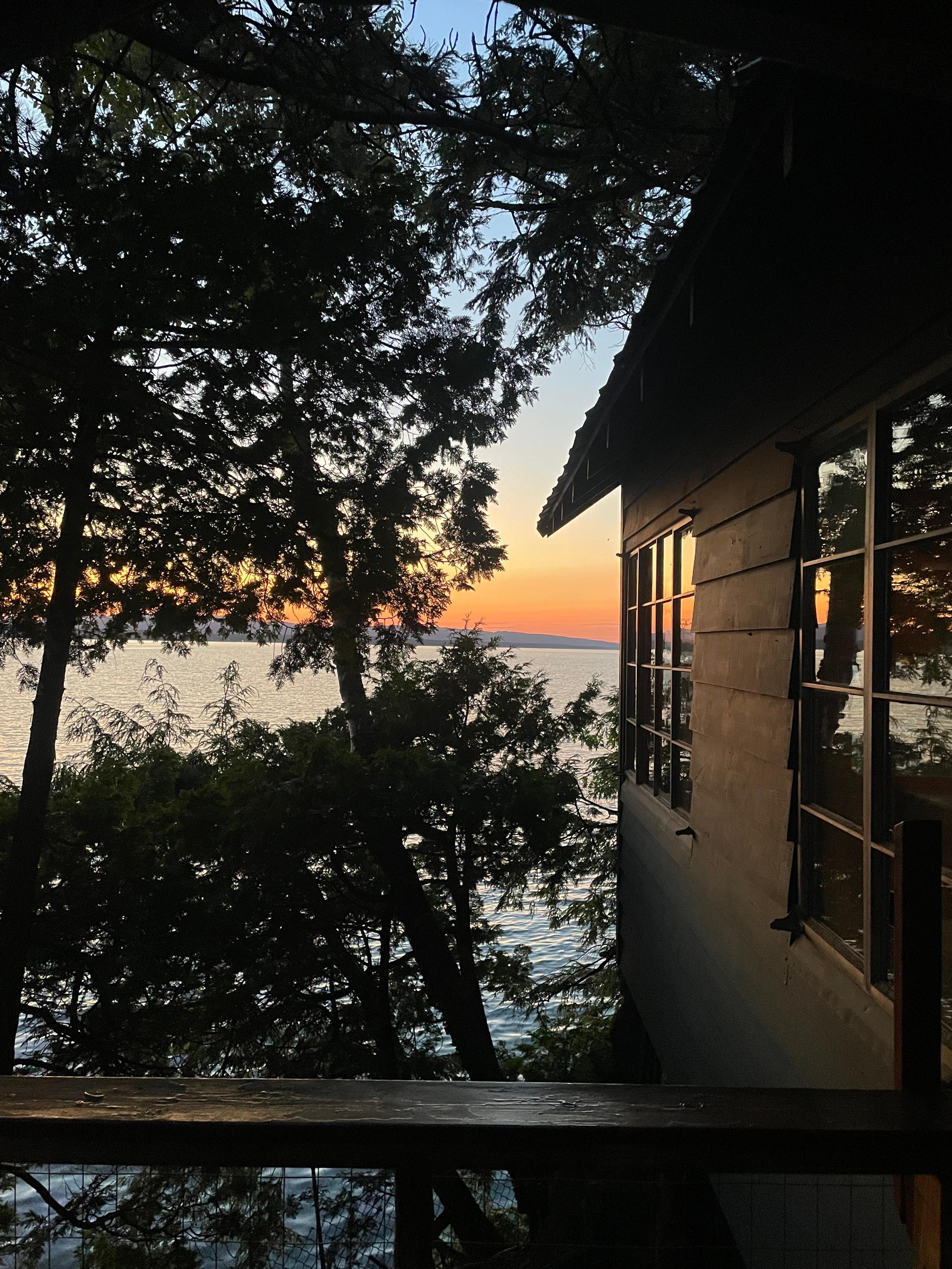 Our family's rustic, roomy cabin is located on scenic Thompson's Point, nestled among cedars with stunning views of Lake Champlain and the Adirondacks, close to the music of the waves and the clear, bright canopy of summer stars. The deck is the center of the action, with a grill and front row seats for magnificent sunsets. The great room features a full dining table, picture windows with lake view, and a newly remodeled kitchen. We have one of the few beaches on Thompson's Point and well as a dock for swimming. The cabin is close to hiking and shopping (Shelburne, Burlington, Middlebury). It's a lovely place to gather with family and friends and explore the rich cultural and natural life of the Champlain Valley and beyond.