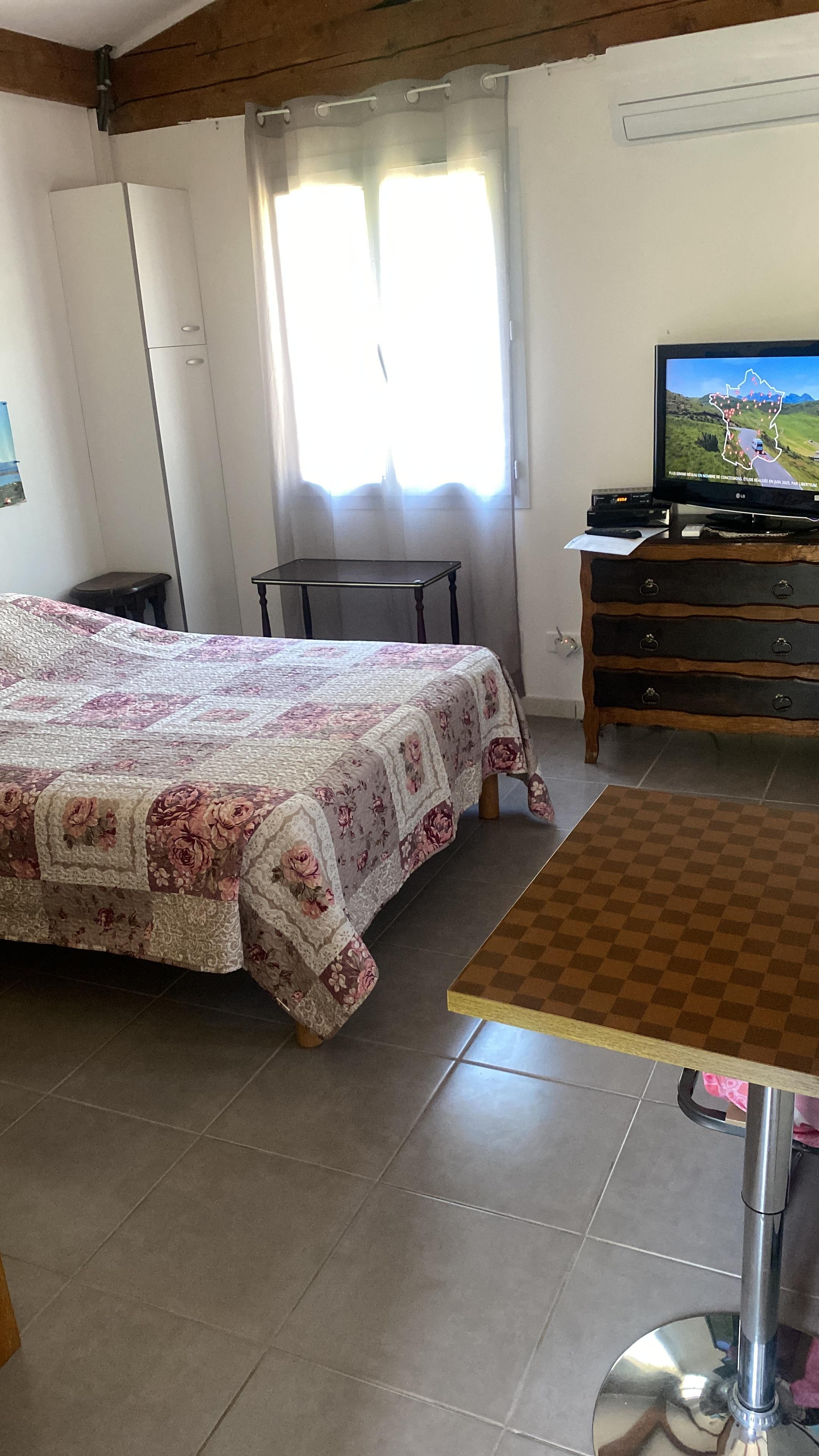 Recent studio in 1600m² property with heated 7x3.5m swimming pool (heat pump). Bed for 2 people + extra bed. Kitchen area with fridge with freezer, ceramic hob, microwave, electric oven, el. el. kettle, iron, fan. Garden table, parasol, deckchairs. Barbecue el. Shower room with shower, WC, washing machine. Television with French and foreign channels.