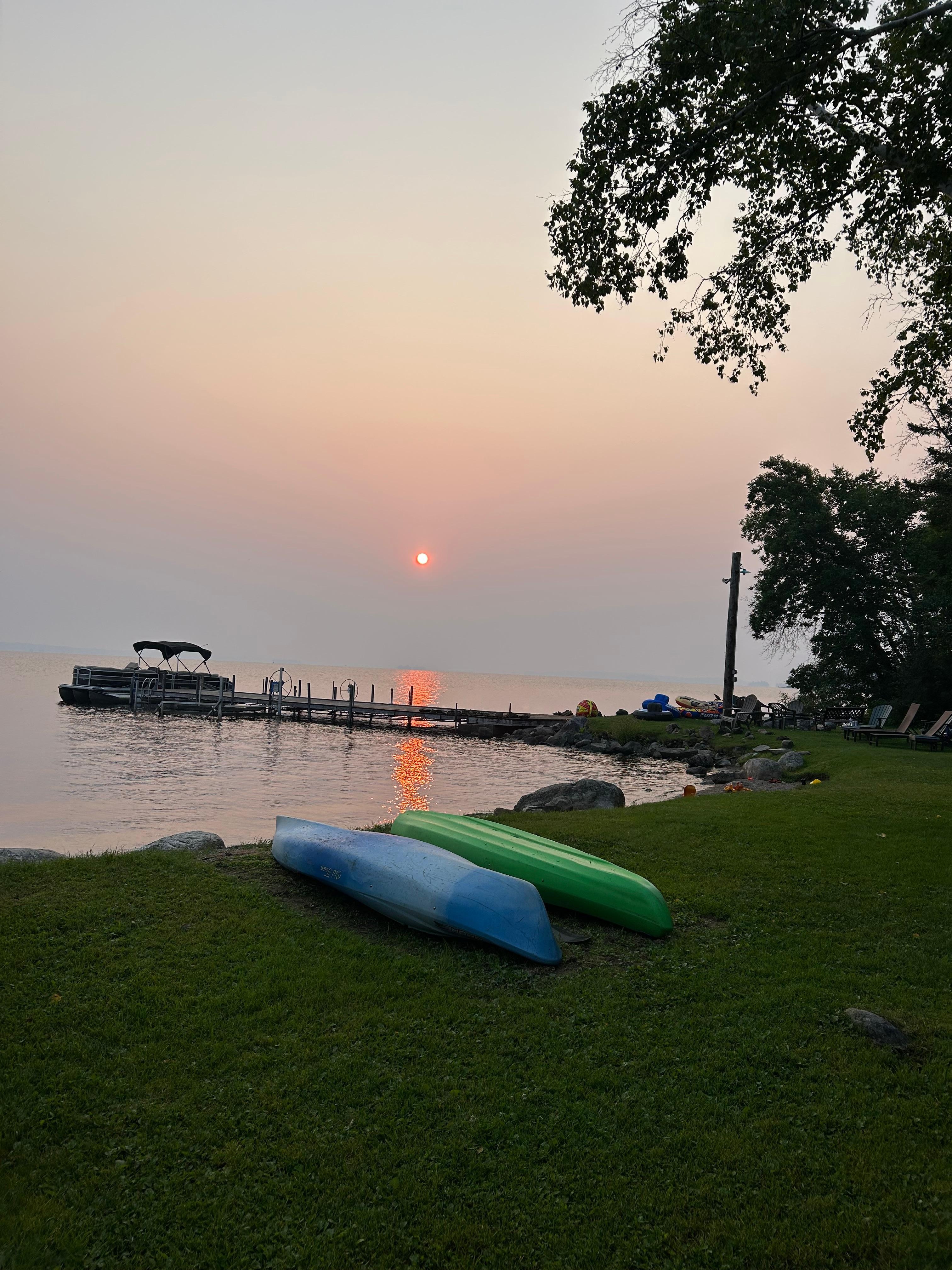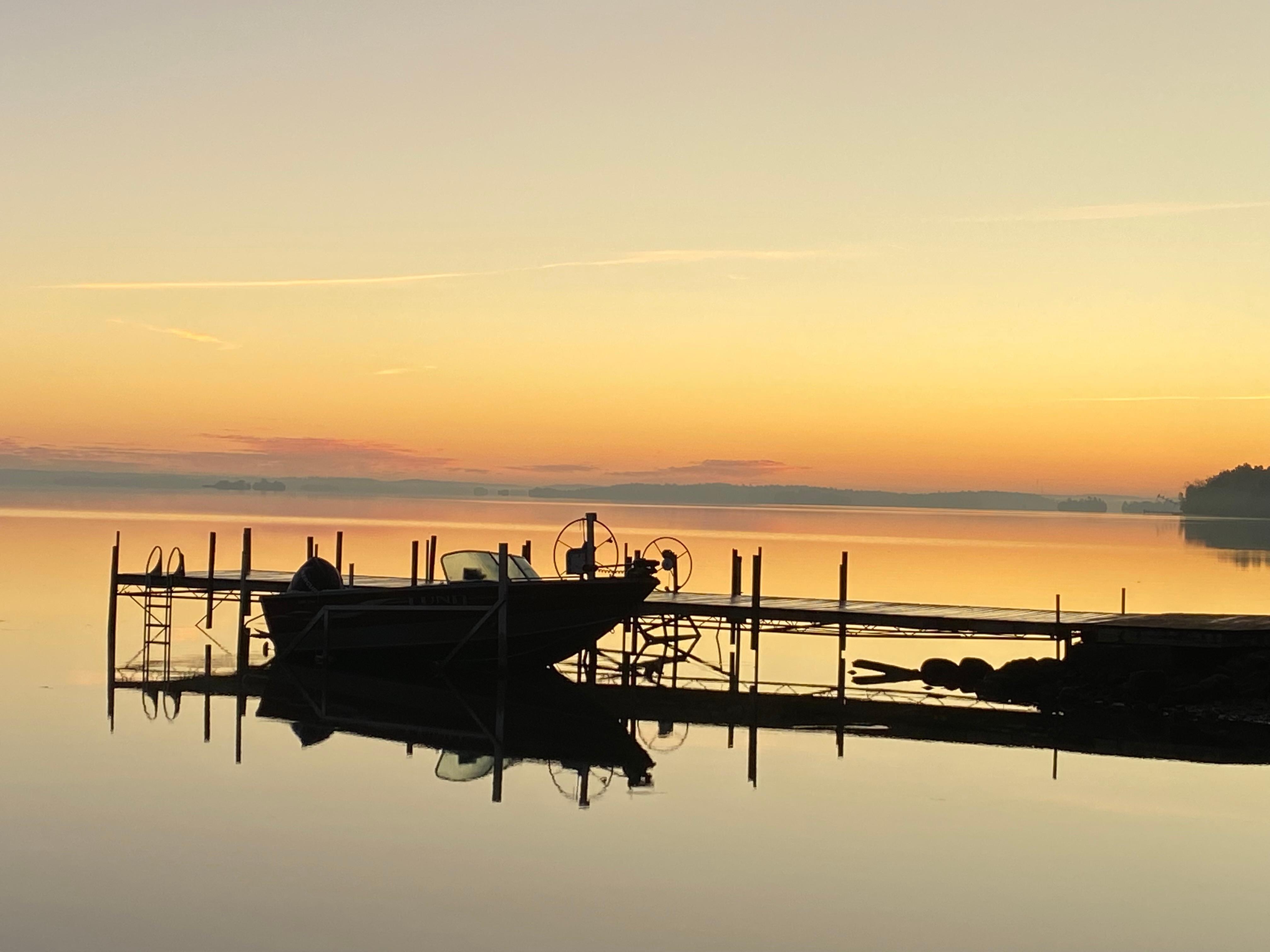 The boat lift can accommodate a speed boat or fishing boat up to 4,000 pounds. The 650 square foot cabin has a bedroom with a queen bed and another bedroom with a bunk bed and single twin bed. It's finished with a vintage pine interior with an updated bathroom, and it also has a stone fireplace. Pets are allowed, and a large deck runs along the entire front (lakeside) of the cabin. Antenna TV available with Wi-Fi streaming capability. Because the sun rises and sets so far to the north in the summer, the point is ideal for watching both--just stay up late and get up early!