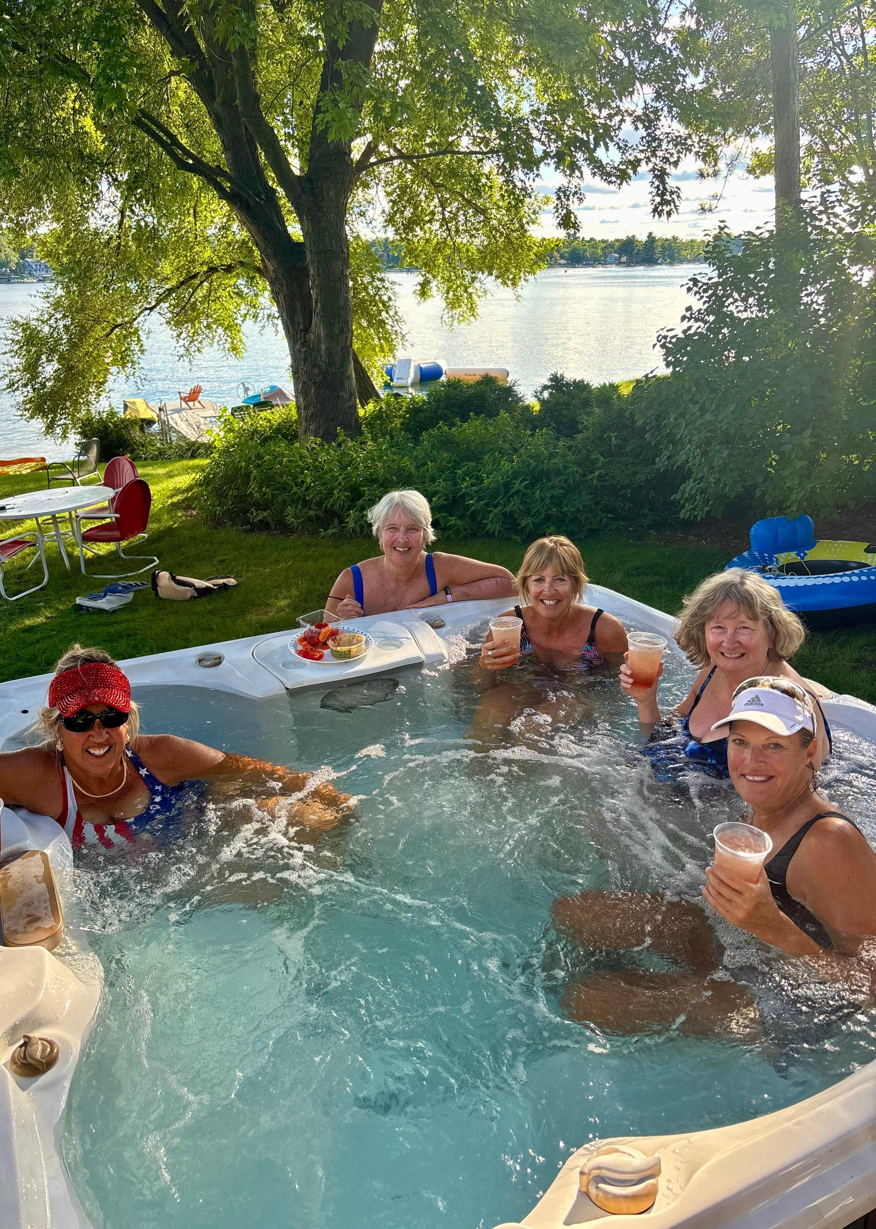 The exterior features a 7 person hot tub, outdoor shower, large deck, charcoal grill, fire pit, landscaped lot with mature trees/shrubs, large level lot to lake, and a unique 4 person yard swing constructed from an antique ski lift chair. There are only 2 steps down to the pier.