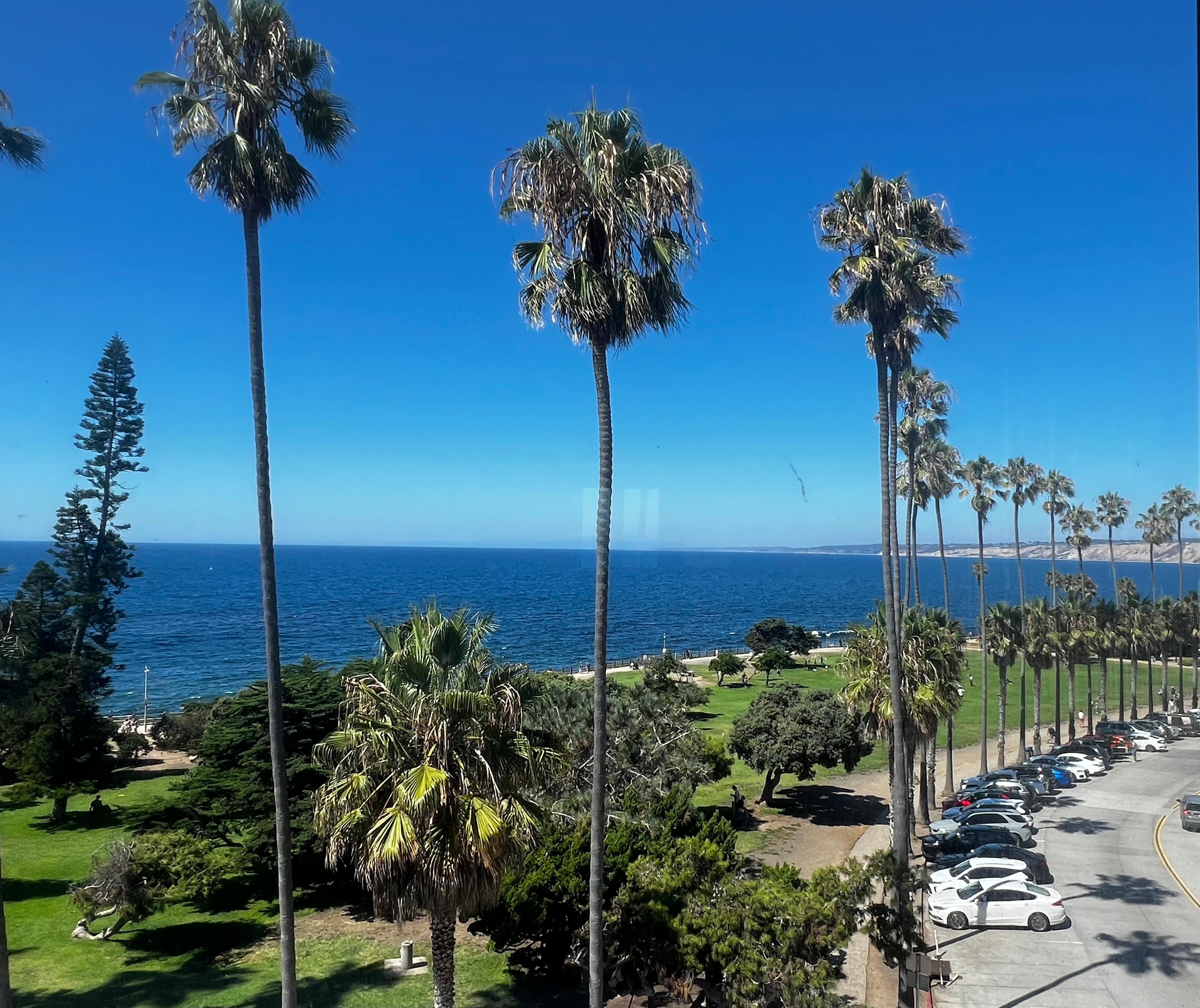 Listen to the sounds of seals barking. Walk across the street to the park with picnic tables, fire pits, lifeguards, palm trees and lawns.