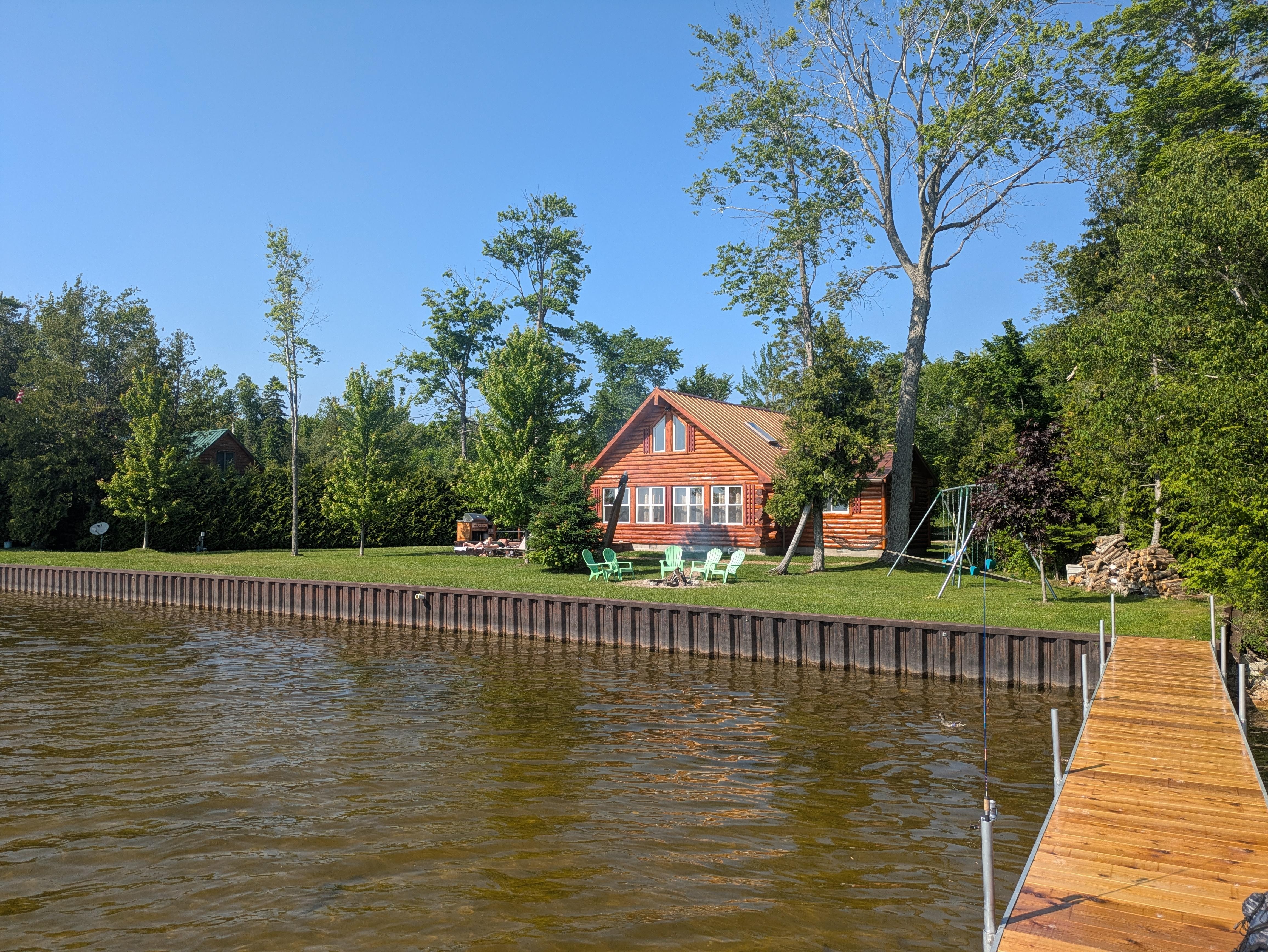 This quaint 3 bedroom, 2 1/2 bath log and knotty pine cottage is situated on 150' of frontage directly on beautiful Brevort Lake. Brevort Lake is a 4400 acre swimming and fishing lake nestled in the Hiawatha National Forest. 85% of the lake is federally owned, making it quiet and protected by a tree-lined waterfront. The cottage, named The Fish House, is decorated and appointed to meet your every desire during your vacation at the lake. While relaxing outdoors in the secluded park-like setting you will delight in pristine sights and sounds including eagles, loons, swans, as well as breathtaking sunsets and sparkling night skies. A spacious brick paver patio overlooks the lake and a paver pathway surrounds the cottage. Outdoor ammenities include a school yard swingset, hammock, patio furniture, gas grill, fire pit, boat dock and mooring, and two kayaks. The upstairs master suite has a king luxury bed and private half bath while two additional downstairs bedrooms contain two twin luxury beds each, for a total sleeping space for six people. All bedding and bath linens are furnished. The main floor is cozy and inviting with hardwood floors and knotty pine walls, a full window wall for viewing the lake, game table, satellite tv, and a fully-equipped kitchen. We also offer a fully-equipped laundry room, supplied with beach towels. Boat rental is available from the Hunt and Fish Shop in Curtis and delivery can be made to the public boat launch on Brevort Lake. Many day trips and sightseeing excursions can be enjoyed from the comfort of your home away from home while you explore the wonderful upper peninsula!
