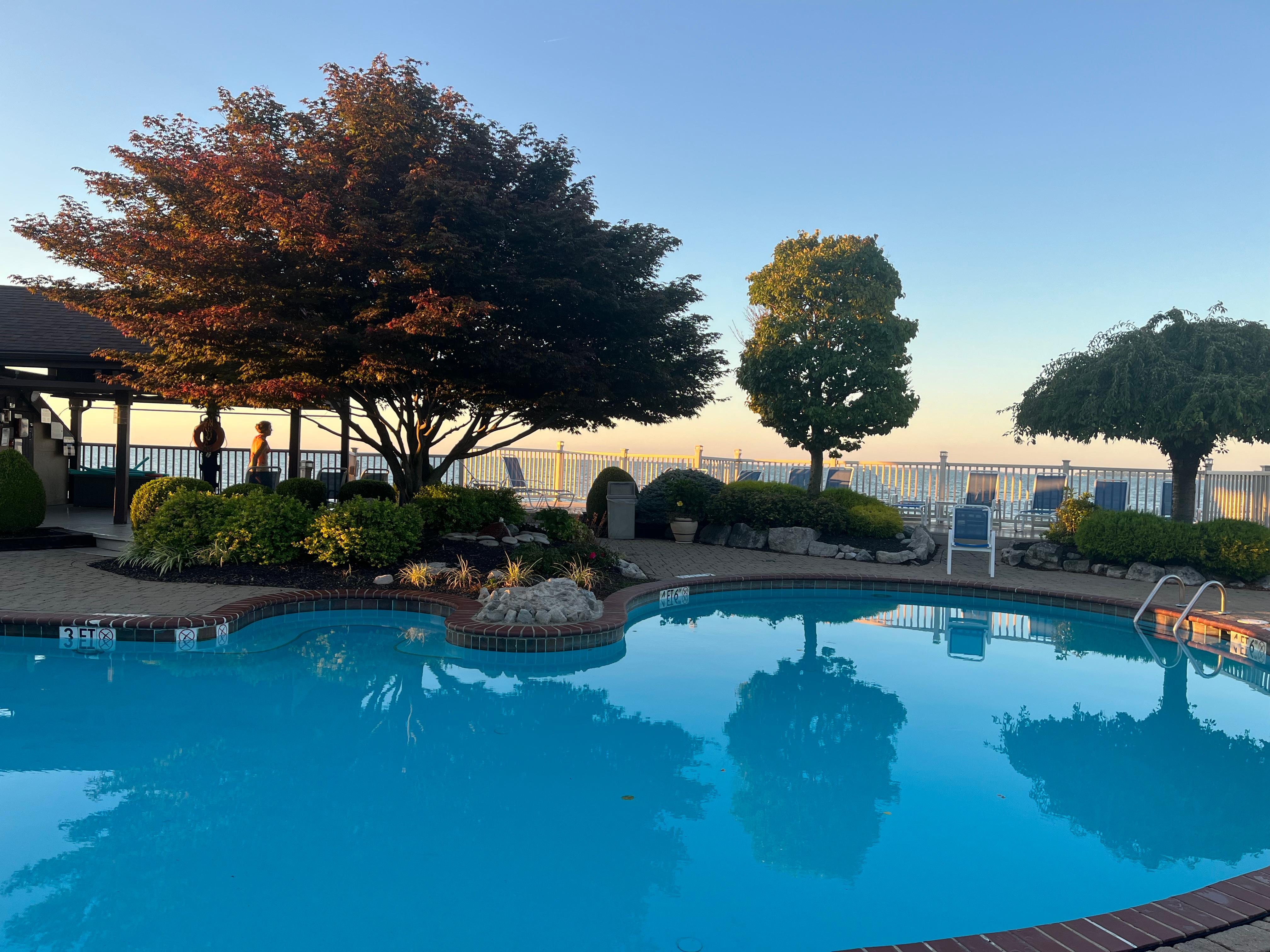 The view from the balcony of our home is of the lake, the pool and hot tub area, but most beautiful, the newly added paver outdoor fireplace area.