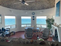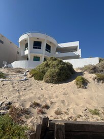 Perched on a dune above the beach, this artistically designed house has panoramic views that bring the ocean to you. The fully stocked kitchen opens into the spacious "great room" with a boveda ceiling, wrap around windows, and fireplace. The adjoining balcony is a perfect place for reading, cocktails, viewing the beach below and just hanging out. It's also an ideal spot for watching the osprey and pelicans flying. The bedroom on the entry level has a queen bed and an adjoining bath/shower. Downstairs is the "open" middle bedroom with two twin beds and opens directly out to an exterior deck. This open/twin bedroom is not a private room. Adjacent to the open/twin bedroom is the master bedroom with a king size bed and ensuite bath/shower with ocean views and a private patio space. Both bedrooms downstairs open to an expansive deck with a private stairway to the beach. Down the stairway to the beach is a palapa where you can spend the day by the beach, shaded from the sun and cooled by the ocean breeze. The house has a two car garage and a roof/stardeck ideal for night-sky-gazing. There is WiFi, a TV for streaming, and the DVD player in the great room.