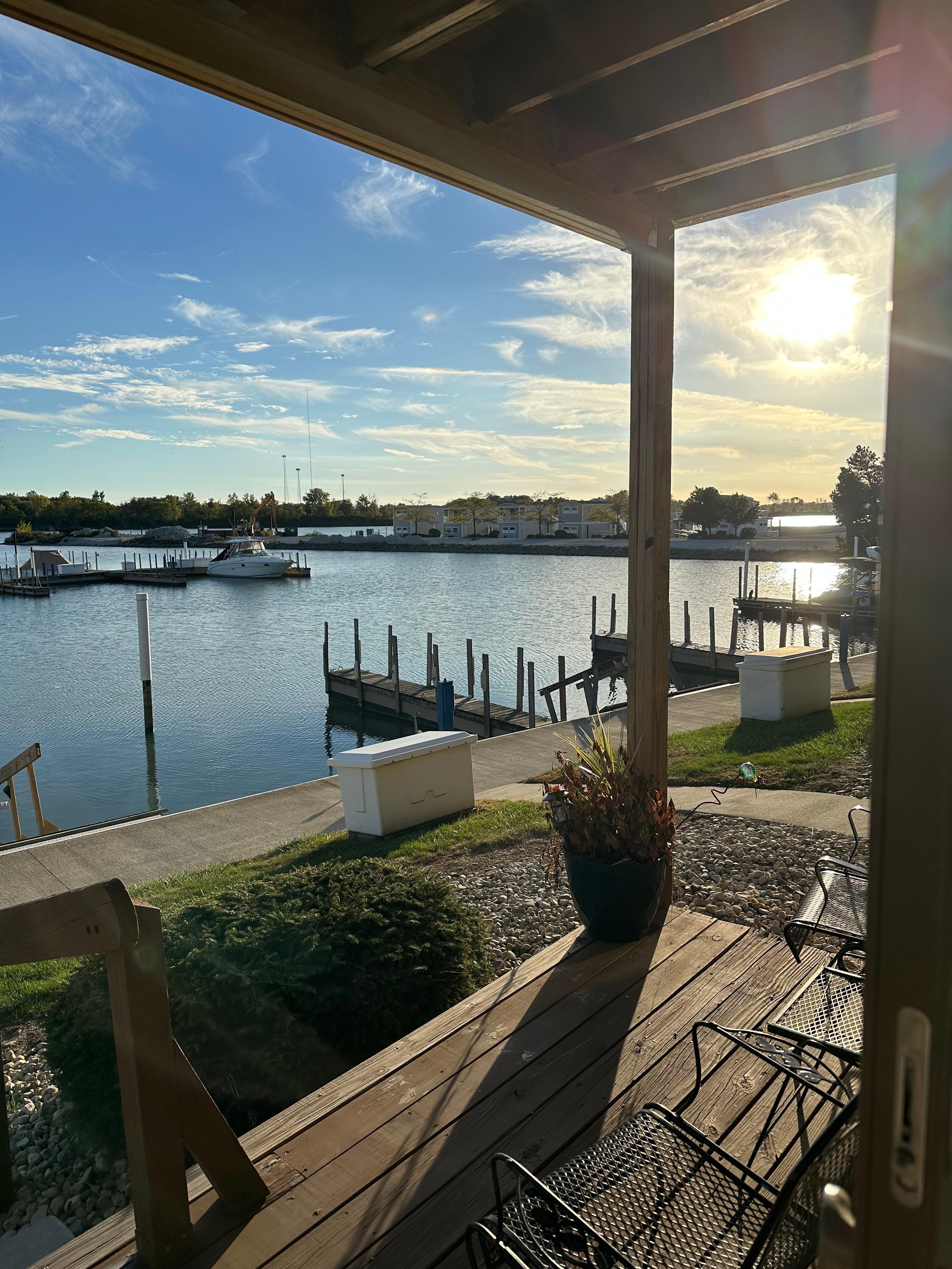 Enjoy this clean and comfortable FIRST FLOOR unit with parking right out front (One of the few in Port Clinton). No hassle of climbing stairs. Pool and Hot Tub across from Condo. This condo sleeps 5 and has 2 bedrooms and 2 bath. One queen bed in master bedroom which has its own bathroom and a bunk bed that is a full on bottom and twin on top in second bedroom. Mattresses were replaced in 2022. There is also a queen size pull out sofa bed. The condo overlooks the Portage River and is walking distance to Jet Express, fishing charters, beach, jet ski rentals, downtown Port Clinton and several restaurants and night life. Enjoy your morning coffee or evening beverage on the back deck watching the boats pass in the harbor. The complex has a beautiful pool and hot tub with plenty of pool chairs, playground, picnic tables and gas grills. This condo is a great place to stay for your couples getaway, weekend with friends and family vacations!