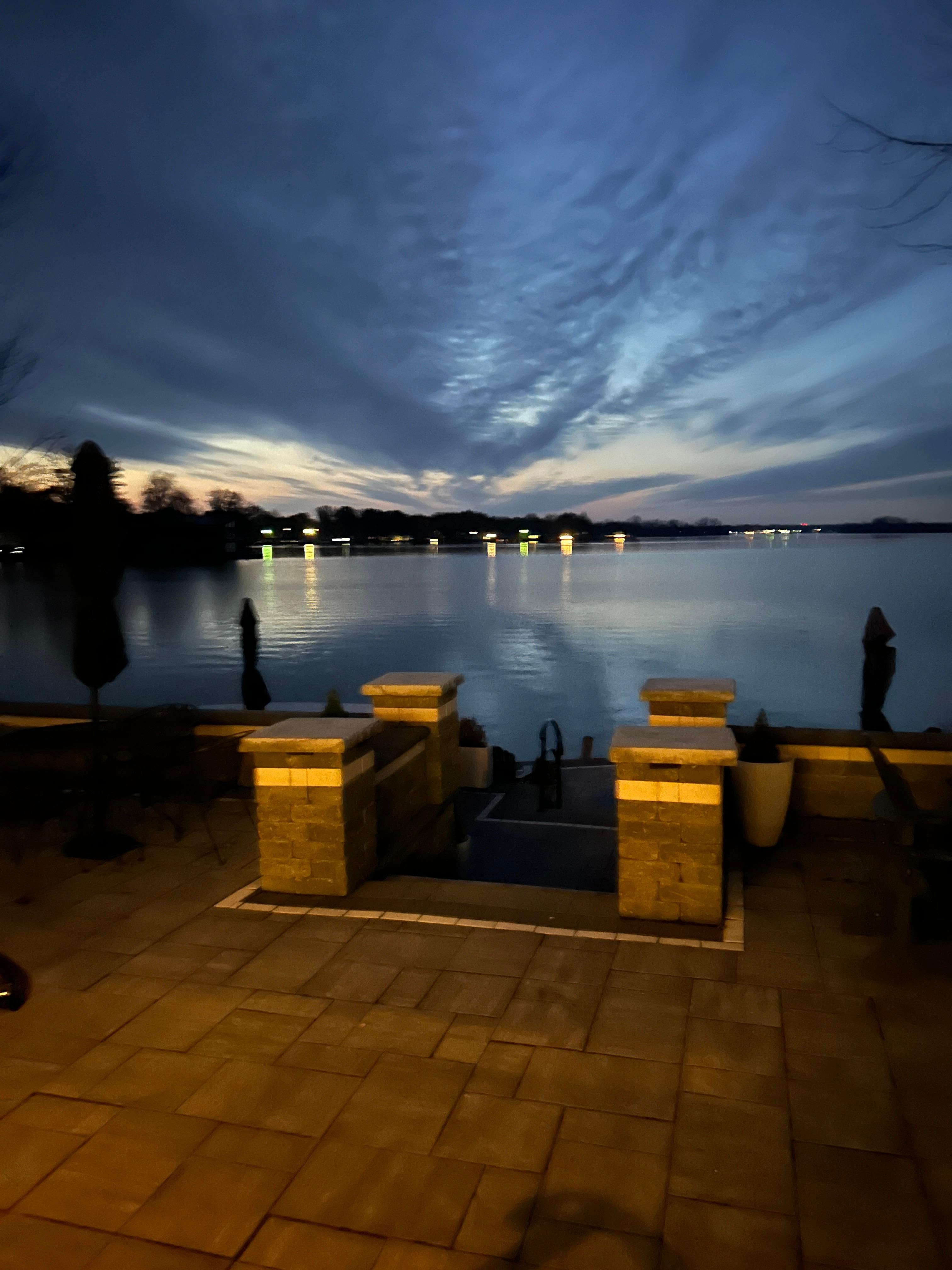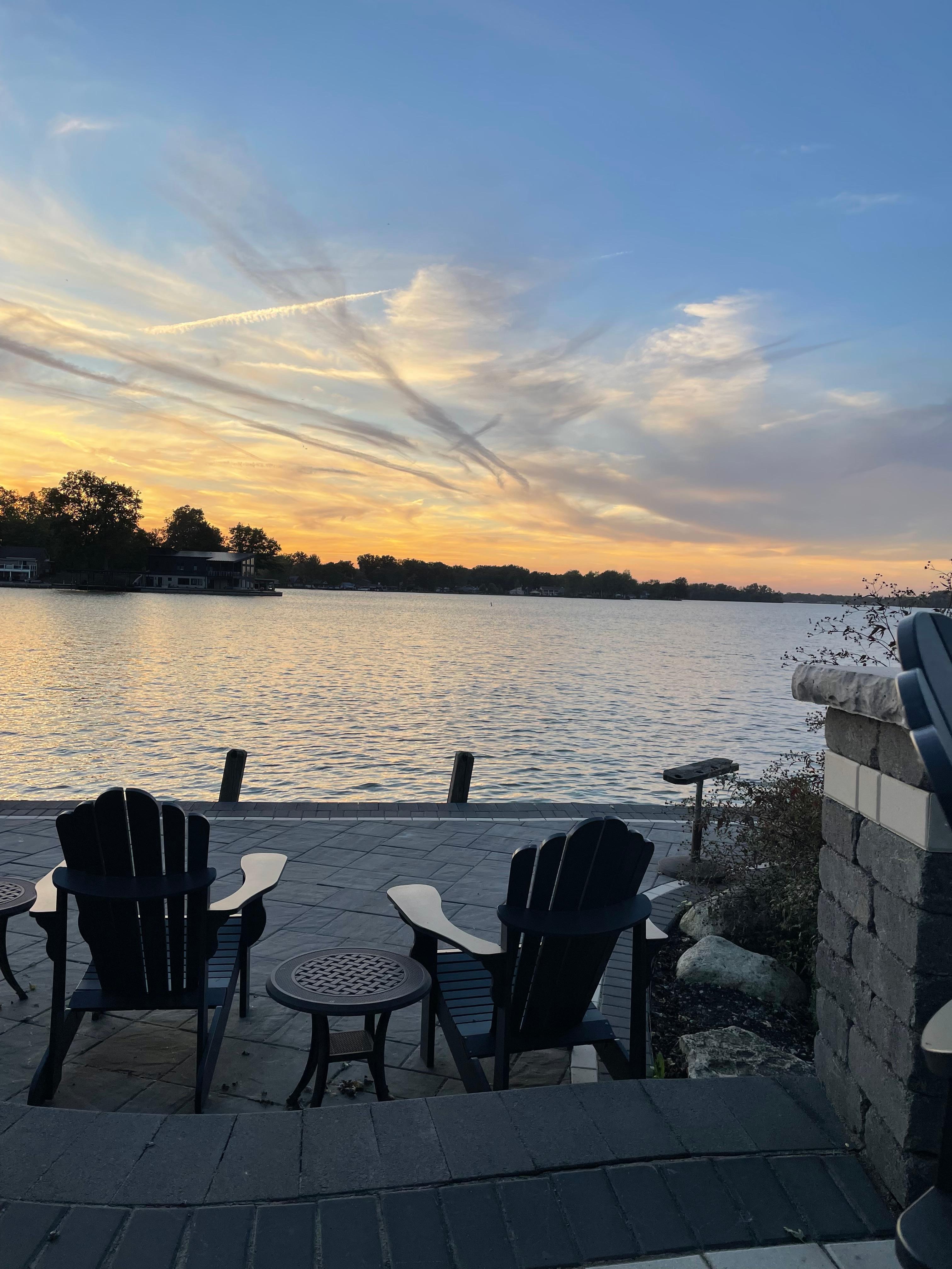 views will be enjoyed from the lakefront covered porch and sunny patio. In 2024, this patio was completely replaced, and now has 4 levels of lake views via the porch, the dining and gathering level, the bar and fire pit level, and then the lakeside level for water’s edge seating. You’re really going to love it.