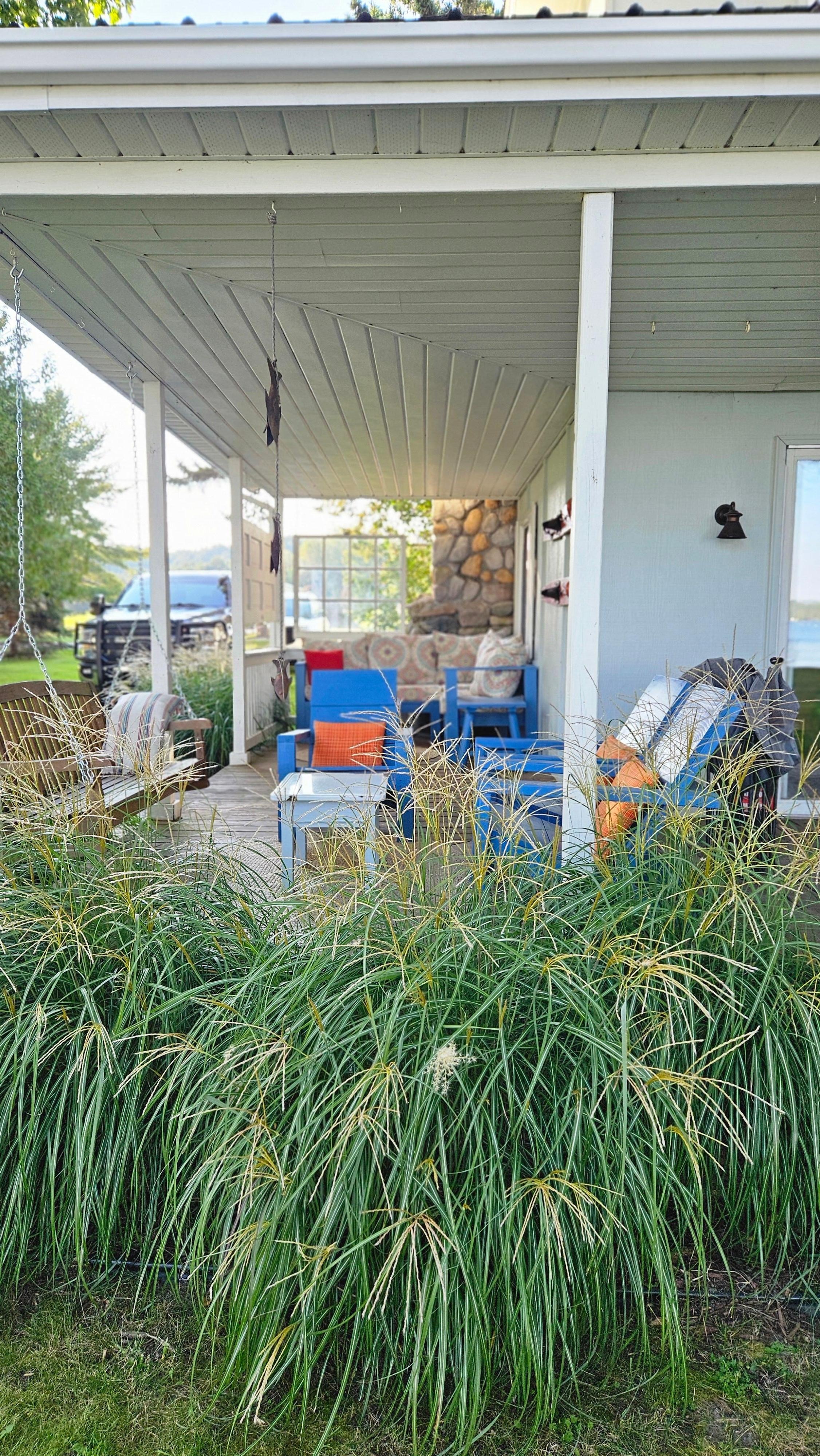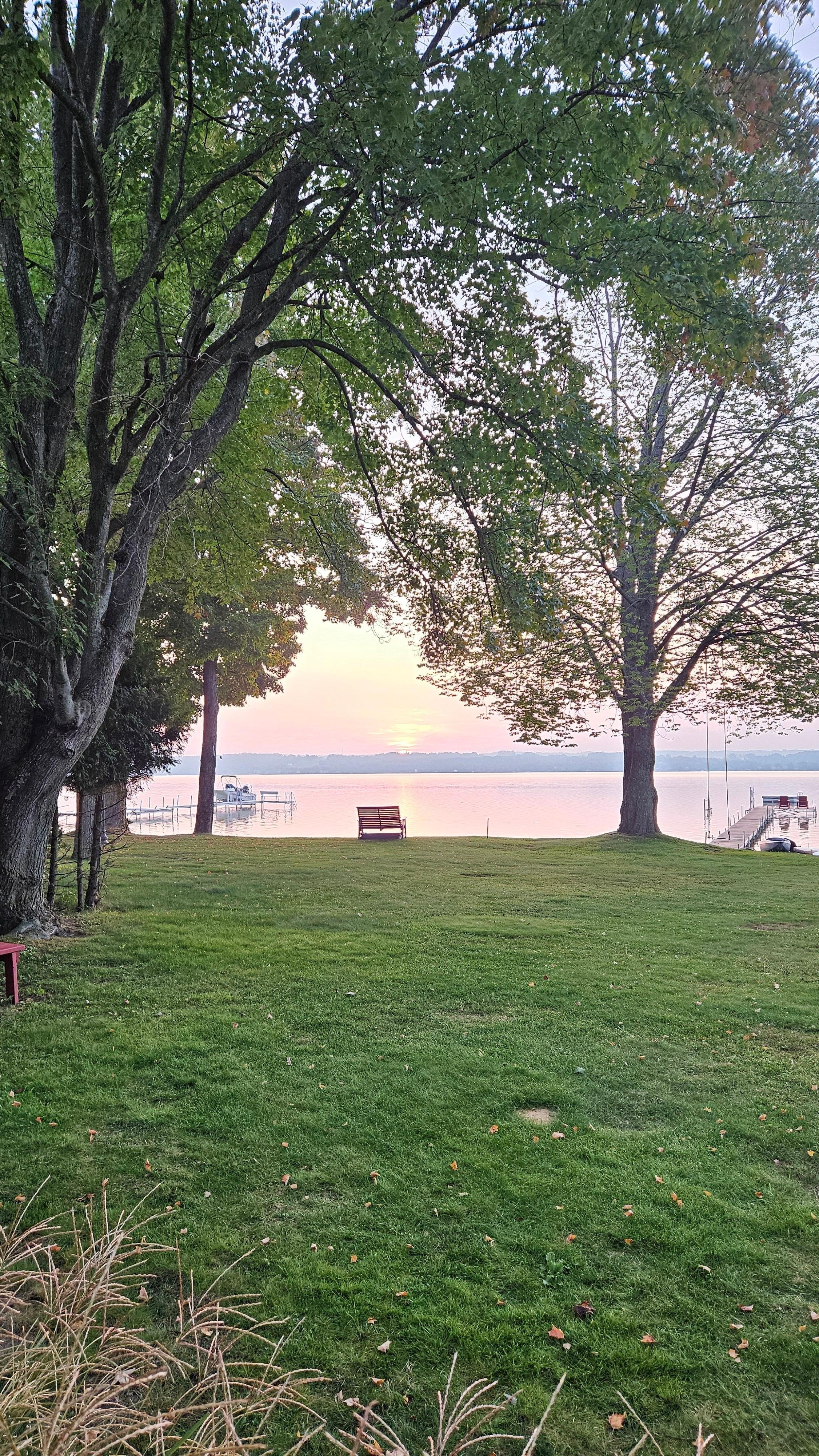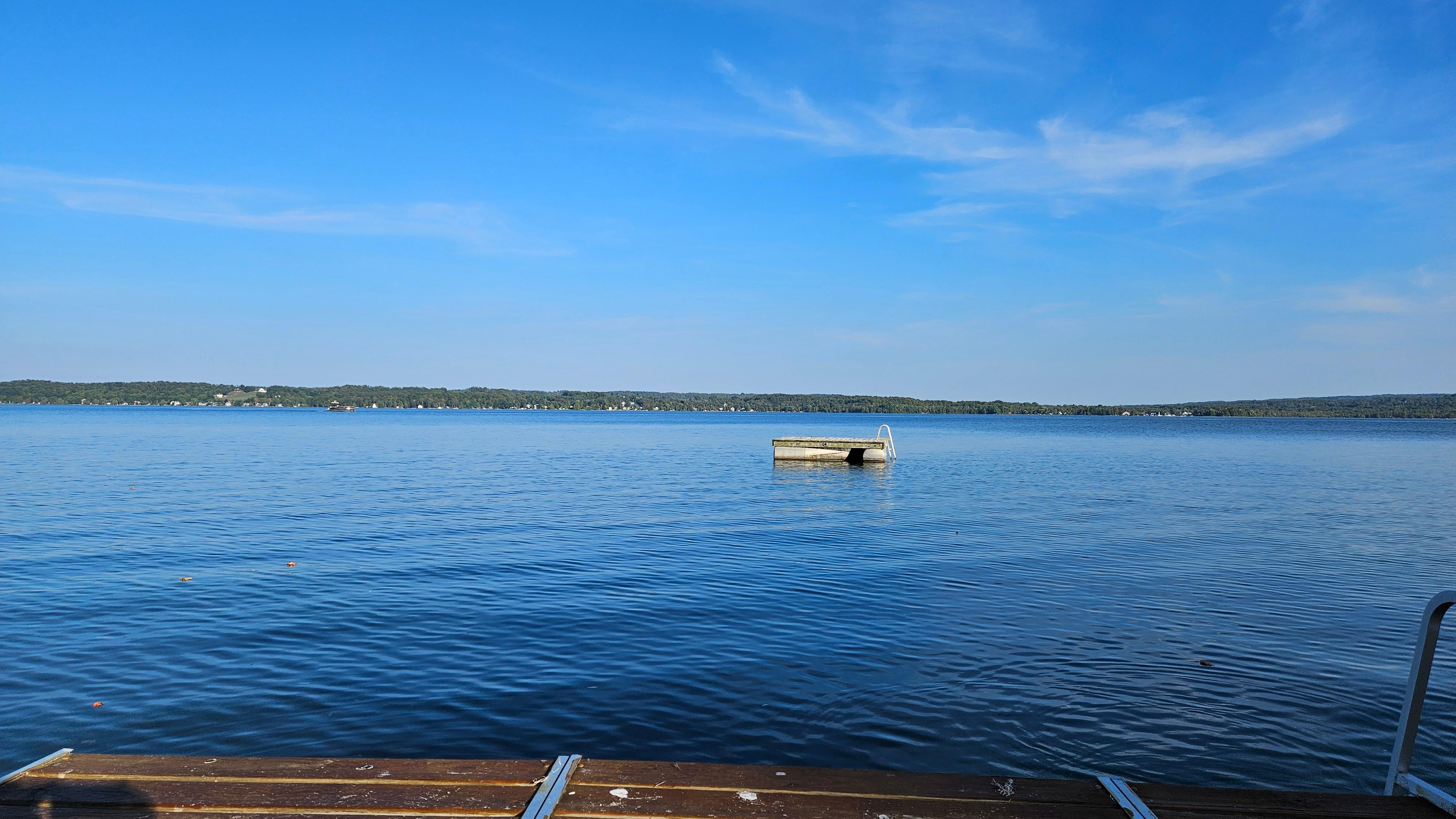 The cottage is directly on the lake (there is no road between the cottage and the lake) and the water is about 80 feet from the cottage. Large trees at the water's edge provide cool shade on summer days. The lake bottom is sandy, with a very gradual drop off (about three-feet deep at 100 feet from shore). The shoreline is grass up to water's edge.