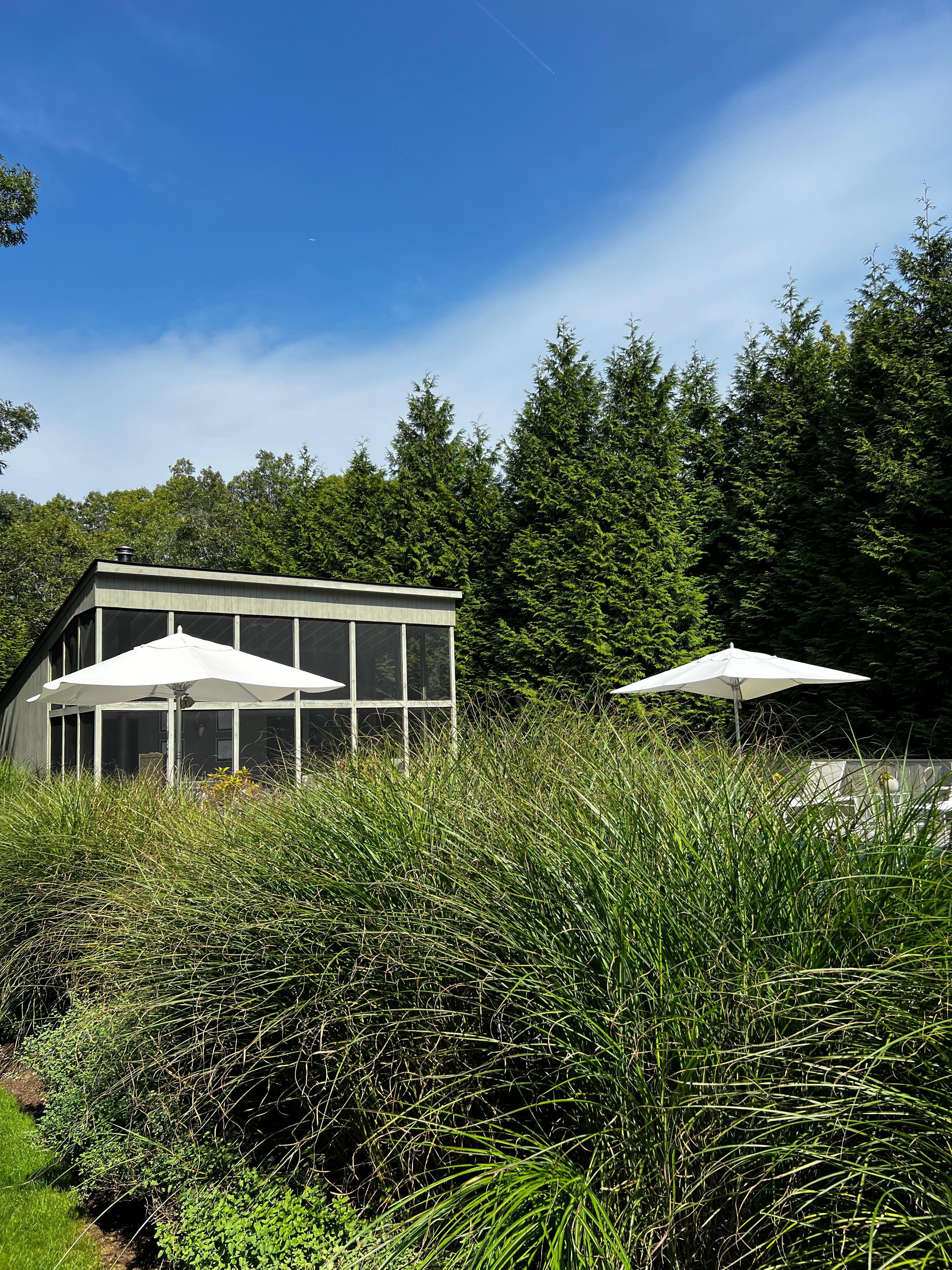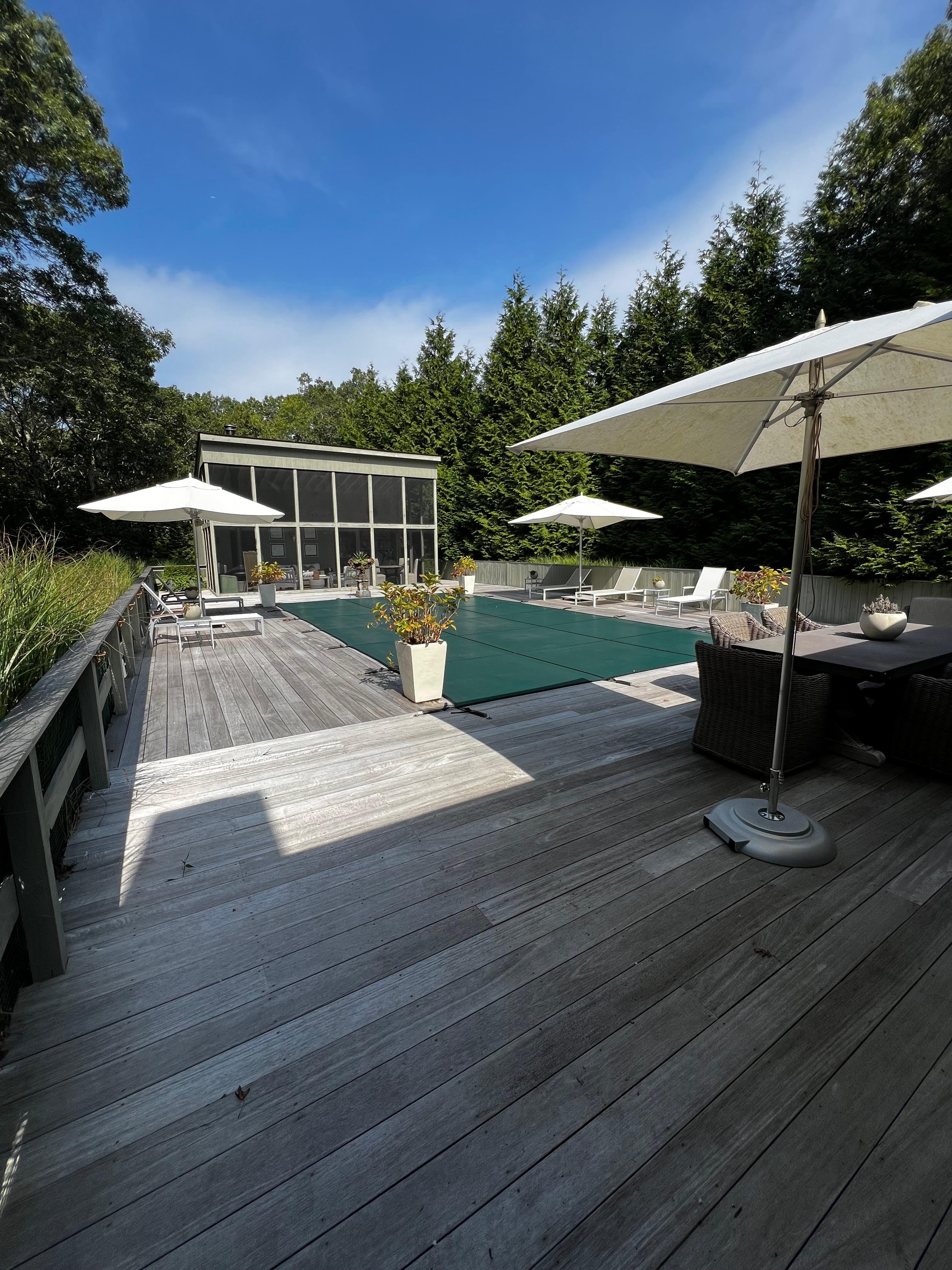 Situated off of a quiet acre of land, this updated, modern residence offers a peaceful and quiet Hamptons getaway. The designer home is the perfect getaway for golf enthusiasts and for those who wish to relax by the pool, ocean or visit town. The residence includes 5 bedrooms and 4 new bathrooms, central air conditioning ( In main bedrooms ), an updated kitchen, heated pool, and outdoor shower. The generous living area is a lovely refuge, with natural hard wood floors. With peace and relaxation in mind, the living room's glass french doors opens to the large private yard w White Hydrangeas, French Lavender and Crepe Myrtle Trees. Surrounded by an amazing deck enjoy the deep 30'-foot heated pool all summer long. An outdoor dining table can comfortably seat 8 people. A convenient washer and dryer combo is in the laundry area. The master bedroom easily fits the king size bed, and has an en-suite bathroom with a tub/shower. Additionally The pool house screened porch living room overlooks the pool and the yard. It is NOT GLASS, the outside structure are screens.
