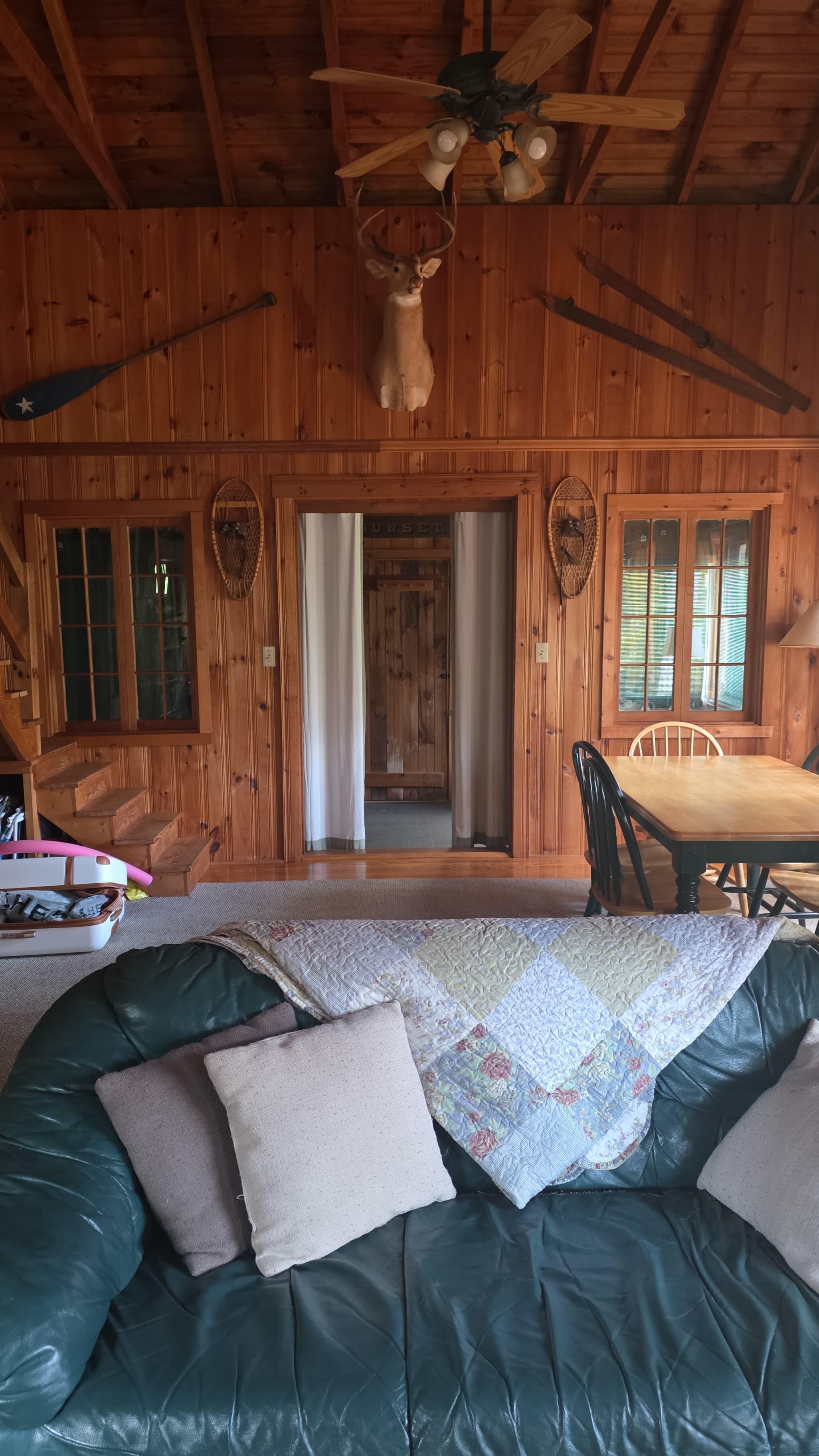 Though the outside of the cottage is deceptively small, the inside is quite spacious, with plenty of light, natural pine woodwork, an open cathedral ceiling and loft area, a fireplace, screened sun room, and the obligatory deer head. If you're looking for "lodgey," you've found the right place!