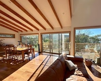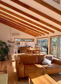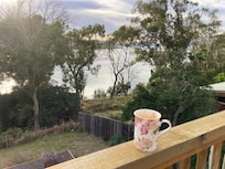 The house is a contemporary, spacious design completed in mid 2018. The house features lots of cosy, vintage furniture, a wood heater for toasty fires and a spacious balcony off the kitchen and living area. There are big picture windows upstairs and in each of the queen bedrooms, which look right out to the water and surrounding hills.