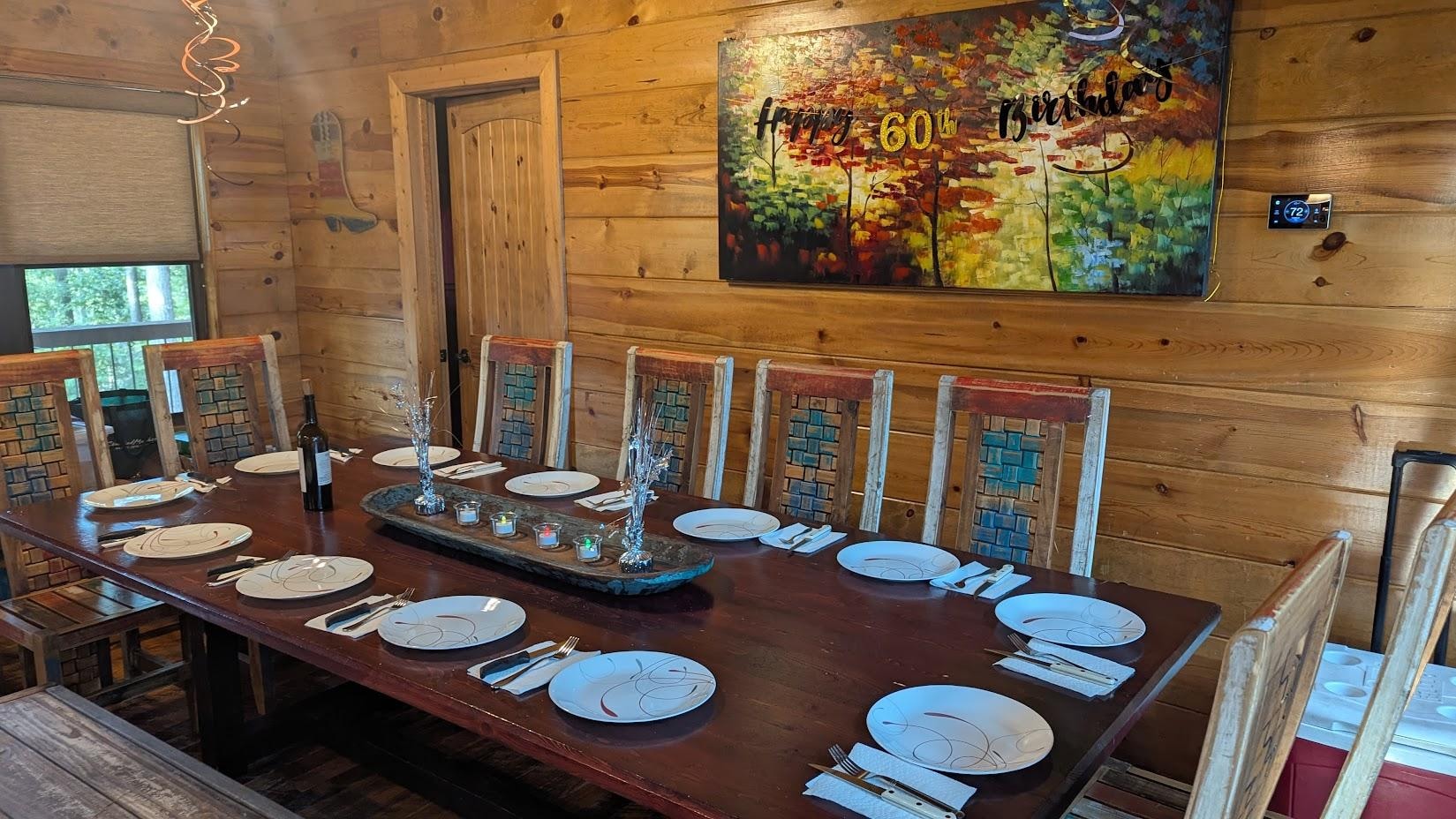The kitchen, equipped with a full range of appliances and cookware, is a chef's delight. It boasts an electric range and a convenient under-counter icemaker. The kitchen's granite bar, accommodating 6 people, complements the adjoining formal dining area, where a custom-carved table seats 12, making it perfect for large gatherings or intimate dinners. The thoughtful design of this space combines functionality with elegance, all while maintaining a sense of togetherness, making it an integral part of the cabin experience.